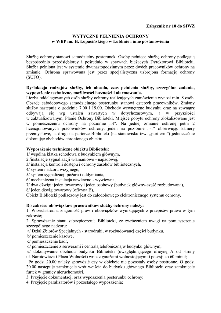 Załącznik nr 10 do SIWZ WYTYCZNE PEŁNIENIA OCHRONY w WBP im. H. Łopacińskiego w Lublinie i inne postanowienia SłuŜbę ochrony stanowi samodzielny posterunek. Osoby pełniące słuŜbę ochrony podlegają bezpośrednio przedsiębiorcy i pośrednio w sprawach bieŜących Dyrektorowi Biblioteki. SłuŜba pełniona jest w systemie dwunastogodzinnym przez dwóch pracowników ochrony na zmianie. Ochrona sprawowana jest przez specjalistyczną uzbrojoną formację ochrony (SUFO). Dyslokacja rodzajów słuŜby, ich obsada, czas pełnienia słuŜby, szczególne zadania, wyposaŜenie techniczne, moŜliwości łączności i alarmowania. Liczba oddelegowanych osób słuŜby ochrony realizujących zamówienie wynosi min. 8 osób. Obsadę całodobowego samodzielnego posterunku stanowi czterech pracowników. Zmiany słuŜby następują o godzinie 7.00 i 19.00. Obchody wewnętrzne budynku oraz na zewnątrz odbywają się wg ustaleń zawartych w dotychczasowym, a w przyszłości w zaktualizowanym, Planie Ochrony Biblioteki. Miejsce pobytu ochrony zlokalizowane jest w pomieszczeniu ochrony na poziomie „-l". Na jednej zmianie ochronę pełni 2 licencjonowanych pracowników ochrony: jeden na poziomie „-1" obserwując kamery przemysłowe, a drugi na parterze Biblioteki (na stanowisku tzw. „portierni”) jednocześnie dokonując obchodów chronionego obiektu. WyposaŜenie techniczne obiektu Biblioteki: 1/ wspólna klatka schodowa z budynkiem głównym, 2 /instalacje sygnalizacji włamaniowo - napadowej, 3/ instalacja kontroli dostępu i ochrony zasobów bibliotecznych, 4/ system nadzoru wizyjnego, 5/ system sygnalizacji poŜaru i oddymiania, 6/ mechaniczna instalacja nawiewno - wywiewna, 7/ dwa dźwigi: jeden towarowy i jeden osobowy (budynek główny-część rozbudowana), 8/ jeden dźwig towarowy (oficyna B), Obiekt Biblioteki podłączony jest do całodobowego elektronicznego systemu ochrony. Do zakresu obowiązków pracowników słuŜby ochrony naleŜy: 1. Wszechstronna znajomość praw i obowiązków wynikających z przepisów prawa w tym zakresie; 2. Sprawdzanie stanu zabezpieczenia Biblioteki, ze zwróceniem uwagi na pomieszczenia szczególnego nadzoru: a/ Dział Zbiorów Specjalnych - starodruki, w rozbudowanej części budynku, b/ pomieszczenie kasowe, c/ pomieszczenie kadr, d/ pomieszczenie z serwerami i centralą telefoniczną w budynku głównym, e/ dokonywanie obchodu budynku Biblioteki (uwzględniającego oficynę A od strony ul. Narutowicza i Placu Wolności) wraz z garaŜami wolnostojącymi i posesji co 60 minut; Po godz. 20.00 naleŜy sprawdzić czy w obiekcie nie pozostały osoby postronne. O godz. 20.00 następuje zamknięcie wrót wejścia do budynku głównego Biblioteki oraz zamknięcie furtek w granicy nieruchomości. 3. Przyjęcie dokumentacji oraz wyposaŜenia posterunku ochrony; 4. Przyjęcie paralizatorów i pozostałego wyposaŜenia; 5. Zwrócenie szczególnej uwagi na osoby, które swoim zachowaniem wzbudzają podejrzenie; (Wstęp przebywanie w pomieszczeniach ogólnodostępnych Biblioteki w czasie godzin pracy odbywa się bez przepustek (identyfikatorów); 6. Powiadomienie w razie konieczności Policji, StraŜy PoŜarnej, StraŜy Miejskiej; 7. Prowadzenie na bieŜąco dokumentacji ochrony; 8. Przestrzeganie przepisów przeciwpoŜarowych, instrukcji postępowania w przypadkach nadzwyczajnych, instrukcji obsługi systemów i urządzeń sygnalizacji alarmowej; 9. Wykonywanie innych poleceń przedsiębiorcy i Dyrektora Biblioteki, związanych z ochroną obiektu; 10. W szczególnych przypadkach krótkotrwałe zastępstwo pracownika w szatni na poziomie „-1"; 11. Przestrzeganie regulaminu otwarcia i zamknięcia Biblioteki oraz pobierania i zdawania kluczy. Wydawanie kluczy do pomieszczeń administracyjno-biurowych oraz pomieszczeń szczególnego nadzoru osobom uprawnionym (upowaŜnionym). Prowadzenie KsiąŜki ewidencji kluczy z uwzględnieniem czytelnego wpisania nazwisk osób pobierających i zdających klucze. 12. Przyjmowanie/wydawanie w depozyt od kierowców dokumentów oraz kluczyków od samochodów słuŜbowych; 13. Obsługa panelu instalacji wentylacji mechanicznej, klimatyzatorów oraz sterowaniem (otwieranie/ zamykanie) klapami oddymiającymi; 14. Udzielanie informacji interesantom w sposób grzeczny i kulturalny, kierując ich do właściwych miejsc, osób itp.; 15. Przeprowadzanie szczegółowych obchodów budynku i placu sprawdzając: zamknięcia bramy wjazdowej do garaŜu podziemnego, stan ogrodzenia i budynku, zamknięcia i stan garaŜujących samochodów, zamknięcia wszystkich pomieszczeń, zamknięcia i pomieszczeń szczególnego nadzoru, stan liczebny kluczy, szczelność instalacji wodociągowej (baterie umywalkowe, zawory); 16. Wygaszanie zbędnego oświetlenia lub włączanie oświetlenia nocnego – zewnętrznego (podświetlenie obiektów); 17. Dbanie o prawidłowe parkowanie samochodów na parkingu przed budynkiem głównym Biblioteki, tak aby nie utrudniały bądź nie blokowały przejazdu wozom poŜarniczym i innym słuŜbom w razie potrzeby. Przestrzeganie zasady, Ŝe w części ogrodowej parkingu Biblioteki mogą parkować tylko pojazdy posiadające identyfikatory wystawione przez Bibliotekę, zaś przed budynkiem głównym Biblioteki pojazdy osób korzystających z Biblioteki lub przebywających na terenie Biblioteki w sprawach słuŜbowych. Wobec kierowców samowolnie parkujących samochody na w/ w częściach parkingu stosować przedsięwzięcia dyscyplinujące doprowadzające do usunięcia z tych miejsc samochodów. Stałe Kontrolowanie celu wjazdu i niedopuszczanie do parkowania pojazdów nieuprawnionych. 18. Po opuszczeniu budynku Biblioteki przez pracowników, osoby pełniące słuŜbę ochrony są „gospodarzami budynku", są odpowiedzialni za porządek i bezpieczeństwo całego obiektu. Po godzinach urzędowania w budynku Biblioteki mogą przebywać pracownicy, którzy posiadają pisemne zezwolenie Dyrektora Biblioteki. W sprawach gos
