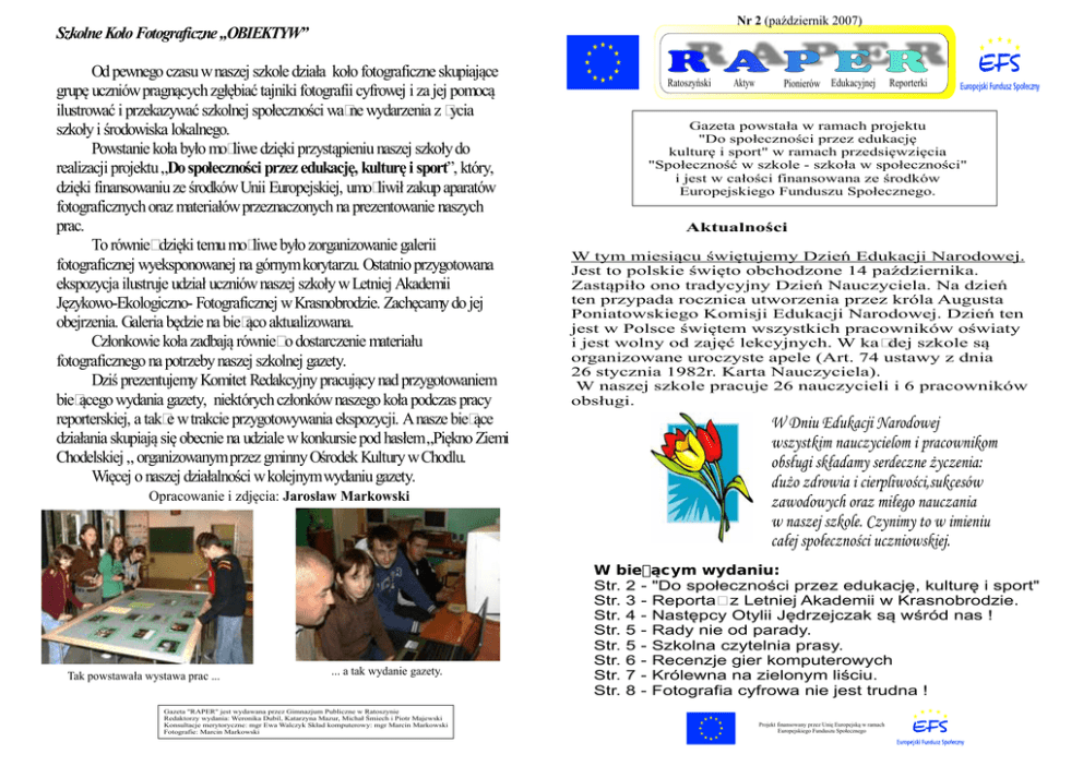 Nr 2 (październik 2007) Szkolne Koło Fotograficzne „OBIEKTYW” Od pewnego czasu w naszej szkole działa koło fotograficzne skupiające grupę uczniów pragnących zgłębiać tajniki fotografii cyfrowej i za jej pomocą ilustrować i przekazywać szkolnej społeczności ważne wydarzenia z życia szkoły i środowiska lokalnego. Powstanie koła było możliwe dzięki przystąpieniu naszej szkoły do realizacji projektu „Do społeczności przez edukację, kulturę i sport”, który, dzięki finansowaniu ze środków Unii Europejskiej, umożliwił zakup aparatów fotograficznych oraz materiałów przeznaczonych na prezentowanie naszych prac. To również dzięki temu możliwe było zorganizowanie galerii fotograficznej wyeksponowanej na górnym korytarzu. Ostatnio przygotowana ekspozycja ilustruje udział uczniów naszej szkoły w Letniej Akademii Językowo-Ekologiczno- Fotograficznej w Krasnobrodzie. Zachęcamy do jej obejrzenia. Galeria będzie na bieżąco aktualizowana. Członkowie koła zadbają również o dostarczenie materiału fotograficznego na potrzeby naszej szkolnej gazety. Dziś prezentujemy Komitet Redakcyjny pracujący nad przygotowaniem bieżącego wydania gazety, niektórych członków naszego koła podczas pracy reporterskiej, a także w trakcie przygotowywania ekspozycji. A nasze bieżące działania skupiają się obecnie na udziale w konkursie pod hasłem „Piękno Ziemi Chodelskiej „ organizowanym przez gminny Ośrodek Kultury w Chodlu. Więcej o naszej działalności w kolejnym wydaniu gazety. Opracowanie i zdjęcia: Jarosław Markowski Tak powstawała wystawa prac ... ... a tak wydanie gazety. Gazeta "RAPER" jest wydawana przez Gimnazjum Publiczne w Ratoszynie Redaktorzy wydania: Weronika Dubil, Katarzyna Mazur, Michał Śmiech i Piotr Majewski Konsultacje merytoryczne: mgr Ewa Walczyk Skład komputerowy: mgr Marcin Markowski Fotografie: Marcin Markowski R A P E R Ratoszyński Aktyw Pionierówj Edukacyjnej Reporterki Gazeta powstała w ramach projektu "Do społeczności przez edukację kulturę i sport" w ramach przedsięwzięcia "Społeczność w szkole - szkoła w społeczności" i jest w całości finansowana ze środków Europejskiego Funduszu Społecznego. Aktualności W tym miesiącu świętujemy Dzień Edukacji Narodowej. Jest to polskie święto obchodzone 14 października. Zastąpiło ono tradycyjny Dzień Nauczyciela. Na dzień ten przypada rocznica utworzenia przez króla Augusta Poniatowskiego Komisji Edukacji Narodowej. Dzień ten jest w Polsce świętem wszystkich pracowników oświaty i jest wolny od zajęć lekcyjnych. W każdej szkole są organizowane uroczyste apele (Art. 74 ustawy z dnia 26 stycznia 1982r. Karta Nauczyciela). W naszej szkole pracuje 26 nauczycieli i 6 pracowników obsługi. W Dniu Edukacji Narodowej wszystkim nauczycielom i pracownikom obsługi składamy serdeczne życzenia: dużo zdrowia i cierpliwości,sukcesów zawodowych oraz miłego nauczania w naszej szkole. Czynimy to w imieniu całej społeczności uczniowskiej. W bieżącym wydaniu: Str. 2 - "Do społeczności przez edukację, kulturę i sport" Str. 3 - Reportaż z Letniej Akademii w Krasnobrodzie. Str. 4 - Następcy Otylii Jędrzejczak są wśród nas ! Str. 5 - Rady nie od parady. Str. 5 - Szkolna czytelnia prasy. Str. 6 - Recenzje gier komputerowych Str. 7 - Królewna na zielonym liściu. Str. 8 - Fotografia cyfrowa nie jest trudna ! Projekt finansowany przez Unię Europejską w ramach Europejskiego Funduszu Społecznego Z dużą satysfakcją informujemy, że NASZA SZKOŁA z powodzeniem wzięła udział w konkursie na projekty rozwojowe dla szkół z gmin wiejskich Lubelszczyzny. Konkurs został zorganizowany w ramach projektu „Społeczność w szkole szkoła w społeczności” ? Polskie Stowarzyszenie Pedagogów i Animatorów KLANZA, przez: ? Forum Lubelskich Organizacji Pozarządowych FLOP ? Stowarzyszenie Lubelski Ośrodek Samopomocy LOS Do konkursu przystąpiło 171 szkół z obszaru Województwa Lubelskiego. Projekt opracowany w NASZEJ SZKOLE „DO SPOŁECZNOŚCI PRZEZ EDUKACJĘ KULTURĘ I SPORT” okazał się tak atrakcyjny, że został sklasyfikowany na bardzo wysokim 5 miejscu spośród projektów wszystkich szkół przystępujących do konkursu. 1.CHARAKTERYSTYKA PROJEKTU Głównym założeniem projektu „ Do społeczeństwa poprzez edukację, kulturę i sport ” jest podjęcie działań, które przyczynią się do wyrównania szans edukacyjnych i zniwelowania dysproporcji między młodzieżą wiejską a miejską w dostępie do kultury, techniki i technologii informatycznej. Przewidziane zamierzenia zostały podzielone na trzy obszary: edukacja, kultura i sport. W każdym z tych obszarów zaplanowano zajęcia, które ze względu na ich niedostępność dla naszych uczniów w codziennych realiach, pozwolą na zmniejszenie dysproporcji w stosunku do młodzieży miejskiej. W zakresie edukacji zaplanowano: warsztaty konwersacyjne z języka angielskiego „Język angielski szansą na sukces ”, gdyż poza standardowymi lekcjami uczniowie nie mają możliwości poszerzania swoich sprawności w tym zakresie. Zajęcia z grafiki „Grafika szansą na atrakcyjną pracę ” oraz komputerowej obróbki zdjęć cyfrowych „Fotografia cyfrowe spojrzenie na świat ”, gdyż większość uczniów nie posiada własnych komputerów ani aparatów fotograficznych i nie jest w stanie docenić ich możliwości. Warsztaty reporterskie poświęcone nabywaniu umiejętności w zakresie fotografii cyfrowej. Wyjazd na „Letnią Akademię jezykowo-ekologiczno-fotograficzną”, który, oprócz zajęć warsztatowych, będzie dla uczniów jedyną szansą na jakikolwiek wyjazd, na który w normalnych warunkach ich nie stać. W dziedzinie kultury zaplanowano: działanie pod nazwą „Przygoda z plastyką i teatrem ”, jest to połączenie warsztatowych zajęć plastyczno-rękodzielniczych z cyklem wyjazdów do teatru, do którego na co dzień nasza młodzież nie ma do