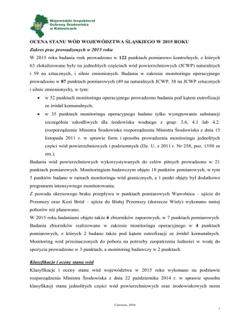 OCENA STANU WÓD WOJEWÓDZTWA ŚLĄSKIEGO W 2015 ROKU Zakres prac prowadzonych w 2015 roku W 2015 roku badania rzek prowadzono w 122 punktach pomiarowo kontrolnych, z których 63 zlokalizowane były na jednolitych częściach wód powierzchniowych (JCWP) naturalnych i 59 na sztucznych, i silnie zmienionych. Badania w zakresie monitoringu operacyjnego prowadzono w 87 punktach pomiarowych (49 na naturalnych JCWP, 38 na JCWP sztucznych i silnie zmienionych), w tym: w 52 punktach monitoringu operacyjnego prowadzono badania pod kątem eutrofizacji ze źródeł komunalnych, w 35 punktach monitoringu operacyjnego badano tylko występowanie substancji szczególnie szkodliwych dla środowiska wodnego z grup: 3.6, 4.1 lub 4.2. (rozporządzenie Ministra Środowiska rozporządzenia Ministra Środowiska z dnia 15 listopada 2011 r. w sprawie form i sposobu prowadzenia monitoringu jednolitych części wód powierzchniowych i podziemnych (Dz. U. z 2011 r. Nr 258, poz. 1550 ze zm.). Badania wód powierzchniowych wykorzystywanych do celów pitnych prowadzono w 21 punktach pomiarowych. Monitoringiem badawczym objęto 18 punktów pomiarowych, w tym 5 punktów badano w ramach monitoringu wód granicznych, a 1 punkt objęty był dodatkowo programem intensywnego monitorowania. Z powodu okresowego braku przepływu w punktach pomiarowych Wąwolnica – ujście do Przemszy oraz Kozi Bród – ujście do Białej Przemszy (dorzecze Wisły) wykonano mniej poborów niż planowano. W 2015 roku badaniami objęto także 6 zbiorników zaporowych, w 7 punktach pomiarowych. Badania zbiorników realizowano w zakresie monitoringu operacyjnego w 4 punktach pomiarowych, z których 2 badano także pod kątem eutrofizacji ze źródeł komunalnych. Monitoring wód przeznaczonych do poboru na potrzeby zaopatrzenia ludności w wodę do spożycia prowadzono w 3 punktach, a monitoring badawczy w 2 punktach. Klasyfikacje i oceny stanu wód Klasyfikacje i oceny stanu wód województwa w 2015 roku wykonano na podstawie rozporządzenia Ministra Środowiska z dnia 22 października 2014 r. w sprawie sposobu klasyfikacji stanu jednolitych części wód powierzchniowych oraz środowiskowych norm Czerwiec, 2016 1 jakości dla substancji priorytetowych (Dz.U. 2014 poz. 1482) oraz wytycznych Głównego Inspektoratu Ochrony Środowiska. Oceny jednolitych części wód powierzchniowych, obejmujące rzeki i zbiorniki zaporowe, za 2015 rok, wykonano na podstawie zweryfikowanego zbioru danych. W 2015 roku, w 4 punktach pomiarowych rzek, zlokalizowanych w dorzeczu Wisły, z oceny wykluczono pojedyncze wyniki znacznie odbiegające od zakresu wartości w dotychczasowym zbiorze danych, w tym w 2 przypadkach związane z wysokimi stanami wód. Ocena wykonana za 2015 rok jest oceną zamykającą drugi cykl gospodarowania wodami obejmujący lata 2010-2015. W okresie tym na terenie województwa śląskiego badania monitoringowe prowadzono w 165 jednolitych częściach wód powierzchniowych, z których w 2 badana była tylko ichtiofauna (badania prowadzone przez Instytut Rybactwa Śródlądowego w Olsztynie), a 1 badano tylko w zakresie monitoringu obszarów chronionych przeznaczonych do poboru wody na potrzeby zaopatrzenia ludności w wodę przeznaczoną do spożycia. W związku z powyższym klasyfikacje i oceny stanu wód wykonano dla 162 JCWP. Badania na potrzeby klasyfikacji stanu/potencjału ekologicznego oraz stanu chemicznego prowadzono w punktach reprezentatywnych do oceny tych stanów, a obszarów chronionych w punktach pomiarowo-kontrolnych zlokalizowanych na tych obszarach. Zgodnie z przyjętymi kryteriami oceną objęto JCWP badane w 2015 roku oraz w latach poprzednich, uwzględniając zasadę dziedziczenia ocen tj. przenoszenia ocen z lat poprzednich: w przypadku monitoringu diagnostycznego oceny wykonane na podstawie tego monitoringu zachowują ważność przez okres 6 lat, w przypadku monitoringu operacyjnego i obszarów chronionych przez okres 3 lat. Corocznie aktualizowano oceny JCWP, w których stwierdzono przekroczenia norm lub występowanie substancji szczególnie szkodliwych dla środowiska wodnego, w tym priorytetowych oraz obszarów chronionych przeznaczonych do poboru wody na potrzeby zaopatrzenia ludności w wodę do spożycia. Klasyfikacjami lub ocenami wchodzącymi w skład oceny stanu wód objęto 162 jednolite części wód powierzchniowych, dla których wykonano: 162 klasyfikacje stanu/potencjału ekologicznego, 58 klasyfikacji stanu chemicznego, 160 ocen obszarów chronionych, Czerwiec, 2016 2 137 ocen stanu wód. Ocenę stanu chemicznego wykonano dla 58 JCWP, w których badane były substancje priorytetowe, w tym 37 JCWP objętych programem monitoringu diagnostycznego oraz 21 JCWP, w których stwierdzono występowanie lub emisję tych substancji. Ocenę obszarów chronionych wykonano dla 160 JCWP występujących na tych obszarach. Spośród 162 JCWP objętych klasyfikacją stanu/potencjału ekologicznego, wykonanie oceny stanu wód było możliwe dla 137 JCWP, występujących także na obszarach chronionych. Wykonanie oceny nie było możliwe w przypadku 25 JCWP, gdzie wystąpił dobry lub powyżej dobrego stan/potencjał ekologiczny, nie był badany stan chemiczny, a wymagania dodatkowe dla obszarów chronionych były spełnione. Wyniki oceny w układzie dorzeczy przedstawiono w tabeli 1 Stan jednolitych części wód powierzchniowych oceniono poprzez porównanie wyników klasyfikacji stanu ekologicznego lub potencjału ekologicznego i stanu chemicznego wykonanych na podstawie badań prowadzonych w reprezentatywnym punkcie pomiarowokontrolnym. W przypadku występowania jednolitej część wód na obszarze chronionym ocena stanu wód uwzględnia także spełnianie wymogów dodatkowych określonych dla tych obszarów. Wody mają dobry stan, jeżeli mają dobry lub powyżej dobrego stan/potencjał ekologiczny i dobry stan chemiczny oraz w przypadku występowania na obszarze chronionym są spełnione wymagania dodatkowe określone