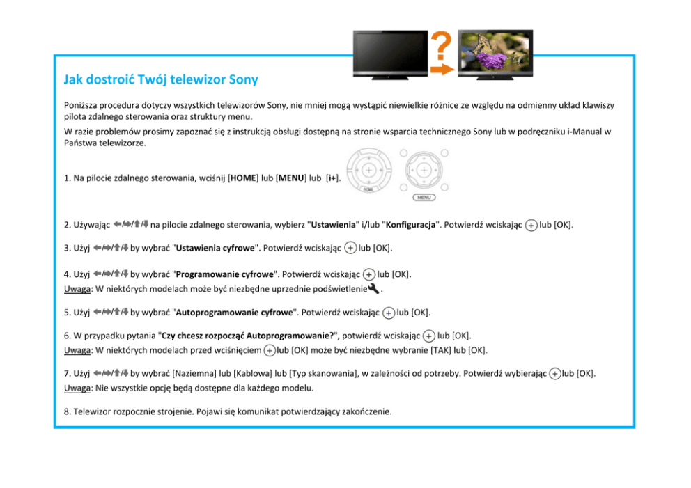 Jak dostroić Twój telewizor Sony Poniższa procedura dotyczy wszystkich telewizorów Sony, nie mniej mogą wystąpić niewielkie różnice ze względu na odmienny układ klawiszy pilota zdalnego sterowania oraz struktury menu. W razie problemów prosimy zapoznać się z instrukcją obsługi dostępną na stronie wsparcia technicznego Sony lub w podręczniku i‐Manual w Państwa telewizorze. 1. Na pilocie zdalnego sterowania, wciśnij [HOME] lub [MENU] lub [i+]. 2. Używając na pilocie zdalnego sterowania, wybierz "Ustawienia" i/lub "Konfiguracja". Potwierdź wciskając lub [OK]. 3. Użyj by wybrać "Ustawienia cyfrowe". Potwierdź wciskając lub [OK]. 4. Użyj by wybrać "Programowanie cyfrowe". Potwierdź wciskając lub [OK]. Uwaga: W niektórych modelach może być niezbędne uprzednie podświetlenie . 5. Użyj by wybrać "Autoprogramowanie cyfrowe". Potwierdź wciskając lub [OK]. 6. W przypadku pytania "Czy chcesz rozpocząć Autoprogramowanie?", potwierdź wciskając lub [OK]. Uwaga: W niektórych modelach przed wciśnięciem lub [OK] może być niezbędne wybranie [TAK] lub [OK]. 7. Użyj by wybrać [Naziemna] lub [Kablowa] lub [Typ skanowania], w zależności od potrzeby. Potwierdź wybierając lub [OK]. Uwaga: Nie wszystkie opcję będą dostępne dla każdego modelu. 8. Telewizor rozpocznie strojenie. Pojawi się komunikat potwierdzający zakończenie.