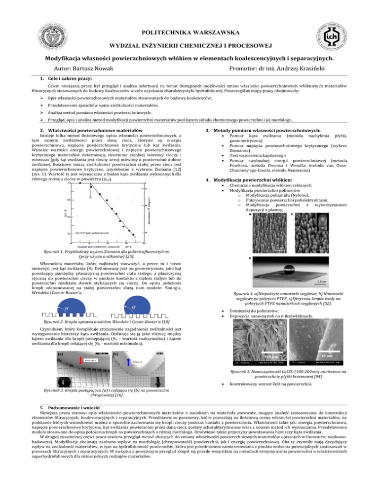 POLITECHNIKA WARSZAWSKA WYDZIAŁ INŻYNIERII CHEMICZNEJ I PROCESOWEJ Modyfikacja własności powierzchniowych włókien w elementach koalescencyjnych i separacyjnych. Autor: Bartosz Nowak Promotor: dr inż. Andrzej Krasiński 1. Cele i zakres pracy: Celem niniejszej pracy był przegląd i analiza informacji na temat dostępnych możliwości zmian własności powierzchniowych włóknistych materiałów filtracyjnych stosowanych do budowy koalescerów w celu uzyskania charakterystyki hydrofobowej. Poszczególne etapy pracy obejmowały: Opis własności powierzchniowych materiałów stosowanych do budowy koalescerów; Przedstawienie sposobów opisu zwilżalności materiałów; Analiza metod pomiaru własności powierzchniowych; Przegląd, opis i analiza metod modyfikacji powierzchni materiałów pod kątem składu chemicznego powierzchni i jej morfologii. 2. Właściwości powierzchniowe materiałów Istnieje kilka metod ilościowego opisu własności powierzchniowych, a tym samym zwilżalności przez daną ciecz, którymi są energia powierzchniowa, napięcie powierzchniowe krytyczne lub kąt zwilżania. Wysokie wartości energii powierzchniowej i napięcia powierzchniowego krytycznego materiałów determinują tworzenie cienkiej warstwy cieczy i wówczas (gdy kąt zwilżania jest równy zero) mówimy o powierzchni dobrze zwilżanej. Ilościowo miarą zwilżalności powierzchni stałej przez ciecz jest napięcie powierzchniowe krytyczne, uzyskiwane z wykresu Zismana [12] (rys. 1). Wartość ta jest wyznaczana z badań kąta zwilżania wykonanych dla różnego rodzaju cieczy w powietrzu (γLG). 3. Metody pomiaru własności powierzchniowych: Pomiar kąta zwilżania (metoda nachylenia płytki, goniometryczna) Pomiar napięcia powierzchniowego krytycznego (wykres Zismanna) Test wzniesienia kapilarnego Pomiar swobodnej energii powierzchniowej (metoda Fowkesa, metoda Owensa i Wendta, metoda van OssaChauhury’ego-Gooda, metoda Neumanna) 4. Modyfikacja powierzchni włókien: Chemiczna modyfikacja włókien szklanych Modyfikacja powierzchni polimerów o Modyfikacja poliamidu (Nylonu); o Pokrywanie powierzchni polielektrolitami; o Modyfikacja powierzchni z wykorzystaniem depozycji z plazmy; Rysunek 1. Przykładowy wykres Zismana dla politetrafluoroetylenu (przy użyciu n-alkanów) [25]. Własnością materiału, którą najłatwiej zauważyć, a przez to i łatwo zmierzyć, jest kąt zwilżania (θ). Definiowany jest on geometrycznie, jako kąt powstający pomiędzy płaszczyzną powierzchni ciała stałego, a płaszczyzną styczną do powierzchni cieczy w punkcie kontaktu z ciałem stałym lub do powierzchni rozdziału dwóch stykających się cieczy. Do opisu położenia kropli zdeponowanej na stałej powierzchni służą nam modele: Young’a, Wendela i Cassie-Baxter’a. Rysunek 4. a)Niepokryte nanorurki węglowe, b) Nanorurki węglowe po pokryciu PTFE, c)Sferyczna kropla wody na pokrytych PTFE nanorurkach węglowych [52]. Domieszki do polimerów; Depozycja nanocząstek na mikrówłóknach; Rysunek 2. Kropla opisana modelem Wendela i Cassie-Baxter’a [18] Czynnikiem, który komplikuje zrozumienie zagadnienia zwilżalności jest występowanie histerezy kąta zwilżania. Definiuje się ją jako różnicę między kątem zwilżania dla kropli postępującej (θA – wartość maksymalna) i kątem zwilżania dla kropli cofającej się (θR - wartość minimalna). Rysunek 5. Nanocząeteczki CaCO3 (100-200nm) naniesione na powierzchnię płytki krzemowej [54] Kontrolowany wzrost ZnO na powierzchni. Rysunek 3. Kropla postępująca (a) i cofająca się (b) na powierzchni chropowatej [16] 5. Podsumowanie i wnioski Niniejsza praca stanowi opis właściwości powierzchniowych materiałów z naciskiem na materiały porowate, mogące znaleźć zastosowania do konstrukcji elementów filtracyjnych, koalescencyjnych i separacyjnych. Przedstawiono parametry, które pozwalają na ilościową ocenę własności powierzchni materiałów, na podstawie których wnioskować można o sposobie zachowania się kropli cieczy podczas kontakt z powierzchnia. Właściwości takie jak: energia powierzchniowa, napięcie powierzchniowe krytyczne, kąt zwilżania powierzchni przez daną ciecz, zostały scharakteryzowane wraz z opisem metod ich wyznaczania. Przedstawiono modele stosowane do opisu położenia kropli na powierzchniach o różnej morfologii. Omówiono także przyczyny powstawania histerezy kąta zwilżania. W drugiej zasadniczej części praca zawiera przegląd metod służących do zmiany właściwości powierzchniowych materiałów opisanych w literaturze naukowobadawczej. Modyfikacje obejmują zarówno wpływ na morfologię (chropowatość) powierzchni, jak i energię powierzchniową. Oba te czynniki mają decydujący wpływ na zwilżalność materiałów, w tym na hydrofobowość powierzchni, która jest przedmiotem zainteresowania z punktu widzenia potencjalnych zastosowań w procesach filtracyjnych i separacyjnych. W związku z powyższym przegląd skupił się przede wszystkim na metodach otrzymywania powierzchni o właściwościach superhydrofobowych dla różnorodnych rodzajów materiałów.