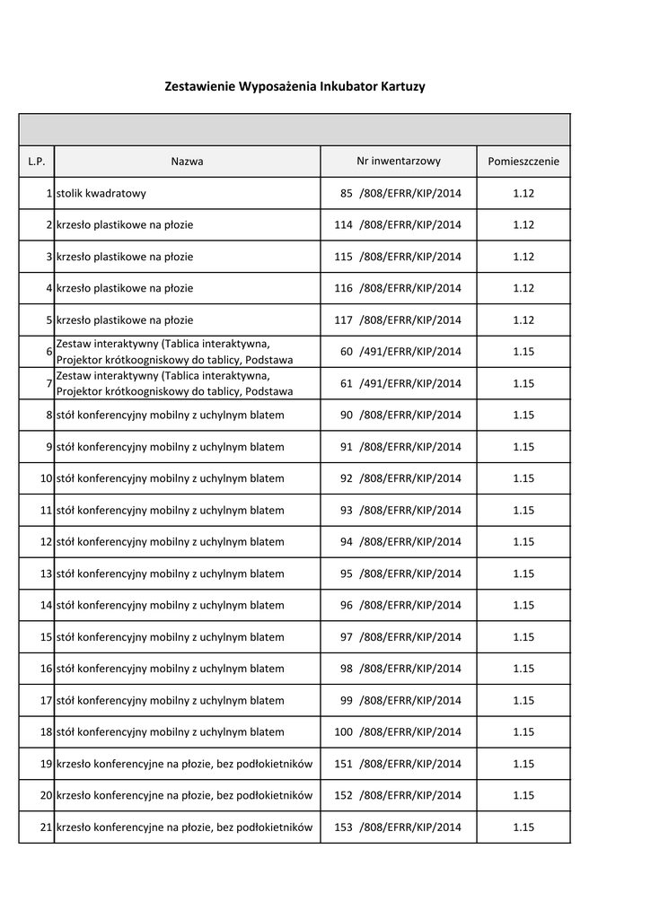 Zestawienie Wyposażenia Inkubator Kartuzy Nr inwentarzowy Pomieszczenie 85 /808/EFRR/KIP/2014 1.12 2 krzesło plastikowe na płozie 114 /808/EFRR/KIP/2014 1.12 3 krzesło plastikowe na płozie 115 /808/EFRR/KIP/2014 1.12 4 krzesło plastikowe na płozie 116 /808/EFRR/KIP/2014 1.12 5 krzesło plastikowe na płozie 117 /808/EFRR/KIP/2014 1.12 60 /491/EFRR/KIP/2014 1.15 61 /491/EFRR/KIP/2014 1.15 8 stół konferencyjny mobilny z uchylnym blatem 90 /808/EFRR/KIP/2014 1.15 9 stół konferencyjny mobilny z uchylnym blatem 91 /808/EFRR/KIP/2014 1.15 10 stół konferencyjny mobilny z uchylnym blatem 92 /808/EFRR/KIP/2014 1.15 11 stół konferencyjny mobilny z uchylnym blatem 93 /808/EFRR/KIP/2014 1.15 12 stół konferencyjny mobilny z uchylnym blatem 94 /808/EFRR/KIP/2014 1.15 13 stół konferencyjny mobilny z uchylnym blatem 95 /808/EFRR/KIP/2014 1.15 14 stół konferencyjny mobilny z uchylnym blatem 96 /808/EFRR/KIP/2014 1.15 15 stół konferencyjny mobilny z uchylnym blatem 97 /808/EFRR/KIP/2014 1.15 16 stół konferencyjny mobilny z uchylnym blatem 98 /808/EFRR/KIP/2014 1.15 17 stół konferencyjny mobilny z uchylnym blatem 99 /808/EFRR/KIP/2014 1.15 18 stół konferencyjny mobilny z uchylnym blatem 100 /808/EFRR/KIP/2014 1.15 19 krzesło konferencyjne na płozie, bez podłokietników 151 /808/EFRR/KIP/2014 1.15 20 krzesło konferencyjne na płozie, bez podłokietników 152 /808/EFRR/KIP/2014 1.15 21 krzesło konferencyjne na płozie, bez podłokietników 153 /808/EFRR/KIP/2014 1.15 L.P. Nazwa 1 stolik kwadratowy Zestaw interaktywny (Tablica interaktywna, Projektor krótkoogniskowy do tablicy, Podstawa Zestaw interaktywny (Tablica interaktywna, 7 Projektor krótkoogniskowy do tablicy, Podstawa 6 22 krzesło konferencyjne na płozie, bez podłokietników 154 /808/EFRR/KIP/2014 1.15 23 krzesło konferencyjne na płozie, bez podłokietników 155 /808/EFRR/KIP/2014 1.15 24 krzesło konferencyjne na płozie, bez podłokietników 156 /808/EFRR/KIP/2014 1.15 25 krzesło konferencyjne na płozie, bez podłokietników 157 /808/EFRR/KIP/2014 1.15 26 krzesło konferencyjne na płozie, bez podłokietników 158 /808/EFRR/KIP/2014 1.15 27 krzesło konferencyjne na płozie, bez podłokietników 159 /808/EFRR/KIP/2014 1.15 28 krzesło konferencyjne na płozie, bez podłokietników 160 /808/EFRR/KIP/2014 1.15 29 krzesło konferencyjne na płozie, bez podłokietników 161 /808/EFRR/KIP/2014 1.15 30 krzesło konferencyjne na płozie, bez podłokietników 162 /808/EFRR/KIP/2014 1.15 31 krzesło konferencyjne na płozie, bez podłokietników 163 /808/EFRR/KIP/2014 1.15 32 krzesło konferencyjne na płozie, bez podłokietników 164 /808/EFRR/KIP/2014 1.15 33 krzesło konferencyjne na płozie, bez podłokietników 165 /808/EFRR/KIP/2014 1.15 34 krzesło konferencyjne na płozie, bez podłokietników 166 /808/EFRR/KIP/2014 1.15 35 krzesło konferencyjne na płozie, bez podłokietników 167 /808/EFRR/KIP/2014 1.15 36 krzesło konferencyjne na płozie, bez podłokietników 168 /808/EFRR/KIP/2014 1.15 37 krzesło konferencyjne na płozie, bez podłokietników 169 /808/EFRR/KIP/2014 1.15 38 krzesło konferencyjne na płozie, bez podłokietników 170 /808/EFRR/KIP/2014 1.15 39 krzesło konferencyjne na płozie, bez podłokietników 171 /808/EFRR/KIP/2014 1.15 40 krzesło konferencyjne na płozie, bez podłokietników 172 /808/EFRR/KIP/2014 1.15 41 krzesło konferencyjne na płozie, bez podłokietników 173 /808/EFRR/KIP/2014 1.15 42 krzesło konferencyjne na płozie, bez podłokietników 174 /808/EFRR/KIP/2014 1.15 43 krzesło konferencyjne na płozie, bez podłokietników 175 /808/EFRR/KIP/2014 1.15 44 krzesło konferencyjne na płozie, bez podłokietników 176 /808/EFRR/KIP/2014 1.15 45 krzesło konferencyjne na płozie, bez podłokietników 177 /808/EFRR/KIP/2014 1.15 46 krzesło konferencyjne na płozie, bez podłokietników 178 /808/EFRR/KIP/2014 1.15 47 krzesło konferencyjne na płozie, bez podłokietników 179 /808/EFRR/KIP/2014 1.15 48 krzesło konferencyjne na płozie, bez podłokietników 180 /808/EFRR/KIP/2014 1.15 49 krzesło konferencyjne na płozie, bez podłokietników 181 /808/EFRR/KIP/2014 1.15 50 krzesło konferencyjne na płozie, bez podłokietników 182 /808/EFRR/KIP/2014 1.15 51 krzesło konferencyjne na płozie, bez podłokietników 183 /808/EFRR/KIP/2014 1.15 52 krzesło konferencyjne na płozie, bez podłokietników 184 /808/EFRR/KIP/2014 1.15 53 krzesło konferencyjne na płozie, bez podłokietników 185 /808/EFRR/KIP/2014 1.15 54 krzesło konferencyjne na płozie, bez podłokietników 186 /808/EFRR/KIP/2014 1.15 55 krzesło konferencyjne na płozie, bez podłokietników 187 /808/EFRR/KIP/2014 1.15 56 krzesło konferencyjne na płozie, bez podłokietników 188 /808/EFRR/KIP/2014 1.15 57 krzesło konferencyjne na płozie, bez podłokietników 189 /808/EFRR/KIP/2014 1.15 58 krzesło konferencyjne na płozie, bez podłokietników 190 /808/EFRR/KIP/2014 1.15 59 krzesło konferencyjne na płozie, bez podłokietników 191 /808/EFRR/KIP/2014 1.15 60 krzesło konferencyjne na płozie, bez podłokietników 192 /808/EFRR/KIP/2014 1.15 61 krzesło konferencyjne na płozie, bez podłokietników 193 /808/EFRR/KIP/2014 1.15 62 krzesło konferencyjne na płozie, bez podłokietników 194 /808/EFRR/KIP/2014 1.15 63 krzesło konferencyjne na płozie, bez podłokietników 195 /808/EFRR/KIP/2014 1.15 64 krzesło konferencyjne na płozie, bez podłokietników 196 /808/EFRR/KIP/2014 1.15 65 krzesło konferencyjne na płozie, bez podłokietników 197 /808/EFRR/KIP/2014 1.15 66 krzesło konferencyjne na płozie, bez podłokietników 198 /808/EFRR/KIP/2014 1.15 67 krzesło konferencyjne na płozie, bez podłokietników 199 /808/EFRR/KIP/2014 1.15 68 szafa 373 /808/EFRR/KIP/2014 1.15 69 szafa 374 /808/EFRR/KIP/2014 1.15 70 szafa 375 /808/EFRR/KIP/2014 1.15 71 szafa 376 /808/EFRR/KIP/2014 1.15 72 szafa 365 /808/EFRR/KIP/2014 1.17 73 Laptop TravelMate P455 20 /491/EFRR/KIP/2014 1.18 74 Laptop TravelMate P455 21 /491/EFRR