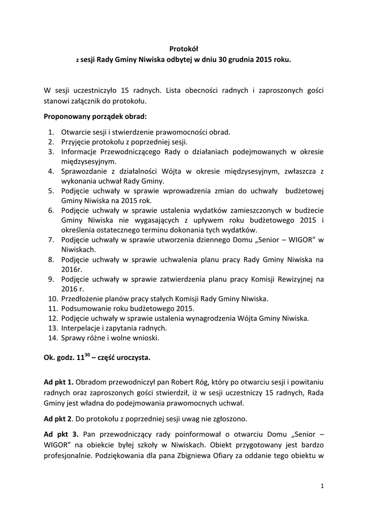 Protokół z sesji Rady Gminy Niwiska odbytej w dniu 30 grudnia 2015 roku. W sesji uczestniczyło 15 radnych. Lista obecności radnych i zaproszonych gości stanowi załącznik do protokołu. Proponowany porządek obrad: 1. Otwarcie sesji i stwierdzenie prawomocności obrad. 2. Przyjęcie protokołu z poprzedniej sesji. 3. Informacje Przewodniczącego Rady o działaniach podejmowanych w okresie międzysesyjnym. 4. Sprawozdanie z działalności Wójta w okresie międzysesyjnym, zwłaszcza z wykonania uchwał Rady Gminy. 5. Podjęcie uchwały w sprawie wprowadzenia zmian do uchwały budżetowej Gminy Niwiska na 2015 rok. 6. Podjęcie uchwały w sprawie ustalenia wydatków zamieszczonych w budżecie Gminy Niwiska nie wygasających z upływem roku budżetowego 2015 i określenia ostatecznego terminu dokonania tych wydatków. 7. Podjęcie uchwały w sprawie utworzenia dziennego Domu „Senior – WIGOR” w Niwiskach. 8. Podjęcie uchwały w sprawie uchwalenia planu pracy Rady Gminy Niwiska na 2016r. 9. Podjęcie uchwały w sprawie zatwierdzenia planu pracy Komisji Rewizyjnej na 2016 r. 10. Przedłożenie planów pracy stałych Komisji Rady Gminy Niwiska. 11. Podsumowanie roku budżetowego 2015. 12. Podjęcie uchwały w sprawie ustalenia wynagrodzenia Wójta Gminy Niwiska. 13. Interpelacje i zapytania radnych. 14. Sprawy różne i wolne wnioski. Ok. godz. 1130 – część uroczysta. Ad pkt 1. Obradom przewodniczył pan Robert Róg, który po otwarciu sesji i powitaniu radnych oraz zaproszonych gości stwierdził, iż w sesji uczestniczy 15 radnych, Rada Gminy jest władna do podejmowania prawomocnych uchwał. Ad pkt 2. Do protokołu z poprzedniej sesji uwag nie zgłoszono. Ad pkt 3. Pan przewodniczący rady poinformował o otwarciu Domu „Senior – WIGOR” na obiekcie byłej szkoły w Niwiskach. Obiekt przygotowany jest bardzo profesjonalnie. Podziękowania dla pana Zbigniewa Ofiary za oddanie tego obiektu w 1 użyczenie. Jest spore zainteresowanie wśród starszych ludzi, którzy będą mogli z niego korzystać Ad pkt 4. Wójt Gminy Elżbieta Wróbel złożyła informację o realizacji zadań w okresie międzysesyjnym od 17 listopada 2015 r. do 30 grudnia 2015 r. „1/ W tym okresie zostało wydane 12 zarządzeń wójta gminy: 6 w sprawie zmian w budżecie, 1 w spr. WPF, 1 w spr. użyczenia remizy dla OSP Trześń, 1 w spr. kontroli w punktach przedszkolnych, 1 w spr. powołania zespołu powypadkowego, 1 w spr. dnia wolnego za Szczepana. 1 w spr. inwentaryzacji kasy, 2/ została zawarta umowa z Eko - Karpatia Rzeszów na opracowanie Planu Gospodarki Niskoemisyjnej dla Gminy Niwiska, tym samym informuję, iż dokument strategiczny który będzie potrzebny do starania się o środki unijne. Będziemy ogłaszać nabór wstępny pod urządzenia fotowoltaiczne na prywatnych posesjach tzw. „projekt parasolowy” min. 100 posesji, przewidujemy ,że instalacja będzie tańsza co nieco od montowanej w 2015r. ( Vat będzie kwalifikowalny – 8%). W tym temacie odbędzie się spotkanie około połowy stycznia w Urzędzie Gminy Niwiska. O terminie będziemy ogłaszać poprzez Parafie, tablice ogłoszeń i stronę Gminy Niwiska. 3/ 25 listopada odbyła się narada sołtysów, główna tematyka dostawa jabłek dla mieszkańców gminy, zimowy turniej sołecki w dniu 7 lutego 2016r. 4/ 10 grudnia spotkanie z rodzicami przedszkolaków w Niwiskach i Przyłęku, 11 grudnia – w GOKiB ( rodzice plus Zarząd Stowarzyszenia Kół Gospodyń Wiejskich Gminy Niwiska ) – tematyka główna złożenie wniosku na konkurs - PUM w osi priorytetowej IX Jakość edukacji i kompetencji w regionie , działanie 9.1 Rozwój edukacji przedszkolnej. Projekt „Edukacja przedszkolna w gminie Niwiska” dotyczy uruchomienia punktów przedszkolnych w Przyłęku i Niwiskach w roku 2017. Gmina byłaby partnerem do projektu poprzez udostępnienie pomieszczeń z mediami. Informacja o ocenie projektu ok. października 2016r. 5/ 20 grudnia br. otwarty został Dzienny Dom Senior-WIGOR w Niwiskach. Gmina Niwiska zaadaptowała parter budynku dawnej SP w Niwiskach na potrzeby osób starszych zgodnie z wymogami w tym zakresie, zakupiono niezbędne wyposażenie. Dzienny Dom „Senior-WIGOR” pozbawiony jest barier funkcjonalnych. Przeprowadzono remont pod następujące sale: pomieszczenie ogólnodostępne wyposażone w stoły i krzesła pełniące funkcję sali spotkań, jadalni, podłogi wykonane z materiałów antypoślizgowych; pomieszczenie kuchenne wyposażone w sprzęt kuchenny, urządzenia i naczynia do przygotowania i spożycia posiłku przygotowanego przez seniorów; pomieszczenie klubowe z biblioteczką i prasą, wyposażone w sprzęt RTV, komputer z dostępem do Internetu, kanapy i fotele, 2 pomieszczenie do utrzymania lub zwiększenia aktywności ruchowej lub kinezyterapii wyposażone w podstawowy sprzęt, odpowiedni do potrzeb i sprawności seniorów (bieżnia, stacjonarny rower, urządzenia do laseroterapii, materace, leżanka, rotory, drobny sprzęt do ćwiczeń indywidualnych), pomieszczenie do odpoczynku, szatnię dla seniorów i personelu, łazienkę wyposażona w 2 toalety (dla kobiet i mężczyzn), zapewniającą odpowiednią przestrzeń manewrową oraz wyposażoną w uchwyty przy toalecie, odpowiednio przystosowaną umywalkę i prysznic z krzesełkiem, uchwyty pod prysznicem, wydzielone miejsce na pralkę i miejsce do prasowania, toaletę dla niepełnosprawnych. Wartość inwestycji: 232500,00zł Gmina Niwiska pozyskała 186 000,00 zł dofinansowania. Program adresowany jest do osób niepracujących w wieku 60+. W dziennym domu Senior-WIGOR mieszkańcy będą mogli spędzić co najmniej 8 godzin dziennie od poniedziałku do piątku. 6/ W dniu 21 grudnia odbył się konwent starosty, burmistrza i wójtów powiatu kolbuszowskiego. Główna tematyka rozbudowa Szkoły Specjalnej w Kolbuszowej Dolnej. Na dzień dzisiejszy do tej placówki uczęszcza 2 uczniów z terenu gminy Niwiska ; 1 GP, 1 przysposobienie do zawodu.