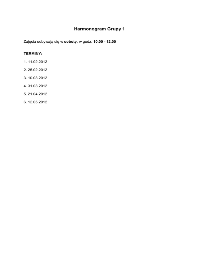 Harmonogram Grupy 1 Zajęcia odbywają się w soboty, w godz. 10.00 - 12.00 TERMINY: 1. 11.02.2012 2. 25.02.2012 3. 10.03.2012 4. 31.03.2012 5. 21.04.2012 6. 12.05.2012