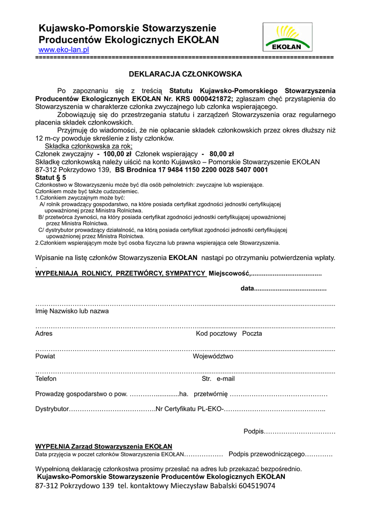 Kujawsko-Pomorskie Stowarzyszenie Producentów Ekologicznych EKOŁAN www.eko-lan.pl ================================================================================== DEKLARACJA CZŁONKOWSKA Po zapoznaniu się z treścią Statutu Kujawsko-Pomorskiego Stowarzyszenia Producentów Ekologicznych EKOŁAN Nr. KRS 0000421872; zgłaszam chęć przystąpienia do Stowarzyszenia w charakterze członka zwyczajnego lub członka wspierającego. Zobowiązuję się do przestrzegania statutu i zarządzeń Stowarzyszenia oraz regularnego płacenia składek członkowskich. Przyjmuję do wiadomości, że nie opłacanie składek członkowskich przez okres dłuższy niż 12 m-cy powoduje skreślenie z listy członków. Składka członkowska za rok; Członek zwyczajny - 100,00 zł Członek wspierający - 80,00 zł Składkę członkowską należy uiścić na konto Kujawsko – Pomorskie Stowarzyszenie EKOŁAN 87-312 Pokrzydowo 139, BS Brodnica 17 9484 1150 2200 0028 5407 0001 Statut § 5 Członkostwo w Stowarzyszeniu może być dla osób pełnoletnich: zwyczajne lub wspierające. Członkiem może być także cudzoziemiec. 1.Członkiem zwyczajnym może być: A/ rolnik prowadzący gospodarstwo, na które posiada certyfikat zgodności jednostki certyfikującej upoważnionej przez Ministra Rolnictwa. B/ przetwórca żywności, na który posiada certyfikat zgodności jednostki certyfikującej upoważnionej przez Ministra Rolnictwa. C/ dystrybutor prowadzący działalność, na którą posiada certyfikat zgodności jednostki certyfikującej upoważnionej przez Ministra Rolnictwa. 2.Członkiem wspierającym może być osoba fizyczna lub prawna wspierająca cele Stowarzyszenia. Wpisanie na listę członków Stowarzyszenia EKOŁAN nastąpi po otrzymaniu potwierdzenia wpłaty. . WYPEŁNIAJĄ ROLNICY, PRZETWÓRCY, SYMPATYCY Miejscowość,....................................... data........................................ …………………………………………………………………........................................................................... Imię Nazwisko lub nazwa …………………………………………………………………........................................................................... Adres Kod pocztowy Poczta …………………………………………………………………........................................................................... Powiat Województwo …………………………………………………………………........................................................................... Telefon Str. e-mail Prowadzę gospodarstwo o pow. ………….............ha. przetwórnię ……………………………………… Dystrybutor………………………………….Nr Certyfikatu PL-EKO-……………………………………….. Podpis…………………………… WYPEŁNIA Zarząd Stowarzyszenia EKOŁAN Data przyjęcia w poczet członków Stowarzyszenia EKOŁAN……………… Podpis przewodniczącego…………. Wypełnioną deklarację członkostwa prosimy przesłać na adres lub przekazać bezpośrednio. Kujawsko-Pomorskie Stowarzyszenie Producentów Ekologicznych EKOŁAN 87-312 Pokrzydowo 139 tel. kontaktowy Mieczysław Babalski 604519074