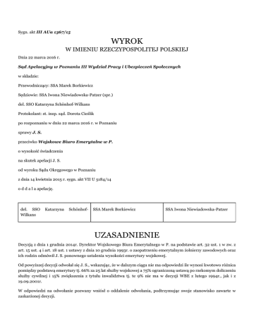 Sygn. akt III AUa 1367/15 WYROK W IMIENIU RZECZYPOSPOLITEJ POLSKIEJ Dnia 22 marca 2016 r. Sąd Apelacyjny w Poznaniu III Wydział Pracy i Ubezpieczeń Społecznych w składzie: Przewodniczący: SSA Marek Borkiewicz Sędziowie: SSA Iwona Niewiadowska-Patzer (spr.) del. SSO Katarzyna Schönhof-Wilkans Protokolant: st. insp. sąd. Dorota Cieślik po rozpoznaniu w dniu 22 marca 2016 r. w Poznaniu sprawy J. S. przeciwko Wojskowe Biuro Emerytalne w P. o wysokość świadczenia na skutek apelacji J. S. od wyroku Sądu Okręgowego w Poznaniu z dnia 14 kwietnia 2015 r. sygn. akt VII U 5184/14 o d d a l a apelację. del. SSO Wilkans Katarzyna Schönhof- SSA Marek Borkiewicz SSA Iwona Niewiadowska-Patzer UZASADNIENIE Decyzją z dnia 1 grudnia 2014r. Dyrektor Wojskowego Biura Emerytalnego w P. na podstawie art. 32 ust. 1 w zw. z art. 15 ust. 4 i art. 18 ust. 1 ustawy z dnia 10 grudnia 1993r. o zaopatrzeniu emerytalnym żołnierzy zawodowych oraz ich rodzin odmówił J. S. ponownego ustalenia wysokości emerytury wojskowej. Od powyższej decyzji odwołał się J. S., wskazując, że w dalszym ciągu nie ma odpowiedzi ile wynosi kwotowo różnica pomiędzy podstawą emerytury tj. 66% za 25 lat służby wojskowej a 75% ograniczoną ustawą po rzekomym doliczeniu służby cywilnej i 15% zwiększenia z tytułu inwalidztwa tj. te 9% nie ma w decyzji WBE z lutego 1994r., jak i z 19.09.2001r. W odpowiedzi na odwołanie pozwany wniósł o oddalenie odwołania, podtrzymując swoje stanowisko zawarte w zaskarżonej decyzji. Sąd Okręgowy w Poznaniu wyrokiem z dnia 14 kwietnia 2015r. oddalił odwołanie. W uzasadnieniu wyroku Sąd powołał się na następujące ustalenia: Odwołujący J. S. urodził się w dniu (...) Decyzją z dnia 13.12.1988r. Wojewódzki Sztab Wojskowy w P. przyznał J. S. prawo do emerytury wojskowej od dnia 1.04.1989r., przy czym wypłatę tego świadczenia zawieszono od dnia przyznania - na czas pobierania renty inwalidzkiej. Na dzień zwolnienia z zawodowej służby wojskowej odwołujący posiadał 24 lata, 10 miesięcy i 21 dni wysługi emerytalnej z tytułu służby wojskowej. Decyzją z dnia 5.12.1991r. Wojskowe Biuro Emerytalne w P. podjęło od 1.01.1992r. wypłatę emerytury wojskowej. Wnioskiem z dnia 13.09.2001r. odwołujący zwrócił się do Dyrektora WBE w P. o zaliczenie pracy cywilnej do wysługi emerytalnej. Decyzją z dnia 19.09.2001r. doliczono odwołującemu do wysługi emerytalnej 12 lat, 5 miesięcy i 25 dni zatrudnienia po zwolnieniu ze służby wojskowej. Przed doliczeniem wysługi emerytalnej procentowy wymiar emerytury J. S. (przy zachowaniu zasady nie przekraczania 75% podstawy wymiaru) wynosił 75% podstawy wymiaru, na co składało się 66,00% wysługi z tytułu służby wojskowej i 15% zwiększenia z tytułu inwalidztwa pozostającego w związku ze służbą wojskową. Po doliczeniu wysługi emerytalnej decyzją z dnia 19.09.2001r. procentowy wymiar emerytury (przy zachowaniu zasady nie przekraczania 75% podstawy wymiaru) wynosił nadal 75% podstawy wymiaru, na co składało się 82,14% z tytułu wysługi emerytalnej (37 lat, 4 miesiące i 15 dni) i 15% zwiększenia z tytułu inwalidztwa pozostającego w związku ze służbą wojskową – doliczenie do wysługi emerytalnej zatrudnienia po zwolnieniu ze służby wojskowej nie wpłynęło na wysokość świadczenia emerytalnego. Pismem z dnia 13.12.2012r. odwołujący zwrócił się o „skorygowanie w decyzji o przyznaniu świadczenia, że pobiera emeryturę za 25 lat służby wojskowej, a te 12 lat, 5 miesięcy i 25 dni to była praca cywilna, za którą nie otrzymuje emerytury”. Decyzją z dnia 16.01.2013r. pozwany odmówił J. S. ponownego rozpoznania okresu wysługi emerytalnej ustalonej w prawomocnej decyzji z dnia 19.09.2001r. i dokonania zmiany tej decyzji poprzez nieuwzględnienie w wysłudze emerytalnej okresów pracy cywilnej w ilości 12 lat, 5 miesięcy i 25 dni. Po rozpoznaniu odwołania J. S. od decyzji z dnia 16.01.2013r. Sąd Okręgowy w Poznaniu wyrokiem z dnia 5.03.2013r. (sygn. VII U 563/13) oddalił odwołanie. Apelacja J. S. została oddalona wyrokiem Sądu Apelacyjnego w Poznaniu z dnia 19.02.2014r. (sygn. III AUa 1285/13). Pismem z dnia 9.04.2013r. J. S. cofnął wniosek o doliczenie do wysługi emerytalnej zatrudnienia po zwolnieniu ze służby wojskowej i wniósł o umorzenie postępowania. W odpowiedzi decyzją z dnia 11.06.2013r. Dyrektor WBE w P. odmówił odwołującemu umorzenia postępowania z wniosku z dnia 13.09.2001r. zakończonego prawomocną decyzją z dnia 19.09.2001r. Po rozpoznaniu odwołania J. S. od decyzji z dnia 11.06.2013r. Sąd Okręgowy w Poznaniu wyrokiem z dnia 15.09.2014r. (sygn. VII U 2223/13) oddalił odwołanie. Od powyższego orzeczenia J. S. wniósł apelację. W piśmie z dnia 18.11.2014r. J. S. domagał się spłaty 15% zwiększenia świadczenia emerytalnego z tytułu inwalidztwa pozostającego w związku ze służbą wojskową. Zaskarżoną decyzją z dnia 1 grudnia 2014r. nr (...), Dyrektor Wojskowego Biura Emerytalnego w P. odmówił J. S. ponownego ustalenia wysokości emerytury wojskowej. Sąd Okręgowy wskazał, że stosownie do treści przepisu art. 15 ust. 4 ustawy z dnia 10 grudnia 1993r. o zaopatrzeniu emerytalnym żołnierzy zawodowych oraz ich rodzin (Dz.U. z 2013r. poz. 66 z późn.zm) emeryturę podwyższa się o 15% podstawy wymiaru emerytowi, którego inwalidztwo pozostaje w związku ze służbą. Natomiast zgodnie z art. 18 ust. 1 cyt. ustawy kwota emerytury bez uwzględnienia dodatków, zasiłków i świadczeń pieniężnych, o których mowa w art. 25, nie może przekraczać 75% podstawy wymiaru emerytury. Przenosząc powyższe rozważania na grunt niniejszej sprawy, Sąd stwierdził, że podstawa wymiaru świadczenia emerytalnego odwołującego została prawidłowo ograniczona, zgodnie z przywołanym powyżej art. 18 ust. 1 ustawy do 75% tej podstawy. Brak jest zatem możliwości wypłaty emerytury w wysokości przekraczającej 75% p