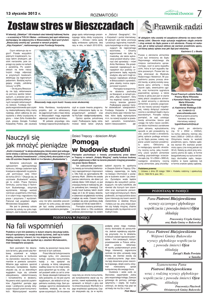 13 stycznia 2012 r. 7 ROZMAITOŚCI Zostaw stres w Bieszczadach w „National Geographic”, lm o Karpatach i portal internetowy. W planach jest także promocja i produkcja regionalnej maskotki: rysia karpackiego w stroju nawiązującym do regionalnego Czym reklamuje się rewzornictwa. – Chcemy gion? Przede wszystkim wypromować nie tylko tę pięknymi krajobrazami, kumaskotkę, ale także wykresząc takimi atrakcjami, jak ować produkt lokalny i stwostoki narciarskie, psie zarzyć sieć sprzedaży – mówi przęgi czy jazda na nartach Anita Rembiesa. Dla przedz paralotnią. Po szaleństawicieli największych eustwach na łonie natury ropejskich biur podróży orturyści mogą odpocząć ganizowane będą wyjazdy w przytulnych kwaterach, studyjne, aby sami mogli zodelektując się regionalnym baczyć największe atrakcje jedzeniem. Bardziej wymaw Bieszczadach i sprawdzić, gający znajdą „odrobinę jakie obiekty można zaproluksusu” w SPA. ponować turystom. – Do tej pory BieszczaPieniądze na wspomniady nie były reklamowane ne działania pochodzą za pomocą spotów telewize Szwajcarii, w ramach prozyjnych, a przecież jest to jektu „Alpy Karpatom”, który jedno z najbardziej efektywma wspierać rozwój ekononych narzędzi reklamowych Bieszczady mają czym kusić i kuszą coraz skuteczniej. miczny terenów górskich na świecie. Fundacja KarPodkarpacia poprzez transpacka wyprodukowała spot czytel- Anita Rembiesa, koordynatorka czyli w czasie trwania programu. fer doświadczeń szwajcarskich. ny, nieskomplikowany, który, mamy projektu, jest on adresowany Kopie umieszczane będą na za- Fundacja Karpacka z Sanoka nadzieję, skłoni odbiorcę do sko- do zagonionych ludzi z miast, którzy przyjaźnionych portalach oraz otrzyma blisko pięć milionów franrzystania z oferty turystycznej re- w Bieszczadach mogą wspaniale na YouTube – dodaje koordynatorka. ków, które będą wykorzystane gionu – mówi Zoa Kordela-Bor- odpocząć i uwolnić się od stresu. Oprócz spotów, południową m.in. na rozwój turystyki w powiaczyk, prezes Zarządu Fundacji W połowie przyszłego roku część Podkarpacia będą rekla- tach sanockim, krośnieńskim, Karpackiej Polska. Jak zauważa fundacja rozpocznie produkcję dru- mować także także artykuły leskim i bieszczadzkim. (z) W telewizji „Obiektyw” i 60 miastach sieci telewizji kablowej Vectra – a wcześniej w TVN 24 i Meteo – emitowany jest spot reklamowy, zachęcający do odpoczynku w Bieszczadach. Spot pod tytułem „Bieszczady uwolnij się” powstał w ramach projektu „Alpy Karpatom”, realizowanego przez Fundację Karpacką. giego spotu reklamowego prezentującego letnią ofertę turystyczną regionu. – Zimowe i letnie spoty będą emitowane cyklicznie, dwa razy w roku, w latach 2012-2016, ARCHIWUM PRYWATNE Dzieci Trepczy – dzieciom Afryki Nauczyli się Pomogą jak mnożyć pieniądze w budowie studni W ubiegłym roku zostały mi zasądzone alimenty na rzecz małoletniej córki. Obecnie moja sytuacja majątkowa uległa zmianie i chcę wnieść do Sądu pozew o ich obniżenie. Proszę mi wskazać, jak w takiej sytuacji oblicza się wartość przedmiotu sporu, od której zależy opłata oraz jaki Sąd jest właściwy. Kazimierz C. z Beska Pozew o obniżenie alimentów musi być wniesiony do Sądu Rejonowego właściwego dla miejsca zamieszkania uprawnionego, czyli w pana wypadku córki, która w tym wypadku będzie pozwanym. Pozew taki należy skierować do Wydziału Rodzinnego i Nieletnich. W uzasadnieniu pozwu proszę określić kwotę, w jakiej zostały zasądzone panu alimenty i kiedy (wyrok sądu, ewentualnie ugoda, oraz koniecznie sygnatura poprzedniej sprawy), a także kwotę w jakiej jest pan w stanie dalej płacić zasądzone alimenty. Jeżeli wnosimy o obniżenie alimentów z powodu pogorszenia się naszej sytuacji majątkowej, należy dołączyć zaświadczenie o zarobkach bądź o byciu bezrobotnym. Ponadto należy pamiętać, że sąd, ustalając kwotę alimentów, bierze pod uwagę nie tylko nasze zarobki, ale także możliwości zarobkowe (stan zdrowia, wykształcenie, sposób w jaki prowadzimy życie). Jeżeli chodzi o określenie, jakiej opłacie podlega wniesiony do Sądu pozew, należy najpierw ustalić wartość przedmiotu sporu. Obliczamy ją w następujący sposób: określamy roczną sumę, jaką musieliśmy uiścić tytułem alimentów według poprzedniego orzeczenia sądu (np. 12 x 250zł = 3000 zł), następnie określamy roczną sumę alimentów, jaką chcieliby- Porad Prawnych udziela Radca Prawny Marta Witowska z Kancelarii Radcy Prawnego Marta Witowska 38-500 Sanok, ul. Kazimierza Wielkiego 3/20 tel. 13-464-51-13 www.witowska.com Pytania prawne prosimy kierować na adres internetowy redakcji: [email protected] śmy płacić po obniżeniu (np. 12 x 200zł = 2400zł), na końcu obliczmy różnicę obu kwot ( 3000 zł – 2400 zł = 600 zł). Otrzymana kwota to wartość przedmiotu sporu. Opłata sądowa wynosi 5% wartości przedmiotu sporu (nie mniej jednak niż 30 zł). Należy ją uiścić przy wnoszeniu pisma do sądu, w formie bezgotówkowej na rachunek bieżący dochodów sądu, bezpośrednio w kasie sądowej lub w formie znaków opłaty sądowej. ARCHIWUM ZS4 „Korki z inwestycji” to akcja edukacyjna, której celem jest wzbogacenie wiedzy z zakresu rynku kapitałowego. Prowadzi ją rma pod Pieniądze pochodzące z kwesty prowadzonej przez dzieci nazwą „Alchemia inwestowania”, z której oferty skorzystało w tym w Trepczy w ramach „Kolędy Misyjnej” zasilą fundusz budowy roku 20 uczniów Zespołu Szkół nr 4 w Sanoku („Budowlanka”). studni głębinowej w Mali na terenie placówki misyjnej prowadzonej przez Ojców Białych. Szkolenie zakończyło się Tak zadecydowali organizato- tydzień stycznia br. spotkania ogłoszeniem ogólnopolskiego rzy kwesty po konsultacji telefonicz- w Zespole Szkół w Trepczy. Oa- Podstawa prawna: konkursu, którego zadaniem była nej