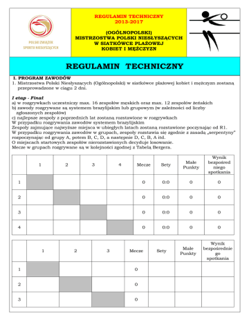REGULAMIN TECHNICZNY 2013-2017 (OGÓLNOPOLSKI) MISTRZOSTWA POLSKI NIESŁYSZĄCYCH W SIATKÓWCE PLAŻOWEJ KOBIET I MĘŻCZYZN REGULAMIN TECHNICZNY I. PROGRAM ZAWODÓW 1. Mistrzostwa Polski Niesłyszących (Ogólnopolski) w siatkówce plażowej kobiet i mężczyzn zostaną przeprowadzone w ciągu 2 dni. I etap - Finał a) w rozgrywkach uczestniczy max. 16 zespołów męskich oraz max. 12 zespołów żeńskich b) zawody rozgrywane są systemem brazylijskim lub grupowym (w zależności od liczby zgłoszonych zespołów) c) najlepsze zespoły z poprzednich lat zostaną rozstawione w rozgrywkach W przypadku rozgrywania zawodów systemem brazylijskim Zespoły zajmujące najwyższe miejsca w ubiegłych latach zostaną rozstawione poczynając od R1. W przypadku rozgrywania zawodów w grupach, zespoły rozstawia się zgodnie z zasadą „serpentyny” rozpoczynając od grupy A, potem B, C, D, a następnie D, C, B, A itd. O miejscach startowych zespołów nierozstawionych decyduje losowanie. Mecze w grupach rozgrywane są w kolejności zgodnej z Tabelą Bergera. Mecze Sety Małe Punkty Wynik bezpośred niego spotkania 1 0 0:0 0 0 2 0 0:0 0 0 3 0 0:0 0 0 4 0 0:0 0 0 1 2 1 3 2 4 3 Mecze 1 0 2 0 3 0 Sety Małe Punkty Wynik bezpośrednie go spotkania O kolejności zespołu w grupie decydują Ilość punktów za wygrane mecze obliczona zgodnie z zasadą: za zwycięstwo 2 pkt., za porażkę 1 pkt, za nie przystąpienie do meczu lub walkower 0 pkt. Lepszy (wyższy) stosunek setów wygranych do przegranych, Lepszy (wyższy) stosunek małych punktów zdobytych do straconych, Wynik bezpośredniego spotkania pomiędzy zainteresowanymi zespołami. II. UCZESTNICTWO 1. Każdy klub ma prawo zgłosić 1 zespół, pozostałe miejsca do obsadzenia w zależności od wyników klubu w poprzednich latach. 2. Nie ma zawodników rezerwowych. 3.Skład zespołu zgłoszony obowiązuje do końca Mistrzostw i nie może być zmieniany ani uzupełniany. 4.Zawodnicy muszą być zrzeszeni w PZSN, 5.Licencja PZSN, 6.Stroje sportowe, numeracja 1 i 2 7.Ważne badanie lekarskie zawodników, 8.Zakaz gry w aparatach słuchowych, 9.Uregulowana składka członkowska PZSN na 2014 rok. III. ZGŁOSZENIA 1.Ostateczne imienne do dnia 28.08.2014r.do godz.23:59, 2.Po tym terminie zgłoszenia nieważne. 3.Potwierdzenie udziału w imprezie prosimy przesyłać e-mailem: [email protected] IV. PUNKTACJA 1.Mecze rozgrywane są do dwóch wygranych setów do 21 punktów, z dwoma punktami przewagi (trzeci set rozgrywany tie breakiem do 15 pkt.) 2.W fazie grupowej zespoły punktują zgodnie z zasadą: za zwycięstwo – 2 pkt., za przegraną 1 pkt. Zgodnie z przepisami z regulaminem PZPS. 3.Obowiązuje punktacja zgodnie z przepisami i regulaminem PZPS. V. PRZEPISY GRY 1. Zawody rozgrywane są w oparciu o przepisy Polskiego Związku Piłki Siatkowej uwzględnieniem zapisów niniejszego regulaminu technicznego. 2. Ceremoniał przed rozpoczęciem meczu i po zakończeniu meczu 10 min. 8 min. 7 min. 6 min. 1 min. Koniec poprzedniego meczu. Sędziowie wypełniają pomeczowe obowiązki i opuszczają pole gry. Zapowiedź nowego meczu. Nowe zespoły i kolejna komisja sędziowska wchodzą na pole gry. Zawodnicy muszą mieć na sobie oficjalne stroje sportowe. Zawodnicy mogą się rozgrzewać w polu gry. Sędziowie sprawdzają wyposażenie boiska, warunki gry, strefy dla zawodników oraz protokół z meczu. Losowanie (UWAGA! Losowanie nie może się odbyć, jeśli, nie ma przygotowanego protokołu). Losowanie odbywa się w strefie między słupkiem a stolikiem sekretarza. Kapitanowie podpisują protokół i zaznaczają w nim „gwiazdką” zawodnika, który w ich zespole będzie zagrywał jako pierwszy. Rozpoczęcie oficjalnej rozgrzewki na siatce. Sędzia pierwszy daje sygnał gwizdkiem, jednocześnie sygnalizując ile minut będzie trwała rozgrzewka bądź ile minut pozostało do jej zakończenia, (jeżeli, losowanie z różnych powodów nie odbyło się 7 minut przed rozpoczęciem meczu) Zakończenie oficjalnej rozgrzewki. Zawodnicy opuszczają boisko i siadają na krzesełkach w strefach dla zawodników. Sędziowie udają się na swoje stanowiska. Sędzia pierwszy na podeście, zaś sędzia drugi przed stolikiem sekretarza. Sędziowie liniowi oraz obsługa boiska również zajmują swoje miejsca w polu gry. Po zajęciu miejsc przez sędziów, spiker dokonuje prezentacji sędziów, a następnie indywidualnej prezentacji zawodników. W przypadku braku przedstawienia sędziów i zawodników na sygnał sędziego pierwszego zawodnicy ustawiają się za liniami końcowymi po tej stronie boiska, po której zajęli krzesełka 0 min. Koniec meczu (Rysunek 1). Na kolejny sygnał sędziego pierwszego zawodnicy podbiegają do siatki, witają się z przeciwnikami i zajmują miejsca na stronie boiska, na której będą rozpoczynać grę (Rysunek 2). Rozpoczęcie meczu. Sędzia pierwszy schodzi z podestu i staje za linia boczną w pobliżu swojego stanowiska. Sędzia drugi dołącza do sędziego pierwszego. Zawodnicy dziękują przeciwnikom za grę, podchodzą do sędziów i dziękują sędziom. Cała obsada sędziowska przechodzi wzdłuż siatki do stolika sekretarza. Kapitanowie podpisują protokół, po czym zawodnicy szybko zabierają swoje rzeczy i opuszczają pole gry. Sędziowie sprawdzają i podpisują protokół, a następnie wyprowadzają zespoły, jeżeli zespoły nie opuściły jeszcze pola gry. Ceremoniał przed rozpoczęciem meczu. Rysunek 1. Ceremoniał przed rozpoczęciem meczu. Rysunek 2. VI. REGUŁY GRY Pole gry Pole gry składa się z boiska do gry i wolnej strefy. Wymiary Boisko do gry jest prostokątem o wymiarach 16 x 8 m, otoczonym wolną strefą o szerokości przynajmniej 3 m, z przestrzenią wolną od jakichkolwiek konstrukcji (zadaszenia) do wysokości przynajmniej 7 m od podłoża Powierzchnia pola gry Pole gry musi być umieszczone na możliwie jak najbardziej równym, płaskim oraz jednolitym terenie piaszczystym, wolnym od kamieni, muszelek i in