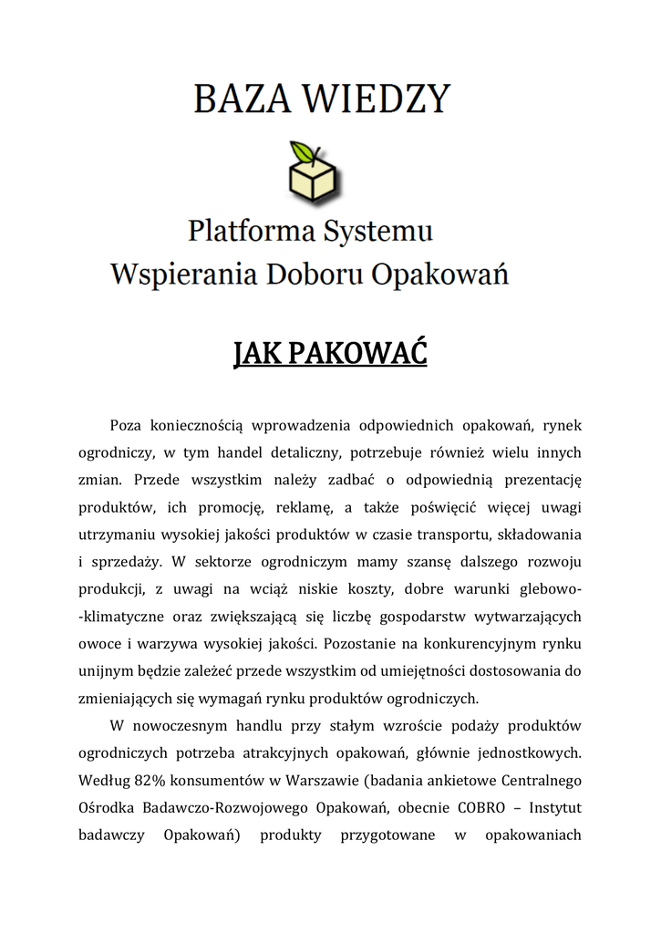 JAK PAKOWAĆ Poza koniecznością wprowadzenia odpowiednich opakowań, rynek ogrodniczy, w tym handel detaliczny, potrzebuje również wielu innych zmian. Przede wszystkim należy zadbać o odpowiednią prezentację produktów, ich promocję, reklamę, a także poświęcić więcej uwagi utrzymaniu wysokiej jakości produktów w czasie transportu, składowania i sprzedaży. W sektorze ogrodniczym mamy szansę dalszego rozwoju produkcji, z uwagi na wciąż niskie koszty, dobre warunki glebowo-klimatyczne oraz zwiększającą się liczbę gospodarstw wytwarzających owoce i warzywa wysokiej jakości. Pozostanie na konkurencyjnym rynku unijnym będzie zależeć przede wszystkim od umiejętności dostosowania do zmieniających się wymagań rynku produktów ogrodniczych. W nowoczesnym handlu przy stałym wzroście podaży produktów ogrodniczych potrzeba atrakcyjnych opakowań, głównie jednostkowych. Według 82% konsumentów w Warszawie (badania ankietowe Centralnego Ośrodka Badawczo-Rozwojowego Opakowań, obecnie COBRO – Instytut badawczy Opakowań) produkty przygotowane w opakowaniach 2 jednostkowych są droższe, a według 17% jest odwrotnie. Z tego względu nadal popularna jest sprzedaż luzem, zwłaszcza na targowiskach detalicznych oraz w sklepach małych oraz średniej wielkości. Z kolei w super- i hipermarketach podaż świeżych owoców w opakowaniach jednostkowych szacuje się obecnie na ponad 40%, warzyw na nieco mniej. W opakowaniach jednostkowych sprzedaje się najczęściej: owoce miękkie, brzoskwinie, owoce południowe, jabłka, sałatę, pomidory, cebulę, warzywa korzeniowe oraz pieczarki i ziemniaki. Produkty ogrodnicze opakowane kupują najczęściej osoby lepiej sytuowane, a rzadko te zarabiające najmniej. Produkty ogrodnicze w opakowaniach jednostkowych kupują zwykle klienci dobrze sytuowani. Zwolennicy zakupów produktów luzem cenią sobie możliwość własnoręcznego wyboru. Niektórzy konsumenci uważają jednak, że ciągłe przekładanie produktów oferowanych luzem może powodować ich 3 uszkodzenia i utratę świeżości. Z obsługi sprzedawcy podającego towar zadowoleni są nieliczni kupujący. Niedogodnością bywa również nieodpowiednia wielkość porcji lub brak poszukiwanego produktu. Liczebnie przeważają konsumenci kupujący produkty luzem, ale około 40% skłonnych jest zakupić droższe i estetycznie zapakowane. Odmienne zdanie miało blisko 60% kupujących (badania COBRO). Stosowanie opakowania jednostkowego skraca czas zakupu i nie ma wpływu na obniżenie jakości wskutek wybierania produktów oferowanych luzem. Jeżeli konsument upewni się, że dokonał właściwego wyboru, przy następnych zakupach poszuka zapamiętanego logo producenta lub firmy pakującej. Jest to tym ważniejsze, że np. w marketach nie ma styczności producenta z konsumentem, jak to bywa przy zakupach bezpośrednich u wytwórcy lub w sklepach owocowo-warzywnych bądź na targowiskach. Klientowi należy zapewnić jak największy wybór owoców i warzyw w atrakcyjnej ekspozycji. 4 Wybór miejsca zakupów: targowiska, małe i średnie sklepy osiedlowe, markety, zależy od upodobań klienta, przyzwyczajeń, czasu, zasobów finansowych. Sam produkt i jego jakość mają największy wpływ na decyzję zakupu. Klienci są przekonani, że bez względu na miejsce zakupu zostaną wszędzie dobrze obsłużeni. Świadomi swojego wyboru, nie ustają w poszukiwaniu coraz to nowych, smakowitych i lepszych jakościowo owoców i warzyw. Potrzebna jest zatem rzetelna informacja o walorach oraz przydatności tych produktów. Wiąże się z tym także reklama właściwości i zalet towarów. Nawet w małym sklepie klientowi trzeba zapewnić jak największy wybór owoców i warzyw w atrakcyjnej ekspozycji w różnorodnym opakowaniu lub luzem. Np. wystawione do sprzedaży pieczarki mogą stać w pudełkach o pojemności 0,5 kg lub 1,0 kg, a obok te same pieczarki leżeć luzem w skrzynce, z możliwością własnoręcznego wyboru. Innym razem papryka ułożona luzem w rzędach na przemian w kolorze czerwonym, zielonym, żółtym, a obok pakowana po kilka sztuk w opakowaniach foliowych (w torebkach, na tackach). Ostatnio coraz większe znaczenie mają tzw. opakowania gotowe na półkę – SRP (Shelf Ready Packaging). Są to opakowania zbiorcze, zaprojektowane w sposób umożliwiający wystawienie ich wprost na półkę sklepową. A więc pod tym pojęciem określa się prawidłowe pakowania towarów przygotowanych do sprzedaży, np. w sklepie wielkopowierzchniowm, gdzie towar jest udostępniony detalicznym nabywcom. Dobrym przykładem SRP są opakowania tekturowe (pudła), w których produkty są ułożone luzem, np. jabłka, pomidory, sałata czy papryka lub znajdują się w opakowaniach jednostkowych (pudełka, tacki owinięte folią, torebki). Wówczas konsument wybiera z tych opakowań 5 transportowych pojedynczo produkty w liczbie mu odpowiadającej lub przygotowane w opakowaniach jednostkowych. Takie opakowania pozwalają eliminować operacje związane z przesypywaniem bądź przekładanie owoców czy warzyw z opakowań, stanowiące bardzo duże zagrożenie dla zachowania jakości. Ponadto opakowania określane jako gotowe na półkę ułatwiają przemieszczanie, szybką identyfikację produktów w obrębienie sklepu oraz zwiększają atrakcyjność dla konsumentów. Do niedawna o przewadze produktów konkurencyjnej firmy przesądzały cena, walory użytkowe i jakość. Teraz dla wielu osób jakość oraz atrakcyjne podanie towarów są ważniejsze niż cena, koszty wprowadzanych materiałów i wytwarzania opakowań nie wpływają zaś zbytnio na cenę produktu. Stosowanie odpowiednich opakowań przynosi wyraźne korzyści w odniesieniu do jakości. Już kilka kawałków folii użytych do owinięcia ogórka czy pęczka nowalijek przedłuża ich świeżość. Shelf ready packaging to opakowania umożliwiające wystawienie z produktami wprost na półkę. 6 Pakowane malin lub truska