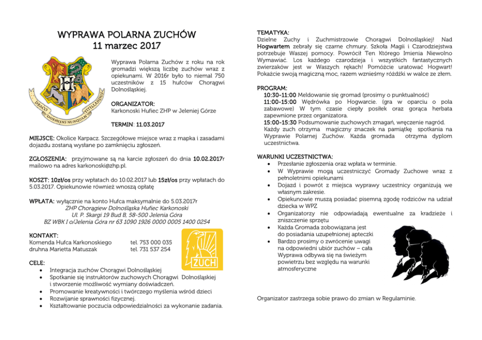 WYPRAWA POLARNA ZUCHÓW 11 marzec 2017 Wyprawa Polarna Zuchów z roku na rok gromadzi większą liczbę zuchów wraz z opiekunami. W 2016r było to niemal 750 uczestników z 15 hufców Chorągwi Dolnośląskiej. ORGANIZATOR: Karkonoski Hufiec ZHP w Jeleniej Górze TERMIN: 11.03.2017 MIEJSCE: Okolice Karpacz. Szczegółowe miejsce wraz z mapka i zasadami dojazdu zostaną wysłane po zamknięciu zgłoszeń. ZGŁOSZENIA: przyjmowane są na karcie zgłoszeń do dnia 10.02.2017r mailowo na adres [email protected]. KOSZT: 10zł/os przy wpłatach do 10.02.2017 lub 15zł/os przy wpłatach do 5.03.2017. Opiekunowie również wnoszą opłatę WPŁATA: wyłącznie na konto Hufca maksymalnie do 5.03.2017r ZHP Chorągiew Dolnośląska Hufiec Karkonoski Ul. P. Skargi 19 Bud B, 58-500 Jelenia Góra BZ WBK I o/Jelenia Góra nr 63 1090 1926 0000 0005 1400 0254 KONTAKT: Komenda Hufca Karkonoskiego druhna Marietta Matuszak tel. 753 000 035 tel. 731 537 254 CELE: Integracja zuchów Chorągwi Dolnośląskiej Spotkanie się instruktorów zuchowych Chorągwi Dolnośląskiej i stworzenie możliwość wymiany doświadczeń. Promowanie kreatywności i twórczego myślenia wśród dzieci Rozwijanie sprawności fizycznej. Kształtowanie poczucia odpowiedzialności za wykonanie zadania. TEMATYKA: Dzielne Zuchy i Zuchmistrzowie Chorągwi Dolnośląskiej! Nad Hogwartem zebrały się czarne chmury. Szkoła Magii i Czarodziejstwa potrzebuje Waszej pomocy. Powrócił Ten Którego Imienia Niewolno Wymawiać. Los każdego czarodzieja i wszystkich fantastycznych zwierzaków jest w Waszych rękach! Pomóżcie uratować Hogwart! Pokażcie swoją magiczną moc, razem wznieśmy różdżki w walce ze złem. PROGRAM: 10:30-11:00 Meldowanie się gromad (prosimy o punktualność) 11:00-15:00 Wędrówka po Hogwarcie. (gra w oparciu o pola zabawowe) W tym czasie ciepły posiłek oraz gorąca herbata zapewnione przez organizatora. 15:00-15:30 Podsumowanie zuchowych zmagań, wręczenie nagród. Każdy zuch otrzyma magiczny znaczek na pamiątkę spotkania na Wyprawie Polarnej Zuchów. Każda gromada otrzyma dyplom uczestnictwa. WARUNKI UCZESTNICTWA: Przesłanie zgłoszenia oraz wpłata w terminie. W Wyprawie mogą uczestniczyć Gromady Zuchowe wraz z pełnoletnimi opiekunami Dojazd i powrót z miejsca wyprawy uczestnicy organizują we własnym zakresie. Opiekunowie muszą posiadać pisemną zgodę rodziców na udział dziecka w WPZ Organizatorzy nie odpowiadają ewentualne za kradzieże i zniszczenie sprzętu Każda Gromada zobowiązana jest do posiadania uzupełnionej apteczki Bardzo prosimy o zwrócenie uwagi na odpowiedni ubiór zuchów – cała Wyprawa odbywa się na świeżym powietrzu bez względu na warunki atmosferyczne Organizator zastrzega sobie prawo do zmian w Regulaminie.