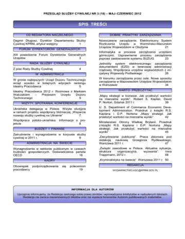 PRZEGLĄD SŁUŻBY CYWILNEJ NR 3 (18) – MAJ–CZERWIEC 2012 SPIS TREŚCI OD REDAKTORA NACZELNEGO DOBRE PRAKTYKI ZARZĄDZANIA Dagmir Długosz, Dyrektor Departamentu Służby Cywilnej KPRM, artykuł wstępny 1 Nowoczesne zarządzanie. Elektroniczny System Rozliczania Urzędu w Warmińsko-Mazurskim Urzędzie Wojewódzkim w Olsztynie 21 FORUM DYREKTORÓW GENERALNYCH XIII posiedzenie Forum Dyrektorów Generalnych Urzędów 3 RADA SŁUŻBY CYWILNEJ Z prac Rady Służby Cywilnej 4 W ADMINISTRACJI W gronie najlepszych! Urząd Dozoru Technicznego wciąż wysoko w kolejnych edycjach rankingu Idealny Pracodawca 5 Idealny Pracodawca 2012 r. Rozmowa z Markiem Walczakiem – Prezesem Urzędu Dozoru Technicznego 5 WIZYTY, SPOTKANIA, KONFERENCJE Ukraińska delegacja w Polsce. Wizyta studyjna w ramach projektu współpracy bliźniaczej „Wsparcie rozwoju służby cywilnej na Ukrainie” 7 Współpraca polsko-ukraińska. Informacja o projekcie 8 BUDŻET I FINANSE Zatrudnienie i wynagrodzenia w korpusie służby cywilnej w 2011 r. 9 Informatyka w procesie zarządzania urzędami górniczymi. Usprawnienie procesu zarządzania poprzez zastosowanie systemu SUZUG 23 Jednolity system elektronicznego zarządzania dokumentami (EZD) w terenowej administracji rządowej. Współpraca urzędów wojewódzkich z inicjatywy Wojewody Podlaskiego 26 W kierunku zarządzania przez cele. Nowe sposoby zarządzania w Mazowieckim Urzędzie Wojewódzkim w Warszawie 34 WARTO PRZECZYTAĆ „Mapy strategii w biznesie. Jak przełożyć wartości na mierzalne wyniki”. Robert S. Kaplan, David P. Norton, Gdańsk 2011 r. 39 U. S. Department of Commerce Economic Development Administration. Przedruk z książki R.S. Kaplana i D.P. Nortona „Mapy strategii. Jak przełożyć wartości na mierzalne wyniki” 42 Ministerstwo Obrony Wielkiej Brytanii. Przedruk z książki R.S. Kaplana i D.P. Nortona „Mapy strategii. Jak przełożyć wartości na mierzalne wyniki” 45 ADMINISTRACJA NA ŚWIECIE „Decydowanie publiczne”. Praca zbiorowa pod redakcją naukową Grzegorza Rydlewskiego, Warszawa 2011 r. 47 Wynagrodzenia w sektorze publicznym w czasach trudności gospodarczych. Doświadczenia państw OECD 16 „Związki zawodowe w Polsce. Aktualna sytuacja, struktura organizacyjna, wyzwania”. Vera Trappmann, 2012 r. 48 „Kryminalistyka na świecie”. Warszawa 2011 r. 50 KADRY Obowiązek podporządkowania pracodawcy się poleceniom 19 REDAKCJA [email protected] INFORMACJA DLA AUTORÓW Uprzejmie informujemy, że Redakcja zastrzega sobie prawo skrótów i wprowadzania śródtytułów w nadsyłanych tekstach. Redakcja nie zwraca niezamówionych tekstów oraz nie wypłaca honorariów Autorom publikowanych materiałów.