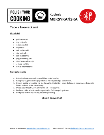 Kuchnia MEKSYKAŃSKA Taco z krewetkami Składniki 5-6 krewetek 25g chipotle 1 zielone chili 1/4 cebuli sok z 1 limonki 10g kolendry ząbek czosnku 50g śmietany 30% 10ml sosu sojowego 4 małe tortille oliwa do smażenia Przygotowanie 1. Pokrój cebulę, czosnek oraz chili na małą kostkę. 2. Rozgrzej w garnku oliwę i podsmaż na niej cebulę z czosnkiem. 3. Pokrój każdą krewetkę na 3-4 kawałki. Dodaj je i smaż kolejne 2 minuty, aż krewetki lekko zmienią kolor na różowy. 4. Dodaj sos chipotle, sok z limonki, sól i sos sojowy. 5. Duś wszystko aż mieszanka zgęstnieje. Odstaw gdy gotowe. 6. Podgrzej tortille na suchej patelni i podawaj! ¡buen provecho! Więcej przepisów na www.PolishYourCooking.com Masz pytania? Pisz na [email protected]