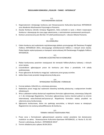 REGULAMIN KONKURSU „FOLKLOR – TANIEC - INTEGRACJE” § 1. POSTANOWIENIA OGÓLNE 1. Organizatorem niniejszego konkursu jest Stowarzyszenie Kulturalno-Sportowe INTEGRACJE oraz Akademia Wychowania Fizycznego w Poznaniu. 2. Zasady Konkursu określa niniejszy Regulamin, który wchodzi w życie z dniem rozpoczęcia Konkursu i obowiązuje do czasu jego zakończenia, z zastrzeżeniem postanowień poniższych. 3. Konkurs przeznaczony jest dla klas I-III szkół podstawowych z obszaru Miasta Poznania. § 2. CEL KONKURSU 1. Celem konkursu jest wyłonienie najciekawszego plakatu promującego XIII Światowy Przegląd Folkloru INTEGRACJE 2013, obrazującego wielobarwność folkloru z różnych stron świata. Plakat będzie wykorzystywany w kampanii wizerunkowej XIII Światowego Przeglądu Folkloru INTEGRACJE. § 3. WARUNKI UCZESTNICTWA W KONKURSIE 1. Plakat konkursowy powinien nawiązywać do tematyki folkloru/kultury ludowej z różnych stron świata. 2. Uczestnikiem zgłaszającym prace do konkursu jest klasa z przedziału I–III szkoły podstawowej. 3. Prace zgłoszone do konkursu mogą być wykonane przez grupę uczniów. 4. Jedna klasa może przesłać nieograniczoną liczbę prac. § 4. WYMAGANIA TECHNICZNE I FORMALNE 1. Format plakatu 120x120 cm, orientacja pionowa. 2. Nadesłane prace mogą być wykonane dowolną techniką plastyczną z wyłączeniem kredek ołówkowych. 3. Wraz z plakatem należy dostarczyć wypełniony formularz zgłoszeniowy, stanowiący Załącznik nr 1 do niniejszego Regulaminu. Formularz zgłoszeniowy można również pobrać na stronie internetowej www.festiwal.awf.poznan.pl. Wypełniony formularz należy przykleić na odwrocie pracy konkursowej. 4. Zgłoszenia konkursowe, które nie spełniają warunków, o których mowa w niniejszym Regulaminie nie zostaną zakwalifikowane do konkursu. § 5. TERMIN I MIEJSCE NADSYŁANIA PRAC 1. Prace wraz z formularzem zgłoszeniowym powinny zostać przesłane lub dostarczone osobiście na adres: Stowarzyszenie Kulturalno-Sportowe INTEGRACJE, ul. Rocha 9, 61-142 Poznań z adnotacją „Konkurs –INTEGRACJE 2013”. 2. Termin składania prac upływa 30.04.2013r. 3. Koszty wykonania plakatu i przesyłki pocztowej ponoszą uczestnicy zgłaszające prace. § 6. KOMISJA KONKURSOWA 1. O wyborze zwycięzców Konkursu zadecyduje komisja konkursowa powołana przez Organizatorów, w skład której wejdą: Rektor Akademii Wychowania Fizycznego w Poznaniu, Dyrektor artystyczny Światowego Przeglądu Folkloru INTEGRACJE oraz Prezes Stowarzyszenia Kulturalno- Sportowego INTEGRACJE. 2. Komisja powołana jest na czas trwania Konkursu. 3. Komisja oceniająca prace konkursowe przy wyborze zwycięskiego plakatu będzie kierowała się następującymi kryteriami: zgodność przesłania zawartego w pracy z celem Konkursu, wyrazistość przekazu, pomysłowość, zawartość merytoryczna, forma estetyczna pracy, oryginalność pracy itp. 4. Decyzja Komisji jest ostateczna i nie podlega zaskarżeniu. § 7. NAGRODY 1. Organizator przewiduje przyznanie trzech nagród i dwóch równorzędnych wyróżnień. 2. Nagrodami w konkursie są warsztaty artystyczne dla klasy autora/autorów zwycięskiej pracy. Sponsorem nagrody jest firma Arty-Party Szymon Jakóbczyk Imprezy dla dzieci (www.artyparty.pl) • I MIEJSCE: warszaty związane z malowaniem ekotoreb (zorganizowane przez firmę Arty-Party Szymon Jakóbczyk Imprezy dla dzieci) oraz warsztaty tańca ludwego (zorganizowane przez Zespół Tańca Ludowego „Poznań” Akademii Wychowania Fizycznego w Poznaniu) • II i III MIEJSCE: warsztaty bańkowe (firma Arty-Party Szymon Jakóbczyk Imprezy dla dzieci) Zwycięskie prace zostaną dodatkowo zamieszczone w witrynach wybranych przystanków autobusowych w Poznaniu. 3. Dwie wyróżnione prace zostaną zamieszczone w witrynach wybranych przystanków autobusowych w Poznaniu. § 8. WYNIKI KONKURSU 1. Ogłoszenie wyników nastąpi do dnia 07.05.2013r. 2. Wyniki konkursu zostaną opublikowane na stronie internetowej www.festiwal.awf.poznan.pl oraz na stronie www.facebook.com/INTEGRATIONPoznan. 3. Nagrodzeni uczestnicy o wynikach konkursu zostaną poinformowani drogą mailową lub telefonicznie. 4. Miejsce i termin odebrania nagród zostanie ustalony indywidulanie z każdym z laureatów konkursu. § 9. OŚWIADCZENIA O PRAWACH AUTORSKICH I PRZETWARZANIU DANYCH OSOBOWYCH 1. Laureaci i wyróżnieni w Konkursie, przekazują nieodpłatnie Organizatorowi całość majątkowych praw autorskich do złożonej pracy/prac. Organizator zastrzega sobie prawo do przekazania prac osobom trzecim oraz do ich całościowej lub częściowej publikacji, na wszystkich polach eksploatacji, w tym m.in. do: - wyłącznego używania i wykorzystania prac konkursowych we wszelkiej działalności promocyjnej, reklamowej, informacyjnej, - utrwalania i zwielokrotniania prac konkursowych wszelkimi technikami graficznymi, - zwielokrotniania poprzez dokonywanie zapisu prac konkursowych na nośnikach elektronicznych, - publicznego wystawiania i wyświetlania prac konkursowych na wszelkich imprezach otwartych i zamkniętych, - wprowadzania do obrotu, wydawania i rozpowszechniania wszelkich materiałów promocyjnych, informacyjnych, wydawniczych i innych z wykorzystaniem prac konkursowych, - wprowadzania do pamięci komputera i umieszczenia prac konkursowych w Internecie. Prawa te są nieograniczone czasowo, ilościowo i terytorialnie. 2. Autor projektu ponosi pełną odpowiedzialność wobec Organizatora i osób trzecich w przypadku, gdyby udostępniona praca/e naruszała/y prawa (w szczególności prawa autorskie) osób trzecich. 3. Organizator może wykluczyć uczestnika z udziału w Konkursie w przypadku naruszenia przez uczestnika postanowień niniejszego Regulaminu. 4. Uczestnik Konkursu, wraz z przystąpieniem do Konkursu, wyraża zgodę na przetwarzanie danych osobowych dla potrzeb przeprowadzenia Konkursu, na warunkach określonych w ustawie z dn. 29 sierpnia 1997r. o ochronie danych osobowych