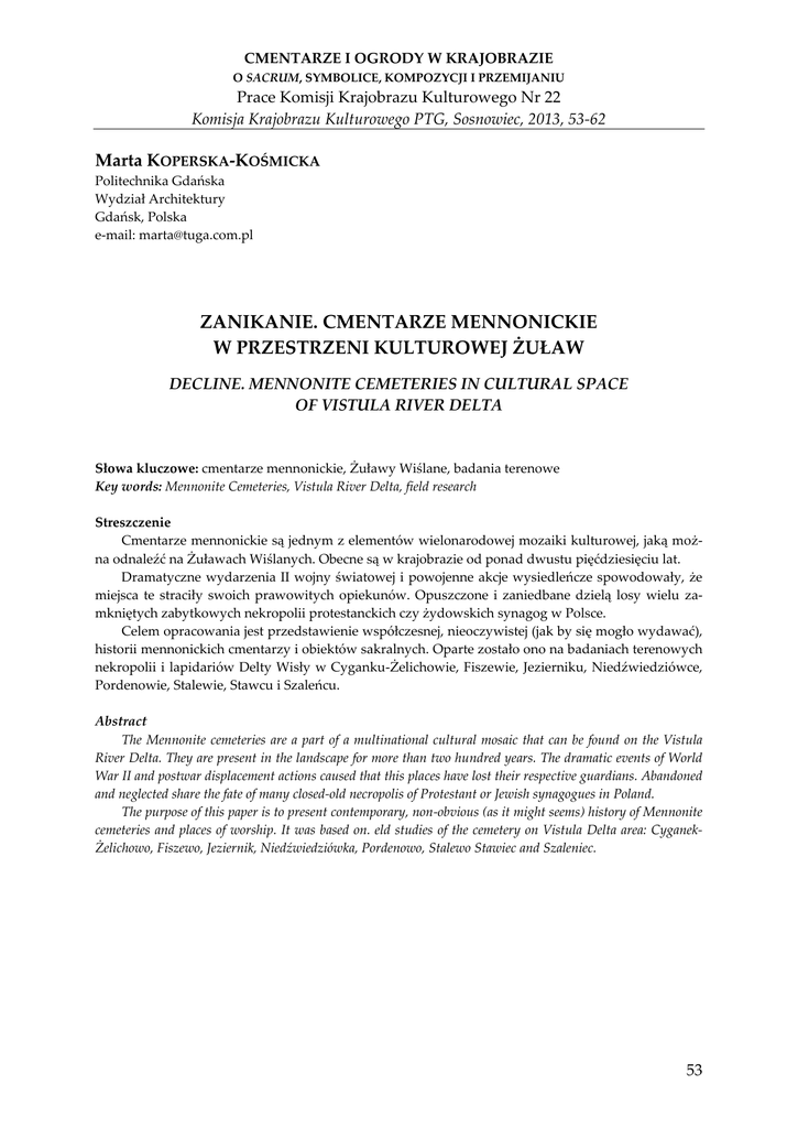 CMENTARZE I OGRODY W KRAJOBRAZIE O SACRUM, SYMBOLICE, KOMPOZYCJI I PRZEMIJANIU Prace Komisji Krajobrazu Kulturowego Nr 22 Komisja Krajobrazu Kulturowego PTG, Sosnowiec, 2013, 53-62 Marta KOPERSKA-KOŚMICKA Politechnika Gdańska Wydział Architektury Gdańsk, Polska e-mail: [email protected] ZANIKANIE. CMENTARZE MENNONICKIE W PRZESTRZENI KULTUROWEJ ŻUŁAW DECLINE. MENNONITE CEMETERIES IN CULTURAL SPACE OF VISTULA RIVER DELTA Słowa kluczowe: cmentarze mennonickie, Żuławy Wiślane, badania terenowe Key words: Mennonite Cemeteries, Vistula River Delta, field research Streszczenie Cmentarze mennonickie są jednym z elementów wielonarodowej mozaiki kulturowej, jaką można odnaleźć na Żuławach Wiślanych. Obecne są w krajobrazie od ponad dwustu pięćdziesięciu lat. Dramatyczne wydarzenia II wojny światowej i powojenne akcje wysiedleńcze spowodowały, że miejsca te straciły swoich prawowitych opiekunów. Opuszczone i zaniedbane dzielą losy wielu zamkniętych zabytkowych nekropolii protestanckich czy żydowskich synagog w Polsce. Celem opracowania jest przedstawienie współczesnej, nieoczywistej (jak by się mogło wydawać), historii mennonickich cmentarzy i obiektów sakralnych. Oparte zostało ono na badaniach terenowych nekropolii i lapidariów Delty Wisły w Cyganku-Żelichowie, Fiszewie, Jezierniku, Niedźwiedziówce, Pordenowie, Stalewie, Stawcu i Szaleńcu. Abstract The Mennonite cemeteries are a part of a multinational cultural mosaic that can be found on the Vistula River Delta. They are present in the landscape for more than two hundred years. The dramatic events of World War II and postwar displacement actions caused that this places have lost their respective guardians. Abandoned and neglected share the fate of many closed-old necropolis of Protestant or Jewish synagogues in Poland. The purpose of this paper is to present contemporary, non-obvious (as it might seems) history of Mennonite cemeteries and places of worship. It was based on. eld studies of the cemetery on Vistula Delta area: CyganekŻelichowo, Fiszewo, Jeziernik, Niedźwiedziówka, Pordenowo, Stalewo Stawiec and Szaleniec. 53 WPROWADZENIE W powszechnej opinii Żuławy Wiślane traktowane są, jako dość monotonny obszar, który mija się jak najszybciej w drodze z Warszawy do Gdańska. To taka „ostatnia prosta” przed wizytą nad morzem. Oglądany zza szyby samochodu krajobraz wydaje się jednostajny i pozornie nie oferuje widzowi żadnego urozmaicenia. Nie bez przyczyny nazwany został krajobrazem dla konesera (Opitz, Sosnowski, 2009) – wymaga od patrzącego pewnego zaangażowania i wiedzy, by przed uważnym i cierpliwym obserwatorem odkryć całą swą różnorodność i bogactwo. Chociaż zawiera on elementy przyrody, jest krajobrazem kulturowym całkowicie ukształtowanym przez człowieka. Właściwie wszystkie jego składniki: budowle, drogi, wały, jak i wydawałoby się naturalne drzewa, woda czy ziemia, są pochodzenia antropogenicznego (Lipińska, 2011). Jego obecny wygląd jest efektem działalności wielu pokoleń osadników, starających przystosować podmokłe tereny depresyjne do zamieszkania i uprawy. Opierając się na literaturze przedmiotu (Mielczarski, Odyniec, 1976) wyróżnić można siedem znaczących epok rozwoju terytorialnego, które miały wpływ na kształt dzisiejszej Delty Wisły: okres przedkrzyżacki do roku 1308, kolonizację fryzyjsko-flamandzką i niemiecką Zakonu w latach 1308-1400, kolonizację olęderską I fazy od połowy XV do połowy XVI w., II fazę kolonizacji olęderskiej do około 1772 r., czasy państwa pruskiego do początków wieku XX, okres nowożytnego państwa niemieckiego i III Rzeszy zakończony II wojną światową, oraz czasy współczesne. Każdy z nich zostawił swoje materialne ślady, możliwe do zaobserwowania w przestrzeni. Tematem artykułu jest przedstawienie problematyki związanej z osadnictwem holenderskim, przejawiającej się między innymi w specyficznej formie, jaką są miejsca pochówku zmarłych, oraz określenie pozycji, jaką zajmuje ona w pejzażu kulturowym Żuław Wiślanych. MENNONICI W DELCIE WISŁY Główna fala kolonizacji niderlandzkiej związana jest z katastrofalnymi powodziami lat 1540 i 1543. Przerwanie wałów pod Kiezmarkiem spowodowało zalanie ponad 100 km gruntów uprawnych i wywołało tak znaczne zniszczenia, że Rada Miasta Gdańska zdecydowała się na szeroko zaplanowaną akcję osadniczą i już w 1547 r. wysłała do Niderlandów Philipa Egzema w celu rekrutacji osadników (Szafran, 1981). Wśród przybyszów wyróżniali się niewątpliwie mennonici (nie tylko z Holandii, ale również z północno-zachodnich Niemiec), którzy mogli cieszyć się tutaj względnymi swobodami religijnymi. Nie była to pełnia praw, gdyż przez prawie przez 150 lat nie mogli oni wznosić swoich zborów czy grzebać zmarłych na własnych cmentarzach – zresztą zakres tolerancji był dla różnych gmin w poszczególnych częściach Żuław różny. Pierwsze przywileje, na mocy których pozwolono im budować domy modlitwy wydał w 1728 r. biskup chełmiński i dotyczyły one zborów gmin fryzyjskich w Barcicach i w Jeziorze. Kolejny z 1751 regulował 54 powstanie budowli w Orłowskim Polu. Następnie powstały zbory flamandzkie w Różewie (1754), Lubieszewie, Stogach, Niedźwiedzicy-Żuławkach i Tujcach (1768r.). Już po pierwszym rozbiorze Polski Rada Miejska Elbląga zgodziła się na budowę zboru w dzisiejszym Władysławowie, a po roku 1800 wybudowano jeszcze drewniane domy modlitwy w Markusach i Pordenowie (Nawrocki, 2007). Zeszło się to w czasie z udzielaniem koncesji na zakładanie osobnych cmentarzy dla innowierców – do tego czasu mennonici chowani byli albo w wydzielonych częściach cmentarzy innych wyznań (katolickich lub ewangelickich) albo też w wolnych kwaterach pomiędzy innymi zmarłymi. PRZESTRZENIE SEPULKRALNE W KRAJOBRAZIE ŻUŁAW Zachowane do dziś w krajobrazie Żuław nekropolie mennoni