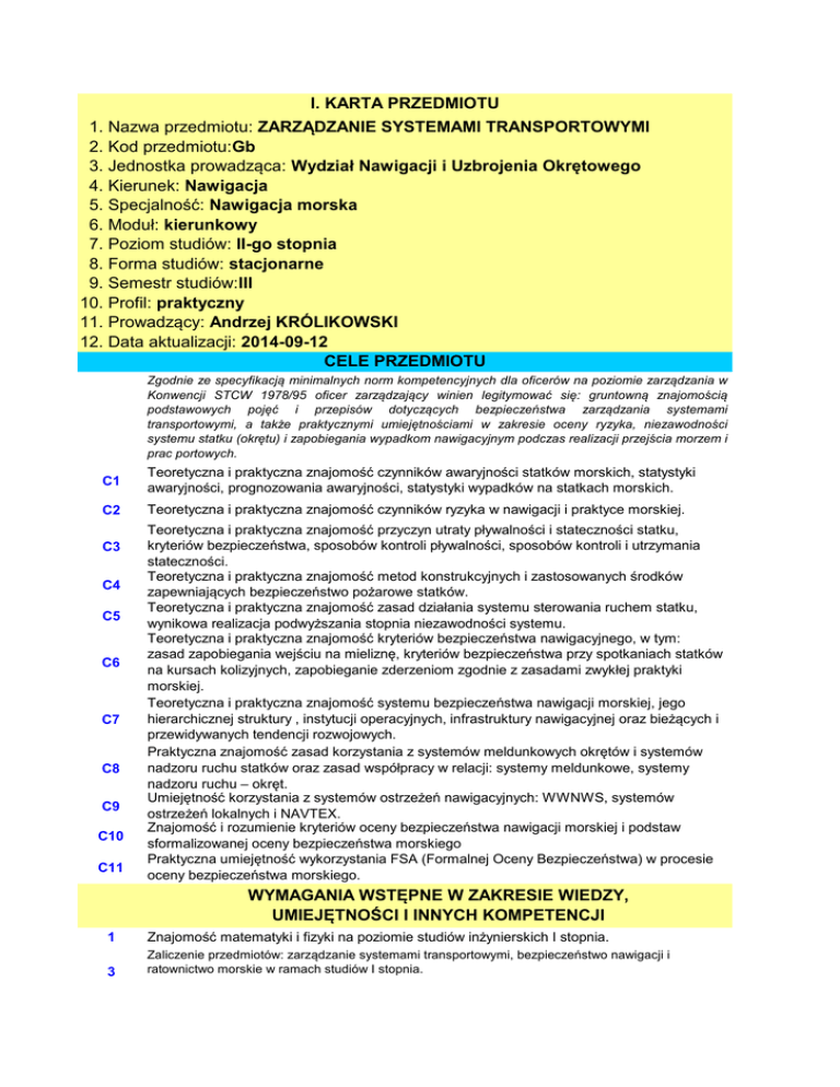 I. KARTA PRZEDMIOTU 1. Nazwa przedmiotu: ZARZĄDZANIE SYSTEMAMI TRANSPORTOWYMI 2. Kod przedmiotu:Gb 3. Jednostka prowadząca: Wydział Nawigacji i Uzbrojenia Okrętowego 4. Kierunek: Nawigacja 5. Specjalność: Nawigacja morska 6. Moduł: kierunkowy 7. Poziom studiów: II-go stopnia 8. Forma studiów: stacjonarne 9. Semestr studiów:III 10. Profil: praktyczny 11. Prowadzący: Andrzej KRÓLIKOWSKI 12. Data aktualizacji: 2014-09-12 CELE PRZEDMIOTU Zgodnie ze specyfikacją minimalnych norm kompetencyjnych dla oficerów na poziomie zarządzania w Konwencji STCW 1978/95 oficer zarządzający winien legitymować się: gruntowną znajomością podstawowych pojęć i przepisów dotyczących bezpieczeństwa zarządzania systemami transportowymi, a także praktycznymi umiejętnościami w zakresie oceny ryzyka, niezawodności systemu statku (okrętu) i zapobiegania wypadkom nawigacyjnym podczas realizacji przejścia morzem i prac portowych. C1 Teoretyczna i praktyczna znajomość czynników awaryjności statków morskich, statystyki awaryjności, prognozowania awaryjności, statystyki wypadków na statkach morskich. C2 Teoretyczna i praktyczna znajomość czynników ryzyka w nawigacji i praktyce morskiej. C3 C4 C5 C6 C7 C8 C9 C10 C11 Teoretyczna i praktyczna znajomość przyczyn utraty pływalności i stateczności statku, kryteriów bezpieczeństwa, sposobów kontroli pływalności, sposobów kontroli i utrzymania stateczności. Teoretyczna i praktyczna znajomość metod konstrukcyjnych i zastosowanych środków zapewniających bezpieczeństwo pożarowe statków. Teoretyczna i praktyczna znajomość zasad działania systemu sterowania ruchem statku, wynikowa realizacja podwyższania stopnia niezawodności systemu. Teoretyczna i praktyczna znajomość kryteriów bezpieczeństwa nawigacyjnego, w tym: zasad zapobiegania wejściu na mieliznę, kryteriów bezpieczeństwa przy spotkaniach statków na kursach kolizyjnych, zapobieganie zderzeniom zgodnie z zasadami zwykłej praktyki morskiej. Teoretyczna i praktyczna znajomość systemu bezpieczeństwa nawigacji morskiej, jego hierarchicznej struktury , instytucji operacyjnych, infrastruktury nawigacyjnej oraz bieżących i przewidywanych tendencji rozwojowych. Praktyczna znajomość zasad korzystania z systemów meldunkowych okrętów i systemów nadzoru ruchu statków oraz zasad współpracy w relacji: systemy meldunkowe, systemy nadzoru ruchu – okręt. Umiejętność korzystania z systemów ostrzeżeń nawigacyjnych: WWNWS, systemów ostrzeżeń lokalnych i NAVTEX. Znajomość i rozumienie kryteriów oceny bezpieczeństwa nawigacji morskiej i podstaw sformalizowanej oceny bezpieczeństwa morskiego Praktyczna umiejętność wykorzystania FSA (Formalnej Oceny Bezpieczeństwa) w procesie oceny bezpieczeństwa morskiego. WYMAGANIA WSTĘPNE W ZAKRESIE WIEDZY, UMIEJĘTNOŚCI I INNYCH KOMPETENCJI 1 Znajomość matematyki i fizyki na poziomie studiów inżynierskich I stopnia. 3 Zaliczenie przedmiotów: zarządzanie systemami transportowymi, bezpieczeństwo nawigacji i ratownictwo morskie w ramach studiów I stopnia. 4 Znajomość nawigacji w zakresie programu przedmiotu Nawigacja I i II EFEKTY KSZTAŁCENIA EK1 Student posiada teoretyczną i praktyczną znajomość czynników awaryjności statków morskich, umie wykonać obliczenia w zakresie statystyki awaryjności. Potrafi prognozować awaryjność systemu, prawidłowo wyciąga wnioski z danych statystycznych odnośnie wypadków na statkach morskich. EK2 Student zna teoretyczne i praktyczne podstawy czynników ryzyka w nawigacji i praktyce morskiej i potrafi je zastosować w działaniu systemu transportowego. EK3 EK4 Student zna teoretyczne i praktyczne przyczyny utraty pływalności i stateczności statku, prawidłowo ocenia kryteria bezpieczeństwa, umie zastosować w praktyce sposoby kontroli pływalności, stateczności i ich utrzymania w warunkach zakłóceń pracy systemu transportowego. Student posiada teoretyczną i praktyczną znajomość metod konstrukcyjnych i zastosowanych środków zapewniających bezpieczeństwo pożarowe statków. EK5 Student zna i rozumie pojęcia dotyczące teorii działania systemu sterowania ruchem statku, umie realizować praktycznie proces podwyższania stopnia niezawodności systemu. EK6 Student posiada szczegółową wiedzę w zakresie teoretycznej znajomości kryteriów bezpieczeństwa nawigacyjnego, w tym: zasad zapobiegania wejściu na mieliznę, kryteriów bezpieczeństwa przy spotkaniach statków na kursach kolizyjnych, zapobieganiu zderzeniom zgodnie z zasadami zwykłej praktyki morskiej i potrafi je zastosować w praktyce. EK7 EK8 EK9 EK10 EK11 Student posiada teoretyczną znajomość systemu bezpieczeństwa nawigacji morskiej, jego hierarchicznej struktury , instytucji operacyjnych, infrastruktury nawigacyjnej oraz bieżących i przewidywanych tendencji rozwojowych. Umie zastosować w praktyce elementy struktury systemu podczas realizacji zadań systemu transportowego. Student posiada praktyczną znajomość zasad korzystania z systemów meldunkowych okrętów i systemów nadzoru ruchu statków oraz zasad współpracy w relacji: systemy meldunkowe, systemy nadzoru ruchu – okręt. Student posiada praktyczną umiejętność korzystania z systemów ostrzeżeń nawigacyjnych: WWNWS, systemów ostrzeżeń lokalnych i NAVTEX. Student zna i rozumie kryteria oceny bezpieczeństwa nawigacji morskiej i podstawy sformalizowanej oceny bezpieczeństwa morskiego oraz umie je zastosować praktycznie podczas zarządzania pracą systemu transportowego. Student posiada praktyczne umiejętności wykorzystania FSA (Formalnej Oceny Bezpieczeństwa) w procesie oceny bezpieczeństwa morskiego w odniesieniu do zarządzania statkiem (okrętem) w ramach systemu transportowego. STRUKTURA PRZEDMIOTU EK1 EK2 EK3 EK4 EK5 Forma zajęćwykłady W1 W2 W3 W4 W5 Liczba godzin 2 1 1 1 1 EK6 EK7 EK8 W6 W7 W8 1 1 1 EK9 EK10 EK11 W9 W10 W11 1 1 1 Forma zajęććwiczenia Liczba godzin C1 C2 2 2 C