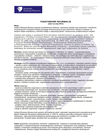 PODSTAWOWE INFORMACJE (stan na maj 2012) Misja Instytut Rozwoju Biznesu poprzez kompleksowe badania, najnowszą wiedzę oraz kreowanie i wdrażanie innowacyjnych rozwiązań buduje przewagę konkurencyjną swoich partnerów. Eksperci Instytutu na każdym etapie współpracy z klientem dbają o najwyższą jakość i skuteczność podejmowanych działań. Ins t yt ut j es t j e dn ą z c z o ło w yc h f irm d or adc zo - s zk o le n i o w yc h n a po l s k im r ynk u. W e ws p ó łp rac y z P o ls k ą F un d ac j ą Ba d ań na d Za r ząd za n i em pr o wa d zi t ak że d zi a ł al n oś ć ba d a wc zą w za k r es ie za r zą d za n i a or g an i za c j ą, w s zc ze g ól n oś c i za s ob am i l ud zk im i. D zi a ł a od 19 9 0 r ok u , a j e go p o pr ze d n ic zk ą, d o 2 00 5 r ok u, b ył a M i ę d z yn a r o do wa Fu nd ac j a Ro z woj u R ynk u Ka p it a ł o we go i Pr zek s zt a łc e ń W łas noś c i o w yc h w R zec zp o s p o l it ej P o l s k iej – Ce nt rum Pr ywa t yz a c j i. I ns t yt ut t o j e d yn y w P o ls c e , n a Uk rai n ie i B i ał or us i p a r tn er N ob l e M a nh at t an C oac h i ng – pres t i żo w ej s zk o ł y c oac h ó w, na l e żą c ej d o p i er ws ze j s zós tk i naj wi ęk s z yc h te g o t yp u or g an i za c j i na ś wi ec ie . Wartości, którymi kieruje się Instytut we współpracy z klientami, to: wiedza – usystematyzowana, sprawdzona i nowoczesna; kompetencje, kwalifikacje i umiejętności kadry zarządzającej, menedżerów i specjalistów; praktyka – zbadana i zdiagnozowana, nie poddająca się schematycznym uogólnieniom; standardy etyczne – ich przestrzeganie najlepszą gwarancją solidności usług Instytutu i dbałości o dobro klientów w każdym projekcie Strategia Instytutu zakłada kompleksowe wspieranie firm, m.in. w budowaniu i wdrażaniu planów rozwoju – zarówno całych organizacji, jak i dotyczących pracowników, w doskonaleniu zarządzania na wszystkich poziomach oraz skutecznym wykonywaniu bieżących zadań. Pomyślną realizację celów strategicznych, o czym świadczą coraz szerszy zakres działalności i powiększający się portfel klientów, Instytut zawdzięcza: - otwartości wobec zmieniających się potrzeb rynku, inwestowaniu w autorskie opracowania nowych narzędzi i metod oraz wdrażaniu nowoczesnych rozwiązań w zakresie: badań i doradztwa, szkoleń w formule zamkniętej i otwartej, coachingu, studiów dla biznesu i projektów unijnych, - wysokiej klasy ekspertom, trenerom i konsultantom, - współpracy partnerskiej z wieloma cenionymi ośrodkami akademickimi z kraju i zagranicy, szkołami biznesu i centrami rozwoju kadr, organizacjami gospodarczymi i pozarządowymi. Oferta obejmuje: - badania problemów organizacji w zakresie zarządzania, ekonomii i psychologii z zastosowaniem nowoczesnej metodologii oraz sprawdzonych na świecie i własnych narzędzi badawczych, - projekty doradcze, oparte na koncepcji współpracy jako interakcji społecznej i na diagnozie problemów objętych procesem doradczym, - szkolenia i studia dla biznesu w formule zamkniętej i otwartej z przywództwa i kompetencji menedżerskich, zarządzania kapitałem ludzkim, sprzedaży, negocjacji i obsługi klienta, zarządzania i marketingu, finansów i rachunkowości, prawa i nadzoru właścicielskiego; - kursy i warsztaty z coachingu systemowego, w tym z międzynarodowymi certyfikacjami w ramach Szkoły Coachingu Noble Manhattan i Instytutu Rozwoju Biznesu, - projekty unijne, dofinansowane z EFS, otwarte i zamknięte, - konferencje i spotkania eksperckie dla praktyków HR -usługi w zakresie organizacji i logistyki konferencji i szkoleń. Instytut Rozwoju Biznesu jest wpisany do ewidencji szkół i placówek niepublicznych prowadzonej przez Miasto Stołeczne Warszawa (Zaświadczenie nr 12/K/10, wydane przez Biuro Edukacji Urzędu m.st. Warszawy). Jako placówka kształcenia ustawicznego jest zwolniona z podatku VAT na usługi szkoleniowe. Posiada także certyfikat ISO na szkolenia i usługi doradcze. Kadra ekspertów, konsultantów, trenerów i wykładowców Instytutu to wysokiej klasy eksperci i specjaliści z międzynarodowym doświadczeniem naukowym i badawczym oraz praktyką w biznesie. Ogółem z Instytutem współpracuje ponad 100-osobowe grono ekspertów, konsultantów, trenerów i wykładowców. Wiedza, bogate doświadczenie praktyczne, umiejętność tworzenia atrakcyjnych projektów edukacyjnych, doradczych i badawczych to cenny intelektualny potencjał Instytutu, który pozwala oferować organizacjom interdyscyplinarne i spójne programy rozwoju, odpowiadające potrzebom nowoczesnego biznesu i uwzględniające najnowsze światowe tendencje i wzorce. Partnerami Instytutu są cenione polskie i zagraniczne ośrodki akademickie oraz centra rozwoju kadr kierowniczych. Ta współpraca zapewnia: - dostęp do najnowszej wiedzy i sprawdzonych na świecie metodologii badawczych i doradczych, - tworzenie nowoczesnych rozwiązań i narzędzi biznesowych, - oferowanie certyfikowanych programów szkoleniowych, realizowanych na podstawie licencji prestiżowych organizacji, - udział wykładowców cieszących się międzynarodowym uznaniem, - opracowywanie kompleksowych programów rozwojowych dla organizacji, zwiększających ich zdolność konkurencyjną i wartość rynkową. Władze Instytutu: Włodzimierz K. Buśkiewicz – Prezes Zarządu Mira Dziedzic-Hanc – Wiceprezes Zarządu ds. Programowych dr Olaf P. Żylicz – Wiceprezes Zarządu ds. Naukowych Elżbieta Chlastawa – Wiceprezes Zarządu ds. Finansowych Adresy i kontakt: ul. Panieńska 9, 03-704 Warszawa, tel. 22 618 85 83 – biuro ul. Wyzwolenia 63, 05-140 Serock, tel. 22 782-78-87 – biuro i Centrum Konferencyjne ul. Sienna 73, 00-833 Warszawa, tel. 22 820 29 11 – Centrum Szkoleniowe e-mail: [email protected] www.irb.pl