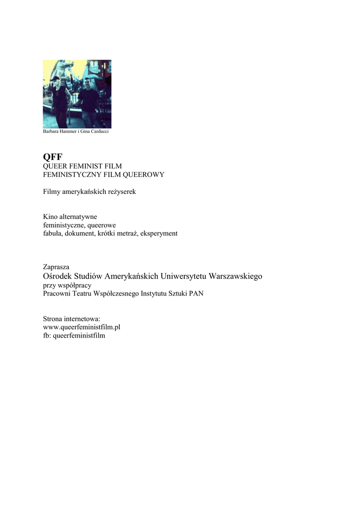 Barbara Hammer i Gina Carducci QFF QUEER FEMINIST FILM FEMINISTYCZNY FILM QUEEROWY Filmy amerykańskich reżyserek Kino alternatywne feministyczne, queerowe fabuła, dokument, krótki metraż, eksperyment Zaprasza Ośrodek Studiów Amerykańskich Uniwersytetu Warszawskiego przy współpracy Pracowni Teatru Współczesnego Instytutu Sztuki PAN Strona internetowa: www.queerfeministfilm.pl fb: queerfeministfilm PROGRAM Projekcje odbywają się w Ośrodku Studiów Amerykańskich UW Al. Niepodległości 22, Warszawa Metro Wilanowska, autobusy: 174, 700 (przyst. Ksawerów), Tramwaje: 4, 10, 14, 31, 35 (przyst. Wilanowska) Wszystkie filmy w języku angielskim 3 listopada 2014, godz. 18.00 Barbara Hammer: Dyketactics (1974, 4 min.), Multiple Orgasm (1976, 6 min.), Double Strength (1978, 20 min.), Still Point (1989, 9 min.), Sanctus (1990, 20 min.), Generations (2010, 30 min.) Liz Rosenfeld, Dyketactics Revisited (2005, 13 min) 1 grudnia 2014, godz. 18.00 Su Friedrich: The Ties that Bind (1985, 55 min.), Damned if You Don’t (1987, 42 min) 12 stycznia 2015, godz. 18.00 Cheryl Dunye, The Watermelon Woman (1996, 90 min.) 2 lutego 2015, godz. 18.00 Carole Roussopoulos, "SCUM" (1976, 26 min.) Mary Harron, I Shot Andy Warhol (1996, 103 min.) 2 marca 2015, godz. 18.00 Yvonne Rainer, MURDER and murder (1996, 113 min.) 6 kwietnia 2015, godz. 18.00 Silas Howard i Harry Dodge, By Hook or by Crook (2001, 98 min.) Sadie Benning, shorts 4 maja 2015, godz. 18.00 Jenny Livigstone, Paris Is Burning (1990, 71 min.) Daniel Peddle, The Aggressives (2005, 75 min.) 1 czerwca 2015, godz. 18.00 seriale, seriale "The L Word" vs. "Lip Service"; "F to 7th"; "Orange is the New Black" QUEER FEMINIST FILM FEMINISTYCZNY FILM QUEEROWY Nasz cykl filmowy ma na celu przybliżenie polskim odbiorczyniom i odbiorcom twórczości amerykańskich niezależnych feministycznych reżyserek podejmujących tematy genderowe i kwestie nienormatywnej seksualności. Proponujemy przegląd kina radykalnego zarówno pod względem formalnym jak i tematycznym. Od wczesnego feminizmu lesbijskiego w filmach Barbary Hammer i Su Friedrich, przez afroamerykańskie rozmyślania nad nieheteronormatywną historią, stare kobiety odkrywające lesbijską seksualność i dokumenty o scenie drag, do współczesnego kina, gdzie płeć przestaje być jednoznaczna. Zapraszamy do rozmowy o paradoksach niewidoczności kobiet w historii kina awangardowego i niewidoczności kina formalnie radykalnego w historii feminizmu i ruchów LGBTQ. Czy kino eksperymentalne może być skuteczne politycznie? Czy tworzy własne kategorie estetyczne? Na czym polega „trudność” czy „nieprzyswajalność” filmów elsperymentalnych i czy sama w sobie ma wartość poznawczą? Przegląd kina ostatnich pięciu dekad pozwoli nam przyjrzeć się ewolucji koncepcji gender, tożsamości, ciała, seksualności, oraz zmieniającym się priorytetom działaczek i działaczy feministycznych, LGBTQ i związanych z nimi innych ruchów politycznych.