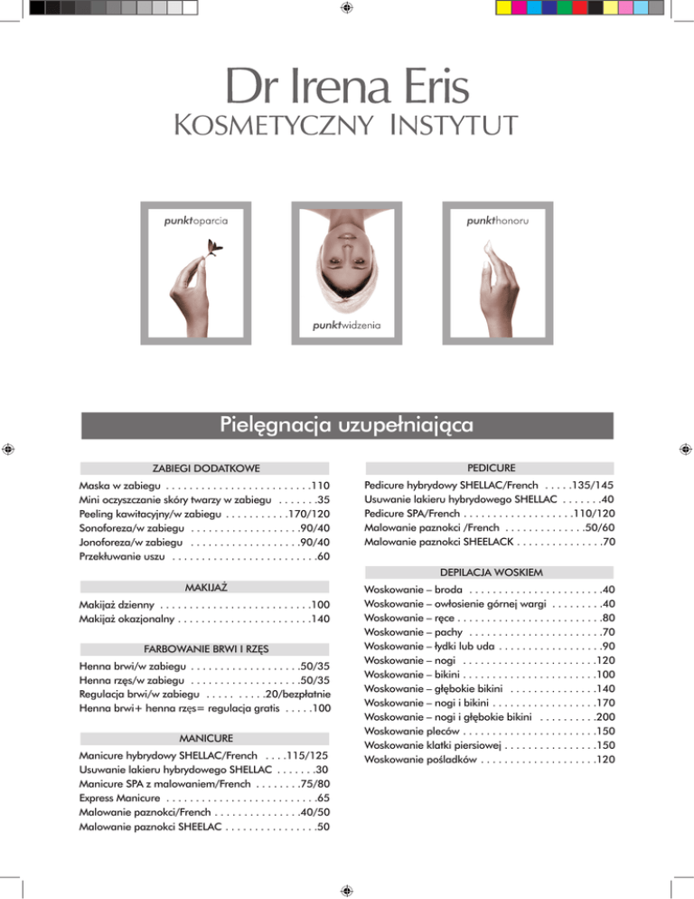 Piel´gnacja uzupełniajàca ZABIEGI DODATKOWE PEDICURE Maska w zabiegu . . . . . . . . . . . . . . . . . . . . . . . . .110 Mini oczyszczanie skóry twarzy w zabiegu . . . . . . .35 Peeling kawitacyjny/w zabiegu . . . . . . . . . . .170/120 Sonoforeza/w zabiegu . . . . . . . . . . . . . . . . . . .90/40 Jonoforeza/w zabiegu . . . . . . . . . . . . . . . . . . .90/40 Przekłuwanie uszu . . . . . . . . . . . . . . . . . . . . . . . . .60 Pedicure hybrydowy SHELLAC/French . . . . .135/145 Usuwanie lakieru hybrydowego SHELLAC . . . . . . .40 Pedicure SPA/French . . . . . . . . . . . . . . . . . . .110/120 Malowanie paznokci /French . . . . . . . . . . . . . .50/60 Malowanie paznokci SHEELACK . . . . . . . . . . . . . . .70 DEPILACJA WOSKIEM MAKIJA˚ Makija˝ dzienny . . . . . . . . . . . . . . . . . . . . . . . . . .100 Makija˝ okazjonalny . . . . . . . . . . . . . . . . . . . . . . .140 FARBOWANIE BRWI I RZ¢S Henna brwi/w zabiegu . . . . . . . . . . . . . . . . . . .50/35 Henna rz´s/w zabiegu . . . . . . . . . . . . . . . . . . .50/35 Regulacja brwi/w zabiegu . . . . . . . . . .20/bezpłatnie Henna brwi+ henna rzęs= regulacja gratis . . . . .100 MANICURE Manicure hybrydowy SHELLAC/French . . . .115/125 Usuwanie lakieru hybrydowego SHELLAC . . . . . . .30 Manicure SPA z malowaniem/French . . . . . . . .75/80 Express Manicure . . . . . . . . . . . . . . . . . . . . . . . . . .65 Malowanie paznokci/French . . . . . . . . . . . . . . .40/50 Malowanie paznokci SHEELAC . . . . . . . . . . . . . . . .50 Woskowanie – broda . . . . . . . . . . . . . . . . . . . . . . .40 Woskowanie – owłosienie górnej wargi . . . . . . . . .40 Woskowanie – r´ce . . . . . . . . . . . . . . . . . . . . . . . . .80 Woskowanie – pachy . . . . . . . . . . . . . . . . . . . . . . .70 Woskowanie – łydki lub uda . . . . . . . . . . . . . . . . . .90 Woskowanie – nogi . . . . . . . . . . . . . . . . . . . . . . .120 Woskowanie – bikini . . . . . . . . . . . . . . . . . . . . . . .100 Woskowanie – gł´bokie bikini . . . . . . . . . . . . . . .140 Woskowanie – nogi i bikini . . . . . . . . . . . . . . . . . .170 Woskowanie – nogi i gł´bokie bikini . . . . . . . . . .200 Woskowanie pleców . . . . . . . . . . . . . . . . . . . . . . .150 Woskowanie klatki piersiowej . . . . . . . . . . . . . . . .150 Woskowanie poÊladków . . . . . . . . . . . . . . . . . . . .120