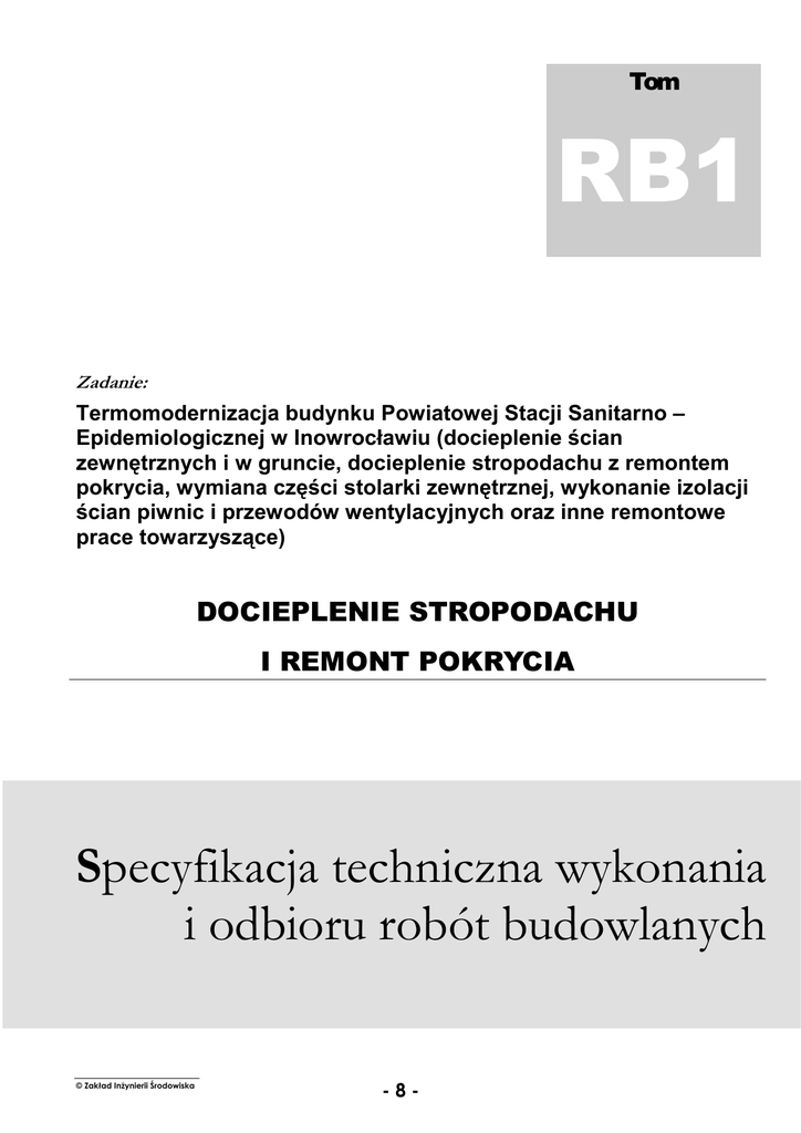 Tom RB1 Zadanie: Termomodernizacja budynku Powiatowej Stacji Sanitarno – Epidemiologicznej w Inowrocławiu (docieplenie ścian zewnętrznych i w gruncie, docieplenie stropodachu z remontem pokrycia, wymiana części stolarki zewnętrznej, wykonanie izolacji ścian piwnic i przewodów wentylacyjnych oraz inne remontowe prace towarzyszące) DOCIEPLENIE STROPODACHU I REMONT POKRYCIA Specyfikacja techniczna wykonania i odbioru robót budowlanych © Zakład Inżynierii Środowiska -8- 1. Wstęp 1.1. Przedmiot specyfikacji Przedmiotem niniejszej specyfikacji technicznej są wymagania dotyczące wykonania i odbioru robót związanych z dociepleniem stropodachu i remontem pokrycia wraz z innymi robotami towarzyszącymi związanymi z wymianą instalacji odgromowej, wymianą obróbek blacharskich, itp. w obiekcie objętym zamówieniem. 1.2. Zakres stosowania specyfikacji Szczegółowa specyfikacja techniczna jest stosowana jako dokument przetargowy i kontraktowy przy zlecaniu i realizacji robót wymienionych w pkt. 1.1. 1.3. Zakres robót objętych specyfikacją Roboty, których dotyczy specyfikacja, obejmują wszystkie czynności umożliwiające i mające na celu wykonanie docieplenia stropodachu. 45400000-1 Roboty wykończeniowe w zakresie obiektów budowlanych. Izolacje cieplne dachu. 1.4. Ogólne wymagania dotyczące robót Wykonawca robót jest odpowiedzialny za jakość ich wykonania oraz za zgodność z dokumentacją projektową, niniejszą specyfikacją, poleceniami inspektora nadzoru, a także za prowadzenie robót zgodnie z zasadami Bezpieczeństwa i Higieny Pracy. 2. Podstawowe materiały 2.1. Podstawowe materiały a) Granulowana wełna mineralna GRANROCK wg AT-15-6189/2003, PAROC GRAN wg AT/9911-008 itp. o współczynniku przewodzenia ciepła λ < 0,045[W/m2K] b) Blachy stalowe gr. 4mm ze stali St0S. c) Płyty styropianowe frezowane EPS 100 – 038 DACH/PODŁOGA zgodnie z PN-B-20132:2005 oraz spełniające następujące wymagania wg PN-EN 13163:2004 d) Farby chlorokauczukowe PN-C-81910:2002. e) Blacha stalowa ocynkowana gr. 0,6 mm. f) Emulsja do gruntowania np. EMAILLIT BV-extra. g) Klej poliuretanowy np. DEKO. h) Kołki teleskopowe do płyt z wełny mineralnej. i) Bale drewniane impregnowane. j) Papa podkładowa samoprzylepna np. VEDATOP TM modyfikowaną SBS na siatce szklanej spełniająca następujące wymagania: - osnowa z siatki szklanej o gramaturze 120g/m2, - grubość min. 1,7 mm, - siła zrywająca przy rozciąganiu wzdłuż/poprzek włókien: 1100N/1100N - wydłużenie przy maksymalnej sile rozciągającej wzdłuż/poprzek włókien: 2% - dolna granica elastyczności -30o - odporność na wysokie temp. +100o - wodoszczelność 200 kPa (24H) k) Papa nawierzchniowa np. VEDATECT EUROFLEX PYE PV 250 S5 modyfikowaną SBS na włókninie poliestrowej spełniająca następujące wymagania: - osnowa z włókniny poliestrowej o gramaturze 250g/m2, - grubość min. 5,2 mm, © Zakład Inżynierii Środowiska -9- l) - siła zrywająca przy rozciąganiu wzdłuż/poprzek włókien: 800N/800N - wydłużenie przy maksymalnej sile rozciągającej wzdłuż/poprzek włókien: 35% - dolna granica elastyczności -25o - odporność na wysokie temp. +100o - wodoszczelność 200 kPa (24H) Kit trwale plastyczny. m) Rynny z blachy stalowej powlekanej np. Galeco stal 150/100, RAL8019 n) Silikonowa masa do uszczelniania spoin. o) Kołki rozporowe i gwoździe ocynkowane. p) Zestaw elementów do mocowania instalacji odgromowej. q) Zaprawa cementowa M15. 3. Sprzęt Należy spełnić wymagania podane w Części I niniejszej specyfikacji. 4. Transport Należy spełnić wymagania podane w Części I niniejszej specyfikacji. 5. Wykonanie robót 5.1. Wykonanie robót związanych z ociepleniem stropodachów. a) Po odkryciu stropodachu należy dokonać oceny stanu technicznego istniejącej warstwy izolacji cieplnej. b) Roboty należy wykonywać zgodnie z instrukcją stosowania wyrobu dostarczoną na budowę wraz z materiałem, c) Ułożenie granulowanej wełny mineralnej należy wykonywać za pomocą agregatu do transportu pneumatycznego materiałów sypkich. d) Termoizolacja wymagania: z granulowanej wełny mineralnej powinna spełniać następujące - gęstość ułożonego granulatu jest producenta, zgodna z wielkością deklarowaną przez - wilgotność granulatu nie przekracza 2%, - grubość układanej izolacji wynosi nie mniej niż 28cm, - termoizolacja ułożona zostanie równą warstwą, bez przerw i ubytków, tzw. kieszeni, - termoizolacja nie zakrywa otworów wentylacyjnych. e) Kontrola izolacji cieplnej z granulowanej wełny mineralnej - szklanej obejmuje sprawdzenie grubości izolacji. Prawidłowość wykonania termoizolacji sprawdza się kontrolując masę wprowadzonego granulatu i przeprowadzając oględziny. Podczas prowadzenia prac dociepleniowych należy zapewnić stałą kontrolę równomierności rozłożonego granulatu np. za pomocą kamery zaopatrzonej w giętki peryskop, który umożliwia wprowadzenie obiektywu w przestrzeń międzydachową. f) Termoizolacja z wełny mineralnej powinna spełniać następujące wymagania: - Wełnę kleić do podłoża klejem poliuretanowym metodą pasmową 300g/m2 i dodatkowo kołkować. - Izolacja powinna być ciągłą, bez prześwitów. © Zakład Inżynierii Środowiska - 10 - - Połączenia przed położeniem papy samoprzylepnej należy wyrównać przez szlifowanie. g) Papę mocować zgodnie instrukcją montażu dostarczoną przez producenta wyrobu. Szerokość zakładów arkuszy papy w każdej warstwie powinna wynosić co najmniej 10 cm , należy je wykonać zgodnie z kierunkiem spadku połaci. h) Spadek dachu w żadnym miejscu nie powinien być nie mniejszy niż 3%. Niedopuszczalne są zagłębienia podłoża powodujące zastoiska wody na dachu. a) Kołnierze ścian i kominów wyprowadzić min. 15 cm powyżej pokrycia i zabezpieczyć listwą z blachy stalowej ocynkowanej. b) Pokrycie dachu należy wykonać zgodnie z wymaganiami PN-80/B-10240 oraz ins