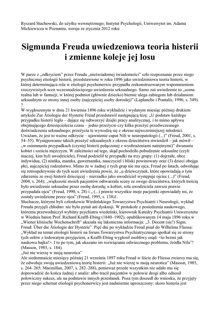 Ryszard Stachowski, do u ytku wewn trznego; Instytut Psychologii, Uniwersytet im. Adama Mickiewicza w Poznaniu, wersja ze stycznia 2012 roku Sigmunda Freuda uwiedzeniowa teoria histerii i zmienne koleje jej losu W parze z „odkryciem” przez Freuda „nie wiadomej wiadomo ci” szøo rozpoznanie przez niego psychicznej etiologii histerii, przedstawione w roku 1896 jako uwiedzeniowa teoria histerii, w której determinuj ca rola w etiologii psychonerwic przypadøa zrekonstruowanym wspomnieniom rzeczywistych scen wczesnodzieci cego uwiedzenia seksualnego. Samo za uwiedzenie to „scena realna lub w fantazji, w której podmiot (gøównie dziecko) biernie ulega zabiegom lub dziaøaniom seksualnym ze strony innej osoby (najcz ciej osoby dorosøej)” (Laplanche i Pontalis, 1996, s. 349). ? W wygøoszonym w dniu 21 kwietnia 1896 roku wykøadzie i wydanym miesi c pó niej drukiem artykule Zur Ätiologie der Hysterie Freud przedstawiø nast puj c tez : „U podstaw ka dego przypadku histerii legøo – daj ce si odtworzy dzi ki pracy analitycznej, i to mimo upøywu obejmuj cego dziesi ciolecia czasu – jedno prze ycie czy kilka prze y przedwczesnego do wiadczenia seksualnego; prze ycia te wywodz si z okresu najwcze niejszej møodo ci. Uwa am, e jest to wa ne odkrycie – ujawnienie caput Nili w neuropatologii (...)” (Freud, 2001, s. 54–55). Wyst powanie takich prze y seksualnych z okresu dzieci stwa stwierdziø – jak mówiø – „w osiemnastu przypadkach (czystej histerii poø czonej z wyobra eniami natr tnymi)” dwunastu kobiet i sze ciu m czyzn. W zale no ci od tego, sk d pochodziøo pobudzenie seksualne (czyli inaczej, kim byli uwodziciele), Freud podzieliø te przypadki na trzy grupy: (1) dojrzaøe, obce indywidua, (2) nia ka, mamka, guwernantka, nauczyciel i bliski powinowaty oraz (3) dzieci obojga pøci, najcz ciej rodze stwo. Mimo e w adnej z tych grup nie ma ojca, Freud po latach, odwoøuj c si retrospektywnie do tych scen uwiedzenia powie, e „u dziewczynek, które opowiadaj o tym zdarzeniu ze swej historii dzieci cej – nierzadko jako uwodziciel wyst puje ojciec (...)” (Freud, 2004, s. 264); „wi kszo moich pacjentów odtwarzaøa sceny ze swego dzieci stwa, których tre ci byøo uwiedzenie seksualne przez osob dorosø ; u kobiet, rola uwodziciela zawsze prawie przypadaøa ojcu” (Freud, 1990, s. 28) i „ (...) prawie wszystkie moje pacjentki opowiadaøy mi, e zostaøy uwiedzione przez ojca” (Freud, 1995, s. 138)1. Søuchacze, którymi byli czøonkowie Wiede skiego Towarzystwa Psychiatrii i Neurologii, wykøad Freuda przyj li chøodno: nie byøo pyta ani dyskusji. W protokole z posiedzenia naukowego, któremu przewodniczyø wybitny psychiatra wiede ski, kierownik Katedry Psychiatrii Uniwersytetu w Wiedniu baron Prof. Richard Krafft-Ebing (1840–1902), opublikowanym 14 maja 1896 roku w „Wiener klinische Wochenschrift” ukazaøa si lakoniczna informacja: „3. Docent (sic!) Sigm. Freud: Über die Ätiologie der Hysterie”. Pi dni po wykøadzie Freud pisaø do Wilhelma Fliessa: „Wykøad na temat etiologii histerii na forum Towarzystwa Psychiatrycznego spotkaø si ze strony tych osøów z lodowatym przyj ciem, a Krafft-Ebing wygøosiø osobliwy os d: <to brzmi jak naukowa bajka!>. I to po tym, jak ukazano im rozwi zanie odwiecznego problemu, ródøa Nilu”! (Masson, 1985, s. 184). „Ju nie wierz w moj neurotica” Ale siedemna cie miesi cy pó niej 21 wrze nia 1897 roku Freud w li cie do Fliessa zwierzy mu si , e odwoøuje swoj uwiedzeniow teori histerii: „Ju nie wierz w moj neurotica” (Masson, 1985, s. 264–265; Macmillan, 2007, s. 282–288), poniewa przede wszystkim nie udaøo mu si doprowadzi do ko ca adnej z analiz: albo traciø pacjentów w poøowie drogi albo odnosiø poøowiczny sukces, ale na podstawie innych przesøanek. Poza tym doszedø do wniosku, e przyj ty przez niego schemat etiologii psychonerwicy jest nadmiernie uproszczony: skoro histeria jest zjawiskiem tak powszechnym, to „we wszystkich wypadkach nale aøoby oskar y ojca, z moim wø cznie, o perwersyjne 1 1 Z tymi retrospektywnymi relacjami Freuda køóci si wypowied prof. Zofii Rosi skiej (2002, s. 6), wedøug której sens caøo ci koncepcji psychoanalizy, jej intencja, „ujawnia si , gdy ledzimy konsekwencj w rozwoju my li Freuda (...) Konsekwencja my li, jak obserwujemy w tym procesie, ujawnia si w caøej peøni ex post, tzn. je eli rozpatrujemy prace napisane wcze niej po zapoznaniu si z pracami pó niejszymi”. Poza tym, je eli takie perwersyjne zachowanie ojców miaøoby by jedyn przyczyn histerii, to musiaøoby wyst powa powszechnie, poniewa przypadków histerii zawsze jest mniej ni jej mo liwych przyczyn: „a takie rozpowszechnienie perwersji jest raczej niemo liwe”. Wreszcie jest rzecz pewn , e „w nie wiadomo ci nie ma adnych oznak rzeczywisto ci i dlatego nie sposób odró ni prawdy od emocjonalnie naøadowanej fikcji” (por. Crews, 2001, s. 75–76; Gay, 2003, s. 106). Ale do publicznej wiadomo ci Freud poda swoj decyzj dopiero po dziewi ciu (!) latach w trzech artykuøach opublikowanych w roku 1906 (dwa z nich s dost pne w j zyku polskim: Freud, 1999a, s. 135 oraz Freud, 1999b, s. 82). Jednak e podane tam powody porzucenia teorii s sprzeczne: w pierwszym artykule pisze, e przeceniaø wówczas, tj. w 1896 roku cz stotliwo tych aktów wczesnodzieci cego uwiedzenia seksualnego, w drugim – e nie mo e powiedzie , i je przeceniaø. Pierwsze w peøni wyartykuøowane wyja nienie powodu odwoøania uwiedzeniowej teorii histerii Freud upubliczni dopiero w roku 1914: „Na drodze [do zbudowania psychoanalizy] trzeba byøo upora si z bø dnym pomysøem, który omal nie okazaø si zgubny w skutkach dla møodej nauki. Pod wpøywem urazowej teorii histerii, nawi zuj cej do Charcota, byøem raczej skøonny uzna za realne i za doniosøe pod wzgl dem etiologicznym relacje pacjentów, sprowadzaj ce objawy chorobowe do biernych prze y seksualnych wczesnego dzieci stwa, a mówi c po p