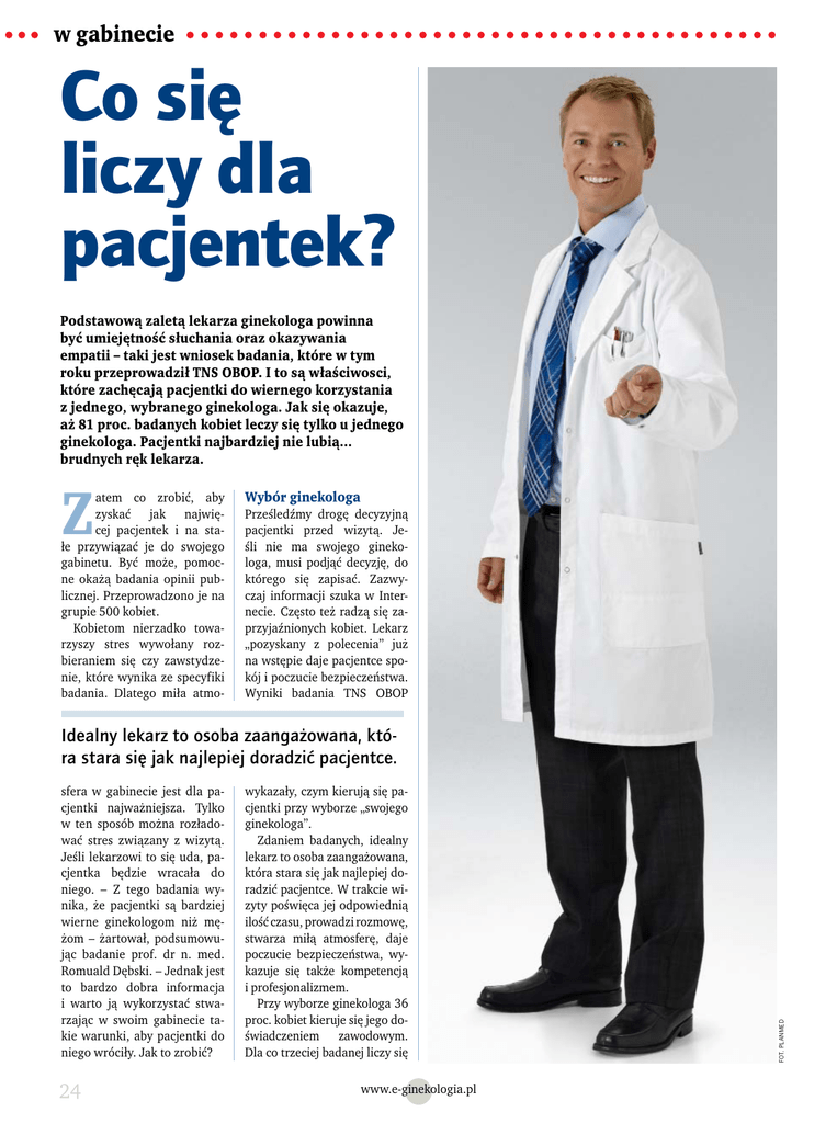 w gabinecie Co się liczy dla pacjentek? Podstawową zaletą lekarza ginekologa powinna być umiejętność słuchania oraz okazywania empatii – taki jest wniosek badania, które w tym roku przeprowadził TNS OBOP. I to są właściwosci, które zachęcają pacjentki do wiernego korzystania z jednego, wybranego ginekologa. Jak się okazuje, aż 81 proc. badanych kobiet leczy się tylko u jednego ginekologa. Pacjentki najbardziej nie lubią… brudnych ręk lekarza. Z atem co zrobić, aby zyskać jak najwięcej pacjentek i na stałe przywiązać je do swojego gabinetu. Być może, pomocne okażą badania opinii publicznej. Przeprowadzono je na grupie 500 kobiet. Kobietom nierzadko towarzyszy stres wywołany rozbieraniem się czy zawstydzenie, które wynika ze specyfiki badania. Dlatego miła atmo- Wybór ginekologa Prześledźmy drogę decyzyjną pacjentki przed wizytą. Jeśli nie ma swojego ginekologa, musi podjąć decyzję, do którego się zapisać. Zazwyczaj informacji szuka w Internecie. Często też radzą się zaprzyjaźnionych kobiet. Lekarz „pozyskany z polecenia” już na wstępie daje pacjentce spokój i poczucie bezpieczeństwa. Wyniki badania TNS OBOP sfera w gabinecie jest dla pacjentki najważniejsza. Tylko w ten sposób można rozładować stres związany z wizytą. Jeśli lekarzowi to się uda, pacjentka będzie wracała do niego. – Z tego badania wynika, że pacjentki są bardziej wierne ginekologom niż mężom – żartował, podsumowując badanie prof. dr n. med. Romuald Dębski. – Jednak jest to bardzo dobra informacja i warto ją wykorzystać stwarzając w swoim gabinecie takie warunki, aby pacjentki do niego wróciły. Jak to zrobić? 24 wykazały, czym kierują się pacjentki przy wyborze „swojego ginekologa”. Zdaniem badanych, idealny lekarz to osoba zaangażowana, która stara się jak najlepiej doradzić pacjentce. W trakcie wizyty poświęca jej odpowiednią ilość czasu, prowadzi rozmowę, stwarza miłą atmosferę, daje poczucie bezpieczeństwa, wykazuje się także kompetencją i profesjonalizmem. Przy wyborze ginekologa 36 proc. kobiet kieruje się jego doświadczeniem zawodowym. Dla co trzeciej badanej liczy się www.e-ginekologia.pl FOT. PLANMED Idealny lekarz to osoba zaangażowana, która stara się jak najlepiej doradzić pacjentce. w gabinecie duże doświadczenie zawodowe 36% traktowanie pacjentki z szacunkiem\wysoka kultura osobista 36% umiejętność stworzenia odpowiedniej, bezstresowej atmosfery podczas wizyty 32% 28% udzielanie wyczerpujących informacji pacjentce taktowne traktowanie, taktowne rozmawianie o problemach ginekologicznych 24% 21% zaangażowanie w rozwiązywanie problemu pacjentki 10% bliskość miejsca zamieszkania\miejsca pracy 7% osiągnięcia i dorobek naukowy inna cecha 2% N=500 Wykres 1. Jakie czynniki wpływają na wybór lekarza ginekologa kultura osobista i traktowanie pacjentki z szacunkiem. Również dla co trzeciej istotna jest umiejętność tworzenia przez lekarza bezstresowej atmosfery podczas wizyty i uzyskanie wyczerpujących informacji. Tylko nieliczny procent badanych kobiet bierze pod uwagę tytuły naukowe, osiągnięcia i napisane przez ginekologa prace naukowe. To badanie pokazuje, na co tak naprawdę zwracają uwagę pacjentki. I jak się okazuje, gdyby ginekolodzy tworzyli sami taką listę, prawdopodobnie najistotniejsze dla nich czynniki były by te, które zupełnie nie są istotne dla pacjentek. Co dla pacjentki znaczy miła atmosfera? Otóż, jak się okazuje, kobieta chce być traktowana podmiotowo, a nie przedmiotowo. Przede wszystkim oczekuje od swojego lekarza, aby umiał wysłuchać tego, co ma ona do powiedzenia. Dla pacjentki jest to dużo ważniejsze niż samo badanie. Dla niej jest to wyjątkowa sytuacja, do której przygotowuje się od kilku dni i denerwuje się. Dla lekarza jest to kolejna pacjentka tego samego dnia. I to jest ta zasadnicza różnica. Jak budować swoje nastawienie do pacjentek? Wierne ginekologom Pani, która znajdzie już „idealnego” lekarza, jest wobec niego lojalna. 81 proc. badanych deklaruje, że leczy się u jednego lekarza. Jest to zazwyczaj stały wybór na wiele lat lub nawet całe dorosłe życie pacjentki. - Ze względu na wyjątkowość relacji między pacjentką a ginekologiem - położnikiem, lekarz tej specjalności często towarzyszy swojej pacjentce przez kilkadziesiąt lat jej życia, począwszy od urodzin, aż do późnej starości – mówi profesor Tomasz Paszkowski – Pre- Najbardziej nobilitująca dla lekarza jest sytuacja, gdy pacjentka przyprowadza na wizytę swoją córkę. www.e-ginekologia.pl zes Polskiego Towarzystwa Menopauzy i Andropauzy. Najbardziej nobilitująca dla lekarza jest sytuacja, gdy pacjentka przyprowadza na wizytę swoją córkę. Wcale do rzadkości nie należą sytuacje, kiedy do tego samego lekarza chodzi babcia, córka i wnuczka. Taka sytuacja również jest najlepsza dla kobiet, które pierwszy raz idą do ginekologa. Oczywiście nadopiekuńczość mamy nie jest wskazana, ale podczas pierwszej wizyty dobrze, aby towarzyszyła córce. 25 w gabinecie brak higieny, nieschludność, np. nieświeży oddech, zaniedbane dłonie, brudny ubiór 57% brak kompetencji lekarza, brak zaufania co do wiedzy, umiejętności lekarza 46% niski poziom kultury osobistej\wyniosłe traktowanie pacjentki prowadzenie wizyty w sposób schematyczny, brak indywidualnego podejścia do problemu pacjentki nieumiejętność taktownego traktowania, taktownego rozmawiania o problemach ginekologicznych nieumiejętność stworzenia przyjaznej, bezstresowej atmosfery w czasie wizyty 29% 25% 21% 16% N=500 Wykres 2. Co powoduje, że do danego lekarza już nie pójdziesz? Brudne ręce lekarza ście do pacjentki. - Kobiety wiedzą, czego oczekują od lekarza. Obok doświadczenia zawodowego i kompetencji nie mniej ważne jest dla pacjentek, jak my ginekolodzy wyglądamy, jak się do nich zwracamy, ile mamy dla nich czasu, na ile umiemy zredukowa