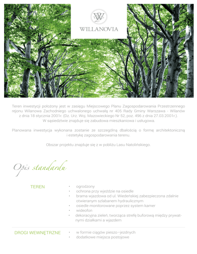 Teren inwestycji położony jest w zasięgu Miejscowego Planu Zagospodarowania Przestrzennego rejonu Wilanowa Zachodniego uchwalonego uchwałą nr 405 Rady Gminy Warszawa - Wilanów z dnia 18 stycznia 2001r. (Dz. Urz. Woj. Mazowieckiego Nr 52, poz. 496 z dnia 27.03.2001r.). W sąsiedztwie znajduje się zabudowa mieszkaniowa i usługowa. Planowana inwestycja wykonana zostanie ze szczególną dbałością o formę architektoniczną i estetykę zagospodarowania terenu. Obszar projektu znajduje się z w pobliżu Lasu Natolińskiego. Opis standardu TEREN • • • • • • ogrodzony ochrona przy wjeździe na osiedle brama wjazdowa od ul. Wiedeńskiej zabezpieczona zdalnie otwieranym szlabanem hydraulicznym osiedle monitorowane poprzez system kamer wideofon dekoracyjna zieleń, tworząca strefę buforową między prywatnymi działkami a wjazdem DROGI WEWNĘTRZNE • • w formie ciągów pieszo–jezdnych dodatkowe miejsca postojowe WJAZD DO GARAŻY • • wjazdy do garaży budynków typu C i E (poniżej poziomu tere- nu), zaprojektowane jako podwójne o nawierzchni w całości z kostki brukowej wjazdy do garaży budynków typu A, B, D i F (na poziomie terenu), zaprojektowane w postaci podwójnych wybrukowań w śladzie kół OGRODZENIE ZEWNĘTRZNE • • ogrodzenie panelowe przeginane, wykonane z ocynkowanych drutów stalowych malowanych stalowo–drewniana furtka wejściowa OGRODZENIE MIĘDZY POSESJAMI • panele stalowo–drewniane CZĘŚCI WSPÓLNE • • • roślinność dobrana kolorystycznie i sezonowo wg projektu zieleni miejsca na odpady - wiaty śmietnikowe elementy małej architektury (ławki i kosze na śmieci), tworzą- ce spójną całość w odniesieniu do brył budynków oraz okła- dzin elewacyjnych INSTALACJE ZEWNĘTRZNE • • • • • • zbiorniki retencyjne kanalizacja sanitarna sieć wodociągowa sieć teletechniczna instalacja oświetlenia zewnętrznego przyłącza wod-kan Konstrukcja i wykończenie zewnętrzne domu FUNDAMENTY • • • • ŚCIANY WEWNĘTRZNE • • • • budynki podpiwniczone: płyta fundamentowa żelbetowa podpiwniczona ściany fundamentowe żelbetowe budynki niepodpiwniczone: ława żelbetowa ściany fundamentowe betonowe ściany zewnętrzne murowane z pustaków ceramicznych tynk gipsowy ściany ocieplane styropianem izolacja przeciwwodna typu ciężkiego w miejscach garażu poziemnego STROP MIĘDZYKONDYGNACYJNY • strop gęstożebrowy sprężony SCHODY ZEWNĘTRZNE • schody wykończone antypoślizgowymi mrozoodpornymi płytami gresowymi DACH • • • • drewniany krokwiowo-jętkowy dwuspadowy, kryty blachą płaską w kolorze grafitowym drabinki śniegowe rura spustowa w kolorze grafitowym INNE • • • • jednostka zewnętrzna pompy ciepła ażurowa osłonka z elementów drewnianych konstrukcja ażurowa z blachy stalowej przy drzwiach wejściowych przycisk dzwonkowy podłączony do wideofonu Wykończenie wewnętrzne domu ŚCIANY WEWNĘTRZNE • • ściany murowane z pustaków ceramicznych tynk gipsowy SCHODY WEWNĘTRZNE • schody żelbetowe płytowe monolityczne dwubiegowe PODŁOGI • wylewka zbrojona siatką STOLARKA OKIENNA I DRZWIOWA • • • • • • drzwi wejściowe drewniane, jednoskrzydłowe drzwi wewnętrzne otwory przygotowane do montażu ościeżnic i drzwi (dostawa i montaż drzwi po stronie Kupującego) okna PCV okna balkonowe rozwieralno-uchylne okna dachowe uchylno-obrotowe rolety antywłamaniowe na poziomie parteru GARAŻ / KOMUNIKACJA • • • • • brama wjazdowa segmentowa, sterowanie elektroniczne na pilota posadzka betonowa instalacja elektryczna - oświetleniowa zestaw wodomierzowy • • • wewnętrzna jednostka pompy ciepła wraz z zasobnikiem rozdzielnica niskiego napięcia skrzynka telekomunikacyjna INSTLACJA C.O. • • • ciepła woda do celów socjalnych przygotowywana w podgrze- waczu współpracującym z pompą ciepła ogrzewanie podłogowe w łazienkach dodatkowo wspomagane przez niskotemperaturowe grzejniki z zaworami termostatycznymi ogrzewanie podłogowe we wszystkich pomieszczeniach poza garażem oraz komunikacją INSTALACJA WODNA • rozprowadzona po domu i zaślepiona bez osprzętu i armatury czerpalnej INSTALACJA KANALIZACYJNA • podejścia kanalizacyjne pod wszystkie urządzenia sanitarne (umywalki, zlewy, WC, wpusty ściekowe) INSTALACJA ELEKTRYCZNA • • instalacje elektryczne podtynkowe wypusty do opraw oświetleniowych INSTALACJA WIDEOFONOWA • połączona z furtką, umożliwiająca podgląd i łączność z portiernią INNE INSTALACJE • • • odgromowa instalacja antenowa RTV kanalizacja deszczowa BALKONY I TARASY • • posadzki tarasów i balkonów wykończone antypoślizgowymi mrozoodpornymi płytami gresowymi barierki stalowe Inwestor zastrzega sobie prawo do zmiany materiałów, wyposażenia lub urządzeń na inne o jakości co najmniej równorzędnej.