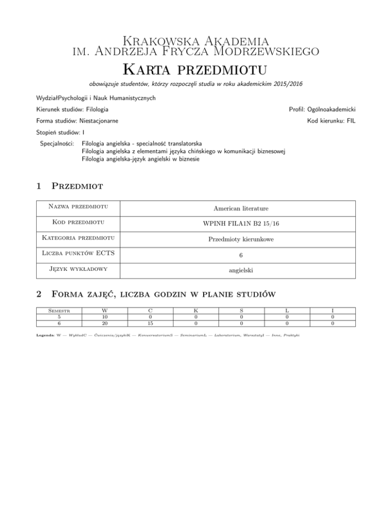Krakowska Akademia im. Andrzeja Frycza Modrzewskiego Karta przedmiotu obowiązuje studentów, którzy rozpoczęli studia w roku akademickim 2015/2016 WydziałPsychologii i Nauk Humanistycznych Kierunek studiów: Filologia Profil: Ogólnoakademicki Forma studiów: Niestacjonarne Kod kierunku: FIL Stopień studiów: I Specjalności: 1 2 Filologia angielska - specialność translatorska Filologia angielska z elementami języka chińskiego w komunikacji biznesowej Filologia angielska-język angielski w biznesie Przedmiot Nazwa przedmiotu American literature Kod przedmiotu WPINH FILA1N B2 15/16 Kategoria przedmiotu Przedmioty kierunkowe Liczba punktów ECTS 6 Język wykładowy angielski Forma zajęć, liczba godzin w planie studiów Semestr 5 6 W 10 20 C 0 15 K 0 0 S 0 0 L 0 0 Legenda: W — WykładC — Ćwiczenia/językiK — KonwersatoriumS — SeminariumL — Laboratorium, WarsztatyI — Inne, Praktyki I 0 0 Krakowska Akademia im. Andrzeja Frycza Modrzewskiego 3 Cele przedmiotu Cel 1 Celem kursu jest zapoznanie studentów z historią literatury amerykańskiej w zarysie,z uwzględnieniem biografii najważniejszych autorów, rozwojem gatunków i prądów literackich oraz analiza najważniejszych dzieł. 4 Wymagania wstępne 1 Poziom kompetencji językowej na poziomie B2.Ukończony blok wykładów i ćwiczeń z English Literature 1, English Literature 2, English Literature 3. 5 Modułowe efekty kształcenia MW1 Wiedza: Studenci posiadają podstawową wiedzę z zakresu historii literatury amerykańskiej. MW2 Studenci posiadają ogólną wiedzę kultury i historii amerykańskiej, znają kontekst kulturowy literatury tego obszaru. MU3 Studenci rozumieją oraz potrafią przeprowadzić interpretację danego utworu literackiego. MK4 Studenci, którzy zapoznali się z bogactwem dziedzictwa kulturowego oraz literatury amerykańskiej, potrafią wykorzystać zdobytą wiedzę w sytuacjach komunikacji międzyludzkiej. Potrafią zając stanowisko i poddać ocenie dany problem. 6 Treści programowe Lp W1 W2 W3 W4 W5 W6 W7 Lp C1 C2 C3 C4 C5 C6 C7 Wykład Tematyka zajęć Opis szczegółowy bloków tematycznych Tło historyczne-kulturowe. Literatura kolonialna i purytańska. Poezja Anne Bradstreet. Romantyzm amerykański vs. brytyjski (porównanie). Twórczość Washington Irving, Nathaniel Hawthorne(The Scarlett Letter). Edgar Allan Poe (The Raven, The Fall of the House of Usher). Transcendentalizm w literaturze amerykańskiej. Twórczość Henry David Thoreau (Walden-fragmenty). Poezja Walta Whitmana oraz Emily Dickinson. Proza amerykańska przełomu XIX i XX wieku. Mark Twain (The Adventures of Huckleberry Finn). Spotkania (post)kolonialne: Henry James. Literatura straconego pokolenia. F.Scott Fitzgerald (The Great Gatsby) Współczesna powieść i poezja amerykańska (Toni Morrison, Beloved) Razem Ćwiczenia/języki Tematyka zajęć Opis szczegółowy bloków tematycznych Poezja Emily Dickinson (I heard a fly buzz–when I died). Spotkania postkolonialne. Henry James (Daisy Miller). Jean Rhys (Wide Sargasso Sea) Poezja modernistyczna (amerykańska vs brytyjska): William Carlos Williams (The Red Wheelbarrow), Wallace Stevens (The Snow Man) POezja konfesyjna. Sylvia Plath (Daddy) Proza amerykańska. William Faulkner (That Evening Sun). Proza amerykańska.Ernest Hemingway (The Old Man and the Sea). Postmodernizm.Flannery O’Connor (Lost in the Funhouse) Strona 2/4 Liczba godzin 3 8 4 3 4 4 4 30 Liczba godzin 2 6 4 2 2 2 2 Krakowska Akademia im. Andrzeja Frycza Modrzewskiego Ćwiczenia/języki Tematyka zajęć Opis szczegółowy bloków tematycznych Razem Lp 7 Liczba godzin 20 Metody dydaktyczne M16. Wykłady M5. Dyskusja M8. Praca w grupach 8 Obciążenie pracą studenta Średnia liczba godzin na zrealizowanie aktywności Forma aktywności Godziny kontaktowe z nauczycielem akademickim, w tym: Godziny wynikające z planu studiów 50 Konsultacje przedmiotowe 0 Egzaminy i zaliczenia w sesji 0 Godziny bez udziału nauczyciela akademickiego wynikające z nakładu pracy studenta, w tym: Przygotowanie się do zajęć, w tym studiowanie zalecanej literatury 75 Opracowanie wyników 0 Przygotowanie raportu, projektu, prezentacji, dyskusji 25 Sumaryczna liczba godzin dla przedmiotu wynikająca z 150 całego nakładu pracy studenta 6 Sumaryczna liczba punktów ECTS dla przedmiotu 9 Metody oceny Ocena podsumowująca P1. Egzamin pisemny I1. Zalicznie pisemne ćwiczeń oraz referat w trakcie ćwiczeń. Warunki zaliczenia przedmiotu 1 Obecność na wykładzie oraz ćwiczeniach. Zaliczenie egzaminu pisemnego i testu kończącego ćwiczenia- uzyskanie minimum 50% punktów. Pozytywna ocena z referatu (ew.eseju). Kryteria oceny Na Na Na Na Na ocenę ocenę ocenę ocenę ocenę 3 3.5 4 4.5 5 50-60% punktów za egzamin końcowy 61-70% punktów za egzamin końcowy 71-80% punktów za egzamin końcowy 81-90% punktów za egzamin końcowy 91-100% punktów za egzamin końcowy Strona 3/4 Krakowska Akademia im. Andrzeja Frycza Modrzewskiego 10 Macierz realizacji przedmiotu Modułowe efekty kształcenia dla przedmiotu Odniesienie do efektów kierunkowych MW1 K_W04, K_W12 MW2 K_W05, K_W11 MU1 K_U12, K_U15 MK1 K_K03, K_K09 11 Treści programowe W1, W2, W3, W4, W5, W6, W7, C1, C2, C3, C4, C5, C6, C7 W1, W2, W3, W4, W5, W6, W7, C1, C2, C3, C4, C5, C6, C7 C1, C2, C3, C4, C5, C6, C7 C1, C2, C3, C4, C5, C6, C7 Metody dydaktyczne Sposoby oceny M16, M5, M8 P1, I1 M16, M5, M8 P1, I1 M5, M8 P1, I1 M5, M8 P1, I1 Wykaz literatury Literatura podstawowa: [1] R.Gray — History of American Literature, Maine, 2004, Blackwell Publishing [2] P. Lauter — Heath Anthology of American Literature, United States, 2010, Wadsworth Literatura uzupełniająca: [1] A.Saska — HIstoria literatury amerykańskiej, Kraków, 2003, Universitas 12 Informacje o nauczycielach akademickich Oboba odpowiedzialna za kartę dr Sylwia Wojciechowska (kontakt: [email protected]) Oboby prowadzące przedmiot dr Sylwia Wojciechowska (kontakt: [email protected]) dr Sylwia Wojciechow