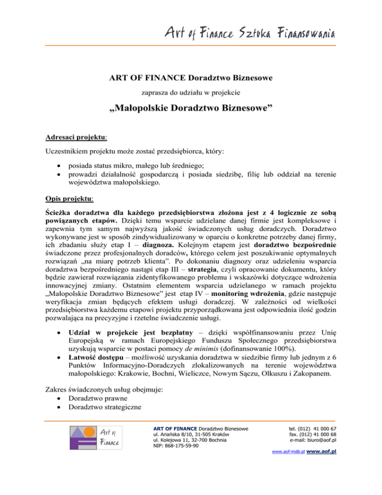ART OF FINANCE Doradztwo Biznesowe zaprasza do udziału w projekcie „Małopolskie Doradztwo Biznesowe” Adresaci projektu: Uczestnikiem projektu może zostać przedsiębiorca, który: posiada status mikro, małego lub średniego; prowadzi działalność gospodarczą i posiada siedzibę, filię lub oddział na terenie województwa małopolskiego. Opis projektu: Ścieżka doradztwa dla każdego przedsiębiorstwa złożona jest z 4 logicznie ze sobą powiązanych etapów. Dzięki temu wsparcie udzielane danej firmie jest kompleksowe i zapewnia tym samym najwyższą jakość świadczonych usług doradczych. Doradztwo wykonywane jest w sposób zindywidualizowany w oparciu o konkretne potrzeby danej firmy, ich zbadaniu służy etap I – diagnoza. Kolejnym etapem jest doradztwo bezpośrednie świadczone przez profesjonalnych doradców, którego celem jest poszukiwanie optymalnych rozwiązań „na miarę potrzeb klienta”. Po dokonaniu diagnozy oraz udzieleniu wsparcia doradztwa bezpośredniego nastąpi etap III – strategia, czyli opracowanie dokumentu, który będzie zawierał rozwiązania zidentyfikowanego problemu i wskazówki dotyczące wdrożenia innowacyjnej zmiany. Ostatnim elementem wsparcia udzielanego w ramach projektu „Małopolskie Doradztwo Biznesowe” jest etap IV – monitoring wdrożenia, gdzie następuje weryfikacja zmian będących efektem usługi doradczej. W zależności od wielkości przedsiębiorstwa każdemu etapowi projektu przyporządkowana jest odpowiednia ilość godzin pozwalająca na precyzyjne i rzetelne świadczenie usługi. Udział w projekcie jest bezpłatny – dzięki współfinansowaniu przez Unię Europejską w ramach Europejskiego Funduszu Społecznego przedsiębiorstwa uzyskują wsparcie w postaci pomocy de minimis (dofinansowanie 100%). Łatwość dostępu – możliwość uzyskania doradztwa w siedzibie firmy lub jednym z 6 Punktów Informacyjno-Doradczych zlokalizowanych na terenie województwa małopolskiego: Krakowie, Bochni, Wieliczce, Nowym Sączu, Olkuszu i Zakopanem. Zakres świadczonych usług obejmuje: Doradztwo prawne Doradztwo strategiczne ART OF FINANCE Doradztwo Biznesowe ul. Ariańska 8/10, 31-505 Kraków ul. Kolejowa 11, 32-700 Bochnia NIP: 868-175-59-90 tel. (012) 41 000 67 fax. (012) 41 000 68 e-mail: [email protected] www.aof-mdb.pl www.aof.pl Finanse w przedsiębiorstwie Marketing Podatki Trendy i prognozy branżowe Zarządzanie projektami w przedsiębiorstwie Zarządzanie przedsiębiorstwem Zarządzanie zasobami ludzkimi. Rekrutacja do projektu: Osobą upoważnioną do kontaktu w sprawie zgłoszeń do udziału w projekcie jest Pani Monika Rutana - Specjalista ds. rekrutacji i obsługi beneficjentów. Kontakt: [email protected], tel. (12) 410 00 67, www.aof-mdb.pl Korzyści dla uczestnika projektu: Szansa na uzyskanie wiedzy i umiejętności, które mogą przyczynić się do zwiększenia zysków i/lub ograniczenia kosztów, co w konsekwencji podniesie konkurencyjność przedsiębiorstwa. Dynamiczny lub skokowy rozwój dzięki stosowaniu wypracowanej w ramach doradztwa strategii rozwoju firmy oraz obszarów objętych doradztwem. Szeroki zakres wsparcia – oferujemy doradztwo z 9 różnych obszarów (marketing, zarządzanie zasobami ludzkimi, doradztwo strategiczne, finanse w przedsiębiorstwie, podatki, trendy i prognozy branżowe, zarządzanie przedsiębiorstwem, zarządzanie projektami w przedsiębiorstwie, doradztwo prawne). Zindywidualizowane podejście, wypracowanie skutecznych rozwiązań biznesowych – każde przedsiębiorstwo otrzyma pakiet kompleksowego doradztwa z wybranego zakresu „szyty na miarę potrzeb klienta”. Profesjonalna obsługa, wiedza i doświadczenie najlepszych doradców będących specjalistami w swej dziedzinie, posiadających wieloletnie doświadczenie praktyczne oraz szeroki zakres wiedzy. Wiarygodność, doświadczenie oraz rzetelność realizatora – firma ART OF FINANCE świadczy usługi doradcze dla ok. 80-100 przedsiębiorstw rocznie, jest wiodącą firmą doradczą w województwie małopolskim. ART OF FINANCE Doradztwo Biznesowe ul. Ariańska 8/10, 31-505 Kraków ul. Kolejowa 11, 32-700 Bochnia NIP: 868-175-59-90 tel. (012) 41 000 67 fax. (012) 41 000 68 e-mail: [email protected] www.aof-mdb.pl www.aof.pl