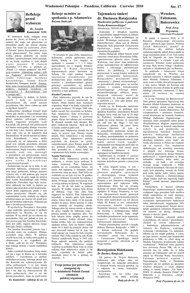 Wiadomości Polonijne - Pasadena, California Refleksje przed wyborcze Relacje uczniów ze spotkania z p. Adamowicz Bożena Stańczak Ks. Lucjan Kamieński SDB W momencie kiedy redaguję moje pisanie do „News of Polonia”, a są to ostatnie dni maja, od głosowania na prezydenta dzieli nas prawie miesiąc czasu. Nie wiem czy czerwcowy „News of Polonia” dotrze doczytelników jeszcze przed głosowaniem? Nie mniej mam wielką pokusę pódzielić się moimi myślami i spostrzeźeniami, które nasunęły mi się kiedy czytałem w tych dniach wieści prasowe. W „Nowym Dzienniku” (7.V.10r), w artykule pt. „Ponad 1,5 milona podpisów dla PiS” m.in.czytałem: „Zebraliśmy milion i 650 tys. Podpisów” powiedziała szefowa sztabu wyborczego Jarosława Kaczyńskiego, Joanna Kluzik Rostkowska. Następnie dodała: „Emocje, które temu towarzyszyły gdy zbieraliśmy podpisy, najlepiej świadczą, źe zwycięstwo J. Kaczyńskiego jest w zasięgu ręki”. Na marginesie tu dodam, źe byłem, jestem i będę za Jarosławem Kaczyńskiem, aby został naszym prezydentem. Oby słowo ciałem się stało co daj Boże Amen!!!! Jednocześnie chciałbym wyrazić moje obawy gdy chodzi o J.Kaczyńskiego jako kandydata na prezydenta i na ewentualną głowę państwa jeśli.wygra wybory. Zmarły tragicznie prezydent Lech Kaczyński dla pewnych kół politycznych był bardzo niewygodny dlatego wieszano na nim koty i psy, słowem opluwano go przez cały czas aź do katastrofy pod Smoleńskiem. W chwili narodowej żałoby świat dziennikarski i mass media wstrzymały się od opluwania, a które przed tym zabijały prezydenta słowami kłamstwem i oszczerstwem i chamskim zachowaniem. Nagle wszystko zamilkło i zmieniło swój ton, dostrzegli w prezydencie coś pozytywnego, nawet znalazły się zdjęcia, które przedstawiają pana Lecha Kaczyńskiego w pozytywnych pozach. Zastanawiam się jak się to stało, że ten prezydent opluwany, ośmieszany przez inne opcje polityczne, którego prasowe wykresy szły w dół podczas gdy innych polityków szły do góry, nagle po śmierci pana Lecha Kaczyńskiego cała Polska opłakiwała. Dowodem tego były rzesze, które oddawały mu hołd, że dopiero po śmierci jako prezydent został dostrzeżony. Nawet prasa zagraniczna pisała o nim bardzo pozytywnie. Okazało się, jak wspomniałem wyźej, znalazły się zdjęcia przedstawiające go inaczej niź przed tym gdy był brutalnie atakowany. Pokazano go nam w świetle pozytywnym. W tej chwili śp. Prezydent L. Kaczyński i jego małżonka spoczywają w grobach królewskich na Wawelu, co się im naleźało. W tej chwili już on nikomu nie przeszkadza. Sęk jest jednak w tym, źe źyje jeszcze jego brat Jarosław Kaczyński, który jest jakby ciągiem dalszym swego brata gdy chodzi o politykę. Pan Jarosław Kaczyński. jeszcze źyje i wszystko moźe się wydarzyć. Dlatego wyraziłem moje obawy. W polityce zwykle bywa tak, źe osoby niewygodne są eliminowane a po wypadkach jak w filmie: „nikt nic nie wie”. Pamiętamy tego rodzaju metody z naszej niedalekiej historii. Jeden z polskich hierachów, który znany jest już z tego, że kłania się w kierunku cadyków i wszystkiemu co pachnie michnikowszczyzną, ostrzega przed tym aby Kościoła nie wykorzystywano dla celów politycznych. I to jest święta prawda. Kościół w Polsce istnieje nie od dziś i nie daje się wykorzystywać dla celów politycznych, choć w nie tak dawnej przeszłości, mam na myśli reżim Ks. Kamieński - refleksje do str. 24 W kwietniu br. pani Zofia Adamowicz, Sybiraczka, została zaproszona przez Polską Szkołę w Los Angeles na spotkanie z ucznami i 7 i 8 klasy opowiedzenie im o tragedii Polaków p o d c z a s I I W o j n y Ś w ia to w e j deportowanych przez Sowietów na Syberię. Ta część polskiej historii najczęściej przemilczana jest przekazywana przez osobiste spotkania uczniów z przedstawicielami ginącej generacji uczestników tej gehenny polskiej. Poniżej zamieszczam wrażenia studentów z tego spotkania. Klaudia Cymerska Pani Adamowicz przyszła do nas by opowiadać o swoich przeżyciach na Syberii. Miała bardzo dużo niemiłych wspomień. Miała 9 lat kiedy wybuchła IIgo wojna światowa. 10 lutego 1940 roku ludzie zaczęli być wywożeni na Syberię. Pani Adamowicz była wywieziona z mamą, bratem i siostrą w pierwszej grupie. Ojciec był zabrany już wcześniej. W obozach warunki były okropne. Był głód i brakowało lekarstw . Było tak źle. że każdy czekał na jakiś cud. Matka pani Adamowicz dostała list od męża, że jeszcze żyje. Niestey siostra umarła. Pani Adamowicz i Jej rodzina przeżyła. Pani Adamowicz później pojechała do Katynia na groby zamordowanych przez Rosjan ponad 20 tys. polskich oficerów. Pojechała tam żeby pomodlić sie i złożyć hołd. Jej wspomnienia były bardzo wzruszające. Natalia Piotrowska Pani Zofia Adamowicz mówiła na spotkaniu o swoim życiu podczas II wojny światowej. Pani Adamowicz urodziła się we wschodniej Polsce. Jej ojciec był organistą. 2 listopada został aresztowny zaraz po mszy. Pani Zofia nie wiedziała czy on żyje, czy nie. W grudniu rosyjscy żołnierze wyrzucili Jej rodzinę z domu. 10 lutego została wywieziona wraz ze swoją rodziną na Syberię. W wagonach było po 50 do 60 ludzi w jednym wagonie. W środku wagonu była dziura na ubikację. Tego roku zima była najgorsza na Syberii. Pani Adamowicz mieszkała w baraku gdzie było bardzo zimno. Dzieci które miały 14 lat musiały chodzić do pracy. Dzieci poniżej 13 roku życia chodziły do rosyjskiej szkoły. Jednego dnia Jej starsza siostra w drodze do pracy wpadła do lodowatej rzeki i później umarła na zapalenie płuc. Nie było lekarza, który mógłby pomóc Jej chorej siostrze. Ludzie obcinali włosy bardzo krótko żeby nie rozprzestrzeniać epidemii tyfusu. Żyło się bardzo ciężko, około 30 % ludzi nie przeżyło obozu. Od ojca przyszedł radosny list że żyje, nie m