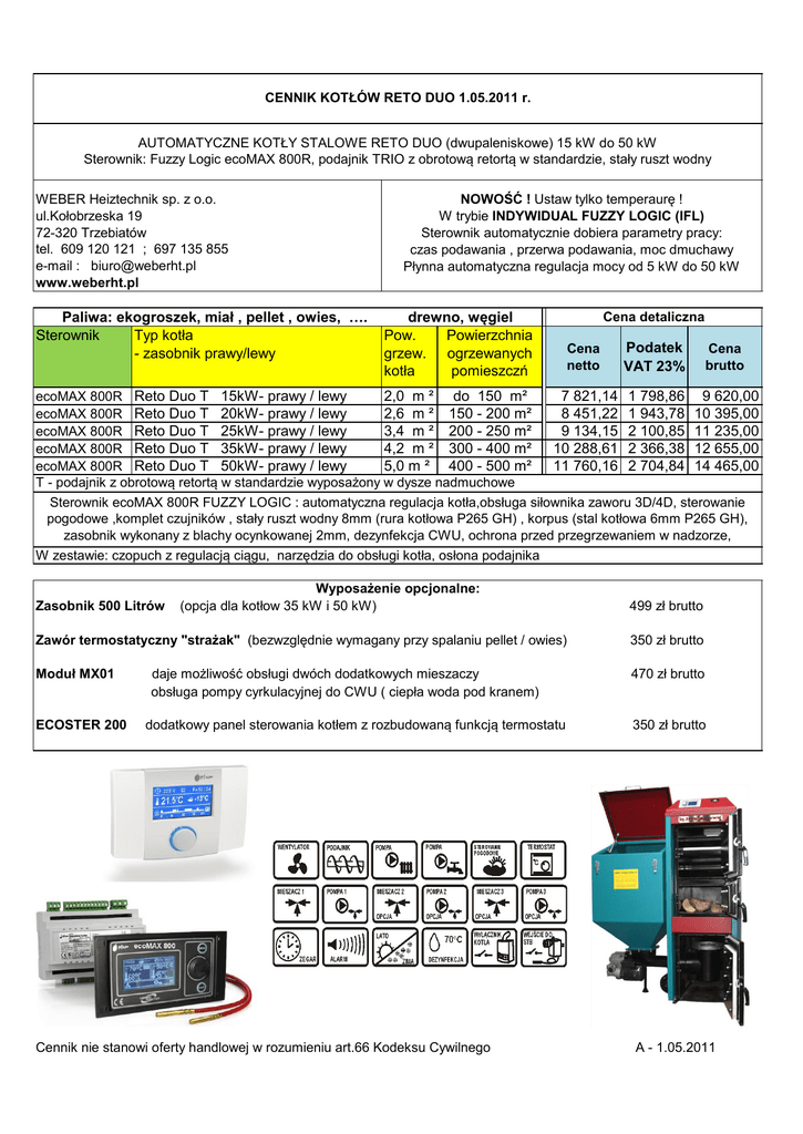 CENNIK KOTŁÓW RETO DUO 1.05.2011 r. AUTOMATYCZNE KOTŁY STALOWE RETO DUO (dwupaleniskowe) 15 kW do 50 kW Sterownik: Fuzzy Logic ecoMAX 800R, podajnik TRIO z obrotową retortą w standardzie, stały ruszt wodny WEBER Heiztechnik sp. z o.o. ul.Kołobrzeska 19 72-320 Trzebiatów tel. 609 120 121 ; 697 135 855 e-mail : [email protected] www.weberht.pl Paliwa: ekogroszek, miał , pellet , owies, …. Sterownik Typ kotła - zasobnik prawy/lewy NOWOŚĆ ! Ustaw tylko temperaurę ! W trybie INDYWIDUAL FUZZY LOGIC (IFL) Sterownik automatycznie dobiera parametry pracy: czas podawania , przerwa podawania, moc dmuchawy Płynna automatyczna regulacja mocy od 5 kW do 50 kW drewno, węgiel Pow. Powierzchnia grzew. ogrzewanych kotła pomieszczń Cena detaliczna Cena netto Podatek VAT 23% Cena brutto ecoMAX 800R Reto Duo T 15kW- prawy / lewy 2,0 m ² do 150 m² 7 821,14 1 798,86 9 620,00 ecoMAX 800R Reto Duo T 20kW- prawy / lewy 2,6 m ² 150 - 200 m² 8 451,22 1 943,78 10 395,00 ecoMAX 800R Reto Duo T 25kW- prawy / lewy 3,4 m ² 200 - 250 m² 9 134,15 2 100,85 11 235,00 ecoMAX 800R Reto Duo T 35kW- prawy / lewy 4,2 m ² 300 - 400 m² 10 288,61 2 366,38 12 655,00 ecoMAX 800R Reto Duo T 50kW- prawy / lewy 5,0 m ² 400 - 500 m² 11 760,16 2 704,84 14 465,00 T - podajnik z obrotową retortą w standardzie wyposażony w dysze nadmuchowe Sterownik ecoMAX 800R FUZZY LOGIC : automatyczna regulacja kotła,obsługa siłownika zaworu 3D/4D, sterowanie pogodowe ,komplet czujników , stały ruszt wodny 8mm (rura kotłowa P265 GH) , korpus (stal kotłowa 6mm P265 GH), zasobnik wykonany z blachy ocynkowanej 2mm, dezynfekcja CWU, ochrona przed przegrzewaniem w nadzorze, W zestawie: czopuch z regulacją ciągu, narzędzia do obsługi kotła, osłona podajnika Zasobnik 500 Litrów Wyposażenie opcjonalne: (opcja dla kotłow 35 kW i 50 kW) 499 zł brutto Zawór termostatyczny "strażak" (bezwzględnie wymagany przy spalaniu pellet / owies) 350 zł brutto Moduł MX01 470 zł brutto ECOSTER 200 daje możliwość obsługi dwóch dodatkowych mieszaczy obsługa pompy cyrkulacyjnej do CWU ( ciepła woda pod kranem) dodatkowy panel sterowania kotłem z rozbudowaną funkcją termostatu Cennik nie stanowi oferty handlowej w rozumieniu art.66 Kodeksu Cywilnego 350 zł brutto A - 1.05.2011