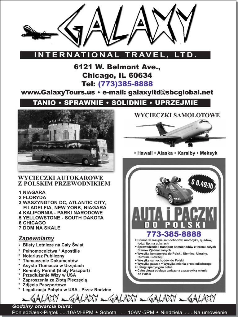I N T E R N AT I O N A L T R AV E L , LT D . 6121 W. Belmont Ave., Chicago, IL 60634 Tel: (773)385-8888 www.GalaxyTours.us • e-mail: [email protected] TANIO • SPRAWNIE • SOLIDNIE • UPRZEJMIE WYCIECZKI SAMOLOTOWE • Hawaii • Alaska • Karaiby • Meksyk WYCIECZKI AUTOKAROWE Z POLSKIM PRZEWODNIKIEM 1 NIAGARA 2 FLORYDA 3 WASZYNGTON DC, ATLANTIC CITY, FILADELFIA, NEW YORK, NIAGARA 4 KALIFORNIA - PARKI NARODOWE 5 YELLOWSTONE - SOUTH DAKOTA 6 CHICAGO 7 DOM NA SKALE Zapewniamy * * * * * * * * * * Bilety Lotnicze na Cały Świat Pełnomocnictwa * Apostille Notariusz Publiczny Tłumaczenie Dokumentów Asysta Tłumacza w Urzędach Re-entry Permit (Biały Paszport) Przedłużanie Wizy w USA Zaproszenia ze Złotą Pieczęcią Zdjęcia Paszportowe Legalizacja Pobytu w USA - Przez Rodzinę 773-385-8888 Pomoc w zakupie samochodów, motocykli, quadów, łodzi, itp. na aukcjach Sprowadzanie i transport samochodów z terenu całych Stanów Zjednoczonych Wysyłka kontenerów do Polski, NIemiec, Ukrainy, Rumuni, Słowacji Wysyłka samochodów do Polski Wysyłka paczek Wysyłka mienia przesiedleńczego Usługi spedycyjno celne Całosciowa obsługa związana z przesyłką mienia do Polski Godziny otwarcia biura: Poniedziałek-Piątek .....10AM-8PM Sobota . . .10AM-5PM Niedziela .......Na umówienie