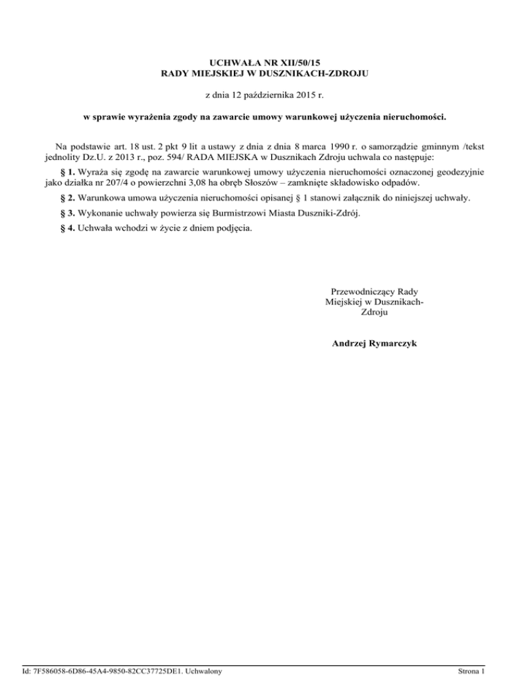 UCHWAŁA NR XII/50/15 RADY MIEJSKIEJ W DUSZNIKACH-ZDROJU z dnia 12 października 2015 r. w sprawie wyrażenia zgody na zawarcie umowy warunkowej użyczenia nieruchomości. Na podstawie art. 18 ust. 2 pkt 9 lit a ustawy z dnia z dnia 8 marca 1990 r. o samorządzie gminnym /tekst jednolity Dz.U. z 2013 r., poz. 594/ RADA MIEJSKA w Dusznikach Zdroju uchwala co następuje: § 1. Wyraża się zgodę na zawarcie warunkowej umowy użyczenia nieruchomości oznaczonej geodezyjnie jako działka nr 207/4 o powierzchni 3,08 ha obręb Słoszów – zamknięte składowisko odpadów. § 2. Warunkowa umowa użyczenia nieruchomości opisanej § 1 stanowi załącznik do niniejszej uchwały. § 3. Wykonanie uchwały powierza się Burmistrzowi Miasta Duszniki-Zdrój. § 4. Uchwała wchodzi w życie z dniem podjęcia. Przewodniczący Rady Miejskiej w DusznikachZdroju Andrzej Rymarczyk Id: 7F586058-6D86-45A4-9850-82CC37725DE1. Uchwalony Strona 1 Załącznik do Uchwały Nr XII/50/15 Rady Miejskiej w Dusznikach-Zdroju z dnia 12 października 2015 roku Umowa warunkowa użyczenia nieruchomości zawarta dnia ……………………………………….. r. w Szczytnej pomiędzy: 1. Gminą Szczytna z siedzibą w Szczytnej, ul. Wolności 42, NIP: 883-16-78-051, reprezentowaną przez: - Marka Szpaniera – Burmistrza Szczytnej zwanym dalej Użyczającym, a 2. Gminą Duszniki Zdrój z siedzibą w Dusznikach Zdroju ul. Rynek 6, NIP:…………… reprezentowaną przez - Piotra Lewandowskiego – Burmistrza Dusznik Zdroju, zwanym dalej Biorącym do używania. §1 Użyczający oświadcza, że wystąpił do Agencji Nieruchomości Rolnych Skarbu Państwa Oddział we Wrocławiu z wnioskiem o przeniesienia prawa własności działki nr 207/4 o powierzchni 3,08 ha Obręb Słoszów – zamknięte składowisko odpadów. 1. 2. 1. 2. §2 Użyczający oświadcza, że celem umożliwienia Biorącemu do używania, wykonania decyzji Wojewody Dolnośląskiego nr SR.IV.6621-3/7/07 z dnia 7 grudnia 2007 r. zmienioną decyzją Marszałka Województwa Dolnośląskiego nr Z 29/2011 z dnia 28 czerwca 2011 r., z dniem, kiedy działka gruntu opisana w § 1 stanie się własnością Gminy Szczytna odda Biorącemu do używania wyżej wskazaną nieruchomość na czas określony – 9 lat licząc od dnia nabycia prawa własności przez Gminę Szczytna. Użyczający niezwłocznie powiadomi Biorącego do używania o zwarciu umowy przeniesienia własności działki opisanej w § 1 z Agencją i przedłoży potwierdzoną kopię, która będzie stanowić załącznik do niniejszej umowy. §3 Biorący do używania przedmiot użyczenia określony w § 1 będzie wykorzystywał do przeprowadzenia rekultywacji składowiska odpadów, unieszkodliwiania odpadów komunalnych a także prowadzenia odzysku odpadów w trakcie rekultywacji zgodnie z decyzją Wojewody Dolnośląskiego nr SR.IV.6621-3/7/07 z dnia 7 grudnia 2007 r. zmienioną decyzją Marszałka Województwa Dolnośląskiego nr Z 29/2011 z dnia 28 czerwca 2011 r. i Decyzją Marszałka Województwa Dolnośląskiego nr O 30/2012 dnia 20 września 2011 r. zmienioną decyzją nr o 30.1/2012 z dnia 12 stycznia 2012 r. stanowiącą załącznik do niniejszej umowy. Biorący do używania zobowiązuje się wykorzystywać przedmiot użyczenia zgodnie z jego właściwościami i przeznaczeniem oraz decyzjami Marszałka Województwa Dolnośląskiego określonymi w ust. 1 §4 Wydanie Biorącemu do używania przedmiotowej nieruchomości nastąpi w dniu następującym po dniu przeniesienia przez Agencję Nieruchomości Rolnych Skarbu Państwa Oddział we Wrocławiu prawa własności nieruchomości - działki gruntu opisanej w § 1 na rzecz Gminy Szczytna. Id: 7F586058-6D86-45A4-9850-82CC37725DE1. Uchwalony Strona 1 §5 Biorący do używania nie może bez zgody Użyczającego oddać przedmiotu niniejszej umowy osobie trzeciej do używania. Biorący do użyczenia uzyskuje zgodę Użyczającego, jeżeli Użyczający w ciągu 3 dni od dnia wpływu wniosku do Użyczającego wyraźnie nie sprzeciwi się oddaniu przedmiotu użyczenia do używania osobie trzeciej wskazanej we wniosku. 1. 2. 3. 4. §6 Biorący do używania zobowiązuje się ponosić wszelkie koszty związane z korzystaniem z nieruchomości, będącej przedmiotem użyczenia i urządzeń w niej zainstalowanych, Wszelkie kary wynikające z przepisów prawa lub wydanych decyzji w przypadku braku wykonania, nienależytego wykonania lub nieterminowego wykonania rekultywacji wysypiska i unieszkodliwiania odpadów obciążają biorącego do używania. W przypadku nie wykonania rekultywacji wysypiska w terminie określonym w § 2 ust. 1 i powstania obowiązku dokonania zapłaty za darowaną przez Agencję Nieruchomości Rolnych Skarbu Państwa działkę, roszczenia Agencji Nieruchomości Rolnych Skarbu Państwa w całości pokryje Biorący do używania. W przypadku żądania zwrotu przez Użyczającego przedmiotu umowy przed upływem terminu, na jaki umowa została zawarta, Użyczający zobowiązuje się: a) zwrócić Biorącemu do używania wszelkie nakłady i poniesione koszty związane z przeprowadzeniem rekultywacji wysypiska, unieszkodliwianiem odpadów i ich odzyskiem, b) ponieść w całości odpowiedzialność z tytułu kar oraz zobowiązań wynikających z przepisów prawa lub wydanych decyzji, w tym zwrócić Biorącemu do używania wynikłe z tego tytułu straty w przypadku braku wykonania lub nieterminowego wykonania rekultywacji wysypiska i unieszkodliwiania odpadów, w tym również w razie powstania obowiązku zapłaty za otrzymaną od Agencji Nieruchomości Rolnych Skarbu Państwa działkę nr 270/4 ponosząc koszty jej wykupu. §7 Po wykonaniu czynności określonych w decyzjach, o której mowa w § 3 ust. 1 lub zakończeniu niniejszej umowy Biorący do używania obowiązany jest zwrócić Użyczającemu przedmiot niniejszej umowy. §8 Zmiana niniejszej umowy wymaga formy pisemnej pod rygorem nieważności. §9 W sprawach nieuregulowanych niniejszą u