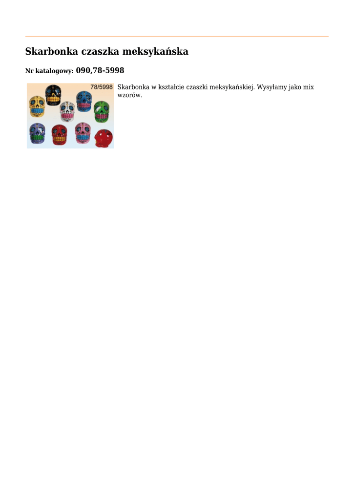 Skarbonka czaszka meksykańska Nr katalogowy: 090,78-5998 Skarbonka w kształcie czaszki meksykańskiej. Wysyłamy jako mix wzorów.