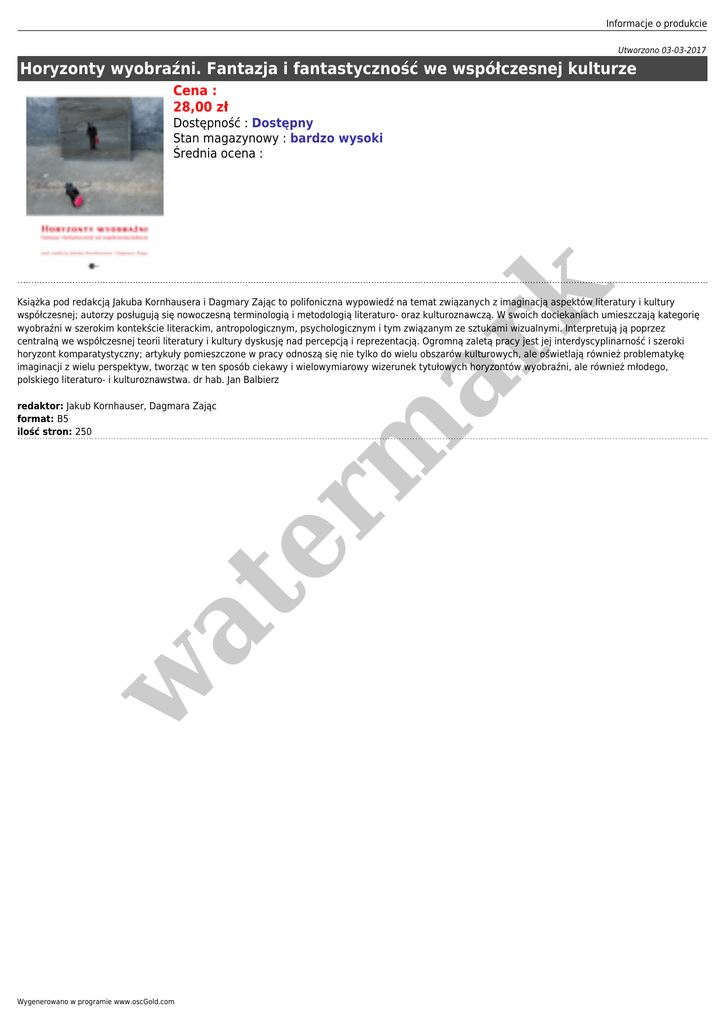 Informacje o produkcie Utworzono 03-03-2017 Horyzonty wyobraźni. Fantazja i fantastyczność we współczesnej kulturze Cena : 28,00 zł er m ar k Dostępność : Dostępny Stan magazynowy : bardzo wysoki Średnia ocena : Książka pod redakcją Jakuba Kornhausera i Dagmary Zając to polifoniczna wypowiedź na temat związanych z imaginacją aspektów literatury i kultury współczesnej; autorzy posługują się nowoczesną terminologią i metodologią literaturo- oraz kulturoznawczą. W swoich dociekaniach umieszczają kategorię wyobraźni w szerokim kontekście literackim, antropologicznym, psychologicznym i tym związanym ze sztukami wizualnymi. Interpretują ją poprzez centralną we współczesnej teorii literatury i kultury dyskusję nad percepcją i reprezentacją. Ogromną zaletą pracy jest jej interdyscyplinarność i szeroki horyzont komparatystyczny; artykuły pomieszczone w pracy odnoszą się nie tylko do wielu obszarów kulturowych, ale oświetlają również problematykę imaginacji z wielu perspektyw, tworząc w ten sposób ciekawy i wielowymiarowy wizerunek tytułowych horyzontów wyobraźni, ale również młodego, polskiego literaturo- i kulturoznawstwa. dr hab. Jan Balbierz w at redaktor: Jakub Kornhauser, Dagmara Zając format: B5 ilość stron: 250 Wygenerowano w programie www.oscGold.com