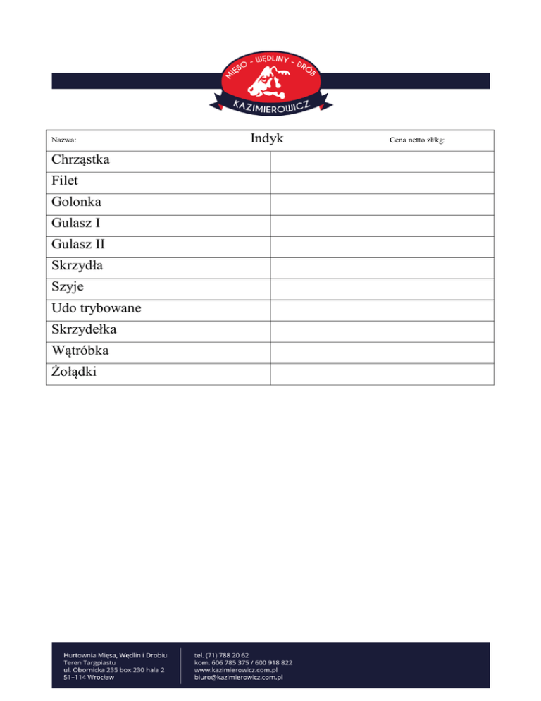 Nazwa: Chrząstka Filet Golonka Gulasz I Gulasz II Skrzydła Szyje Udo trybowane Skrzydełka Wątróbka Żołądki Indyk Cena netto zł/kg: