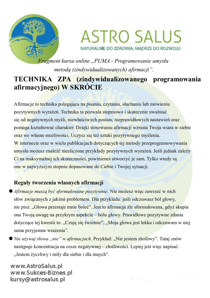 Fragment kursu online „PUMA - Programowanie umysłu metodą (zindywidualizowanych) afirmacji”. TECHNIKA ZPA (zindywidualizowanego programowania afirmacyjnego) W SKRÓCIE Afirmacje to technika polegająca na pisaniu, czytaniu, słuchaniu lub mówieniu pozytywnych wyrażeń. Technika ta pozwala stopniowo i skutecznie uwalniać się od negatywnych myśli, niewłaściwych postaw, nieprawidłowych nastawień oraz pomaga kształtować charakter. Dzięki stosowaniu afirmacji wzrasta Twoja wiara w siebie oraz we własne możliwości. Uczysz się też sztuki pozytywnego myślenia. W internecie oraz w wielu publikacjach dotyczących tej metody przeprogramowywania umysłu możesz znaleźć niezliczone przykłady pozytywnych wyrażeń. Jeśli jednak zależy Ci na maksymalnej ich skuteczności, powinieneś utworzyć je sam. Tylko wtedy są one w najwyższym stopniu dopasowane do Ciebie i Twojej sytuacji. Reguły tworzenia własnych afirmacji Afirmacje muszą być sformułowane pozytywnie. Nie możesz więc zawrzeć w nich słów związanych z jakimś problemem. Dla przykładu: jeśli odczuwasz ból głowy, nie pisz: „Głowa przestaje mnie boleć”. Jest to afirmacja źle sformułowana, gdyż skupia ona Twoją uwagę na przykrym aspekcie – bólu głowy. Prawidłowe pozytywne zdania dotyczące tej kwestii to: „Czuję się świetnie”, „Moja głowa jest lekka i odczuwam w niej sama przyjemne wrażenia”. Nie używaj słowa „nie” w afirmacjach. Przykład: „Nie jestem złośliwy”. Tutaj znów następuje koncentracja na cesze negatywnej – złośliwości. Lepiej jest więc napisać: „Jestem życzliwy i miły dla siebie i dla innych”. Afirmacje należy pisać w czasie teraźniejszym. Przykład: „Będę systematyczny w nauce” oznacza, że zdobędziesz się na systematyczność w jakiejś bliżej nieokreślonej przyszłości. Przyszłość natomiast nigdy nie jest teraz. W wyniku powtarzania takiego zdania wiecznie będziesz odkładać naukę. Lepiej jest tu więc używać takiego wyrażenia: „Jestem systematyczny”. „Regularnie się uczę” Afirmacje muszą wyrażać stany możliwe do zrealizowania. Nic nie da na przykład afirmowanie, że Twoje oczy mają naturalny kolor niebieski, jeśli są brązowe itp. Metodyka tworzenia własnych afirmacji Kup 2 zeszyty. Jeden będzie Ci służył do wypisywania negatywnych skojarzeń, drugi do tworzenia afirmacji. Zdefiniuj swój problem i dokładnie go przemyśl. Może nim być na przykład strach przed realizowaniem swoich marzeń, uraza do kogoś, czy jakaś negatywna cecha Twojego charakteru. Dlaczego chcesz coś zmienić? W czym Ci dany problem przeszkadza? O co Cię zubaża jego istnienie? Co Ci da zmiana postaci rzeczy? Czego będziesz miał więcej? Wypisz te wszystkie kwestie w zeszycie pozytywnym . Wymyśl stosowną afirmację. Pamiętaj, że ma być ona pozytywna, napisana w czasie teraźniejszym i nie powinna zawierać wyrazu „nie”. W zeszycie negatywnym wymień wszystkie negatywne skojarzenia dotyczące danego tematu. Na przykład do zdania: „Zasługuję na to, co dobre” mogą to być takie frazy: „Nie jestem wystarczająco dobry, by mieć to, co najlepsze”, „Wcale nie zasługuję na to, co dobre”, „Jestem beznadziejny” . Po wypisaniu wszystkich niekorzystnych skojarzeń w odpowiedzi na nie w zeszycie pozytywnym napisz ich przeciwieństwa. Do wyżej wymienionych wyrażeń mogą to być na przykład: „Jestem wystarczająco dobry”, „Zasługuję na to, co najlepsze”, „Jestem wartościowym człowiekiem”. Skoro przepracowałeś już dogłębnie dany problem, wymieniłeś wszystkie negatywne asocjacje z nim związane oraz napisałeś własny pakiet afirmacji, czas zacząć je stosować. Zasady skutecznego stosowania afirmacji Afirmacje należy powtarzać 1 – 3 razy dziennie. W moim przypadku zauważyłam ich najwyższą skuteczność, kiedy odczytywałam je 2 razy dziennie Najlepsze efekty daje afirmowanie rano po przebudzeniu i wieczorem przed zaśnięciem. Wtedy umysł jest najbardziej podatny na sugestię i wyjątkowo chłonny. Jeśli jednak w tych porach dniach nie masz czasu, każdy inny termin również warto wykorzystać na praktykowanie tego wspaniałego ćwiczenia . Afirmacje należy powtarzać w stanie relaksu ciała i umysłu. Wszelki stres i chaos zaburza prawidłowe przyswajanie afirmacji przez umysł . (O technikach relaksu w kursie). Wymawiaj/pisz/odsłuchuj afirmacje z pełnym zaangażowaniem emocjonalnym. Tylko takie do nich podejście przynosi odpowiednie skutki. „Odklepywanie” ich nie daje absolutnie nic, oprócz straty czasu i frustracji z powodu braku efektów. Na przykład, jeżeli afirmujesz: „Jestem radosny”, odczuj radość. Nawet jeśli na początku przychodzi Ci to z trudem, pamiętaj, że trening czyni mistrzem i w końcu zapanujesz nad sobą na tyle, by na zawołanie angażować w pracę z afirmacjami swoje pozytywne emocje. Jak budować zaangażowanie emocjonalne? O tym w innych lekcjach tego kursu. Stosuj afirmacje z pełną wiarą. To normalne, że na początku powtarzając dane wyrażenie możesz odczuwać, że oszukujesz samego siebie. Mimo tego rozwijaj praktykowanie afirmacji z wiarą w ich skuteczność i w to, że opisują one stan rzeczywisty. Kłamstwo powtarzane 1000 razy staje się prawdą. Lepiej, by prawda okazała się dla Ciebie pozytywna i korzystna. Twórz więc własną prawdę o sobie i o swoim życiu. Możesz afirmacje połączyć z odpowiednimi do nich wizualizacjami. Są one wtedy najbardziej efektywne. Jak skutecznie wizualizować? Dowiesz się w innych lekcjach tego kursu. Używaj słów kluczy. Są to wyrażenia takie, jak: „Zasługuję na...”, „Pozwalam sobie na...”, „Jestem godzien tego, by...”, „Dziękuję za...” itp. (więcej o tym w kursie). Na jedno zdanie negatywne wymyślaj minimum po pięć zdań pozytywnych. Stosuj afirmacje nieprzerwanie minimum 3 tygodnie. Jeśli jest taka potrzeba, powtarzaj je dłu