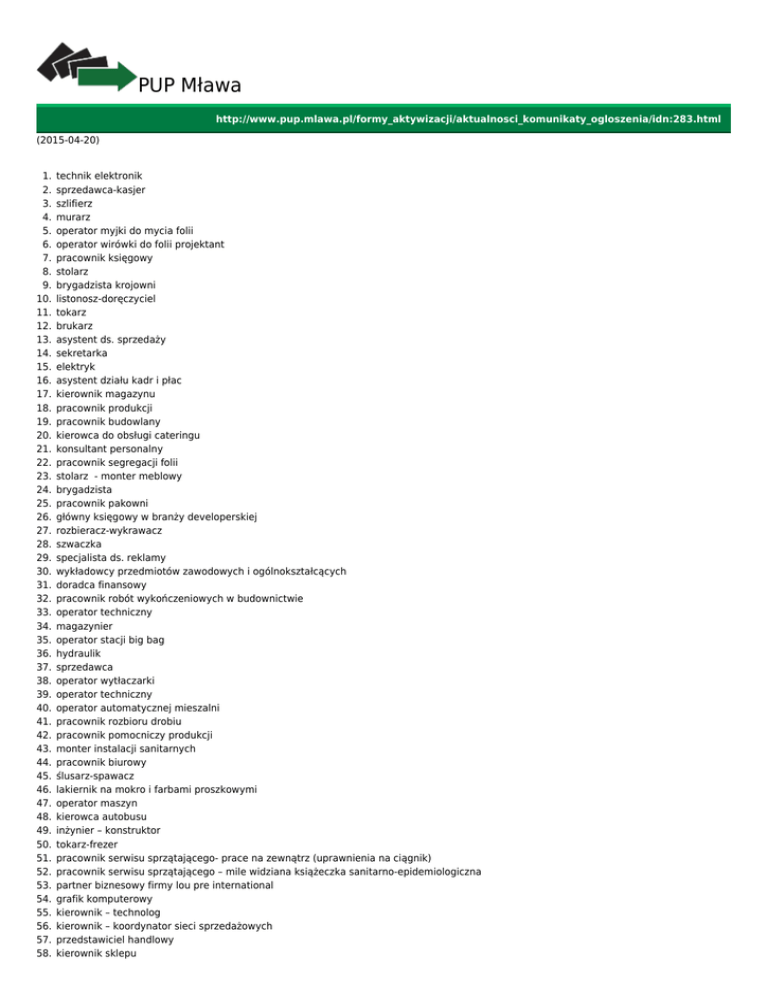 PUP Mława http://www.pup.mlawa.pl/formy_aktywizacji/aktualnosci_komunikaty_ogloszenia/idn:283.html (2015-04-20) 1. 2. 3. 4. 5. 6. 7. 8. 9. 10. 11. 12. 13. 14. 15. 16. 17. 18. 19. 20. 21. 22. 23. 24. 25. 26. 27. 28. 29. 30. 31. 32. 33. 34. 35. 36. 37. 38. 39. 40. 41. 42. 43. 44. 45. 46. 47. 48. 49. 50. 51. 52. 53. 54. 55. 56. 57. 58. technik elektronik sprzedawca-kasjer szlifierz murarz operator myjki do mycia folii operator wirówki do folii projektant pracownik księgowy stolarz brygadzista krojowni listonosz-doręczyciel tokarz brukarz asystent ds. sprzedaży sekretarka elektryk asystent działu kadr i płac kierownik magazynu pracownik produkcji pracownik budowlany kierowca do obsługi cateringu konsultant personalny pracownik segregacji folii stolarz - monter meblowy brygadzista pracownik pakowni główny księgowy w branży developerskiej rozbieracz-wykrawacz szwaczka specjalista ds. reklamy wykładowcy przedmiotów zawodowych i ogólnokształcących doradca finansowy pracownik robót wykończeniowych w budownictwie operator techniczny magazynier operator stacji big bag hydraulik sprzedawca operator wytłaczarki operator techniczny operator automatycznej mieszalni pracownik rozbioru drobiu pracownik pomocniczy produkcji monter instalacji sanitarnych pracownik biurowy ślusarz-spawacz lakiernik na mokro i farbami proszkowymi operator maszyn kierowca autobusu inżynier – konstruktor tokarz-frezer pracownik serwisu sprzątającego- prace na zewnątrz (uprawnienia na ciągnik) pracownik serwisu sprzątającego – mile widziana książeczka sanitarno-epidemiologiczna partner biznesowy firmy lou pre international grafik komputerowy kierownik – technolog kierownik – koordynator sieci sprzedażowych przedstawiciel handlowy kierownik sklepu 59. 60. 61. 62. 63. 64. 65. 66. 67. 68. 69. 70. 71. 72. 73. 74. 75. 76. 77. 78. 79. 80. referent ds. unijnych asystent menadżera koordynator menadżer elektromonter ślusarz lakiernik przemysłowy monter podłóg technolog drewna policjant – służba na terenie garnizonu mazowieckiego kontroler jakości – naprawa telefonów komórkowych młodszy specjalista ds. utrzymania obiektu kelner kierowca handlowiec specjalista ds. sprzedaż robotnik fizyczny elektromonter pracownik biurowy ze znajomością auto cad pracownik obsługi stacji paliw (orzeczenie o niepełnosprawności) stomatolog cukiernik opiekun/opiekunka osób starszych Ogółem dysponujemy około 400 wolnymi miejscami pracy zobacz wszystkie aktualności
