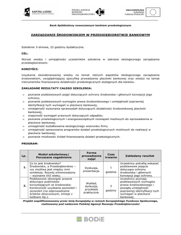 __________________________________________________________________________________ Bank Spółdzielczy nowoczesnym bankiem proekologicznym ZARZĄDZANIE ŚRODOWISKIEM W PRZEDSIĘBIORSTWIE BANKOWYM Szkolenie 3-dniowe, 22 godziny dydaktyczne. CEL: Wzrost wiedzy i umiejętności uczestników szkolenia w zakresie ekologicznego zarządzania przedsiębiorstwem. KORZYŚCI: Uzyskanie skondensowanej wiedzy na temat różnych aspektów ekologicznego zarządzania środowiskiem, uwzględniającej specyfikę prowadzenia placówki bankowej oraz wiedzy na temat instrumentów finansowania działalności proekologicznych dostępnych dla banków. ZAKŁADANE REZULTATY CAŁEGO SZKOLENIA: • • • • • • • • poznanie podstawowych pojęć dotyczących ochrony środowiska i głównych koncepcji jego ochrony; poznanie podstawowych wymogów prawa środowiskowego i umiejętność poprawnej identyfikacji tych wymagań w placówce bankowej; umiejętność wykonania sprawozdań dotyczących działalności środowiskowej placówki bankowej; znajomość wymagań prawnych dotyczących odpadów; poznanie proekologicznych i energooszczędnych rozwiązań możliwych do wprowadzenia w placówce bankowej; umiejętność kształtowania ekologicznego wizerunku firmy umiejętność opracowania programów działań proekologicznych możliwych do realizacji w placówce bankowej; poznanie możliwości źródeł finansowania działań proekologicznych. PROGRAM: Lp. 1. 2. Moduł szkoleniowy/ Poruszane zagadnienie Co to jest środowisko? Środowisko, a Przedsiębiorstwo – czy możliwa jest między nimi symbioza. Rozwój zrównoważony – wyznanie XXI wieku. Podstawowe obowiązki prawne dotyczące podmiotów korzystających ze środowiska: Konieczność uzyskania pozwoleń i zezwoleń (na odprowadzanie ścieków deszczowych, emisje z kotłowni itp.). Forma prowadzenia zajęć Dyskusja, prezentacja. Wykład, dyskusja, przykłady praktyczne. Czas trwania 1 godzina 3 godziny Zakładany rezultat Uczestnicy potrafią wskazać podstawowe pojęcia dotyczące ochrony środowiska i głównych koncepcji jego ochrony. Uczestnicy poznają podstawowych wymogów prawa środowiskowego i posiądą umiejętność poprawnej identyfikacji tych wymagań w placówce bankowej. Projekt współfinansowany przez Unię Europejską w ramach Europejskiego Funduszu Społecznego, realizowany pod nadzorem Polskiej Agencji Rozwoju Przedsiębiorczości __________________________________________________________________________________ Bank Spółdzielczy nowoczesnym bankiem proekologicznym 3 4 5 Sprawozdawczość środowiskowa w praktyce. Warsztaty. Gospodarka odpadami według najnowszych wymagań prawnych, ze szczególnym uwzględnieniem gospodarowania zużytym sprzętem elektrycznym i elektronicznym. Wykład, dyskusja, przykłady praktyczne. Ewidencja odpadów w praktyce. 1 godzina Warsztaty. 2 godziny 1 godzina 6 7 8 9 10 11 12 Sformalizowane (EMAS) i znormalizowane (ISO 14001)systemy zarządzania środowiskowego – podobieństwa i różnice, możliwości wdrożenia w placówce bankowej. Racjonalne gospodarowanie zasobami (energią, wodą, materiałami wykorzystywanymi podczas pracy) jako przykład postępowania zgodnie z zasadami zrównoważonego rozwoju. Wykład, przykłady praktyczne. Wykład, dyskusja. Praktyczne przykłady efektywnego wykorzystania energii oraz innych rozwiązań proekologicznych w działalności placówki bankowej. Dyskusja, przykłady praktyczne. Edukacja ekologiczna jako przejaw nowoczesnego podejścia do troski o środowisko. Wykład, dyskusja, przykłady praktyczne. Ekologiczny wizerunek firmy – konieczność dzisiejszych czasów. Wykład, dyskusja, przykłady praktyczne. Program działań proekologicznych w przedsiębiorstwie bankowym – co możemy zrobić? Warsztaty. Skąd wziąć na to wszystko fundusze? Wykład, przykłady, praktyczne. 3 godziny 1 godzina 1,5 godziny 2 godziny 2 godziny 3 godziny 1,5 godzina umiejętność wykonania sprawozdań dotyczących działalności środowiskowej placówki bankowej; Znajomość wymagań prawnych dotyczących odpadów. Umiejętność prowadzenia ewidencji odpadów i wystawiania kart przekazania odpadu Znajomość podstawowych założeń systemów zarządzania środowiskowego oraz różnic pomiędzy różnymi systemami. Znajomość zasad racjonalnego wykorzystania zasobów w działalności placówki bankowej. Zapoznanie uczestników z możliwymi kierunkami edukacji ekologicznej oraz praktycznymi przykładami takich działań. Zapoznanie uczestników z podstawami Marketingu ekologicznego oraz zasadami ekologicznej komunikacji z otoczeniem firmy. Zapoznanie uczestników z podstawami Marketingu ekologicznego oraz zasadami ekologicznej komunikacji z otoczeniem firmy. Opracowanie dokumentów pomocnych przy wprowadzaniu działań proekologicznych do standardów działania placówki bankowej. poznanie możliwości źródeł finansowania działań proekologicznych. Projekt współfinansowany przez Unię Europejską w ramach Europejskiego Funduszu Społecznego, realizowany pod nadzorem Polskiej Agencji Rozwoju Przedsiębiorczości