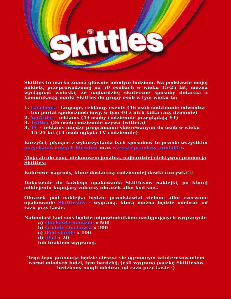 Skittles to marka znana głównie młodym ludziom. Na podstawie mojej ankiety, przeprowadzonej na 50 osobach w wieku 15-25 lat, można wyciągnąć wnioski, że najbardziej skuteczne sposoby dotarcia z komunikacją marki Skittles do grupy osób w tym wieku to: 1. Facebook – fanpage, reklamy, events (46 osób codziennie odwiedza ten portal społecznościowy, w tym 40 z nich kilka razy dziennie) 2. YouTube – reklamy (43 osoby codziennie przeglądają YT) 3. Twitter (26 osób codziennie używa Twittera) 3. TV – reklamy między programami skierowanymi do osób w wieku 15-25 lat (14 osób ogląda TV codziennie) Korzyści, płynące z wykorzystania tych sposobów to przede wszystkim pozyskanie nowych klientów oraz wzrost sprzedaży produktu. produktu. Moja atrakcyjna, niekonwencjonalna, najbardziej efektywna promocja Skittles: Kolorowe nagrody, które dostarczą codzienniej dawki rozrywki!!! Dołączenie do każdego opakowania Skittlesów naklejki, po której odklejeniu kupujący zobaczy obrazek albo kod sms. Obrazek pod naklejką będzie przedstawiał zielone albo czerwone opakowanie Skittlesów – wygraną, którą można będzie odebrać od razu przy kasie. Natomiast kod sms będzie odpowiednikiem następujących wygranych: a) słuchawki douszne x 500 b) średnie słuchawki x 200 c) iPod shuffle x 100 d) iPod x 20 lub brakiem wygranej. Tego typu promocja będzie cieszyć się ogromnym zainteresowaniem wśród młodych ludzi, tym bardziej, jeśli wygraną paczkę Skittlesów będziemy mogli odebrać od razu przy kasie :)