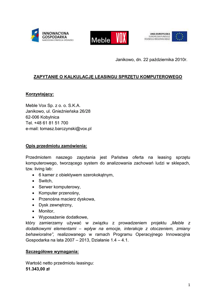Janikowo, dn. 22 października 2010r. ZAPYTANIE O KALKULACJĘ LEASINGU SPRZĘTU KOMPUTEROWEGO Korzystający: Meble Vox Sp. z o. o. S.K.A. Janikowo, ul. Gnieźnieńska 26/28 62-006 Kobylnica Tel. +48 61 81 51 700 e-mail: [email protected] Opis przedmiotu zamówienia: Przedmiotem naszego zapytania jest Państwa oferta na leasing sprzętu komputerowego, tworzącego system do analizowania zachowań ludzi w sklepach, tzw. living lab: 6 kamer z obiektywem szerokokątnym, Switch, Serwer komputerowy, Komputer przenośny, Przenośna macierz dyskowa, Dysk zewnętrzny, Monitor, Wyposażenie dodatkowe, który zamierzamy używać w związku z prowadzeniem projektu „Meble z dodatkowymi elementami – wpływ na emocje, interakcje z otoczeniem, zmiany behawioralne”, realizowanego w ramach Programu Operacyjnego Innowacyjna Gospodarka na lata 2007 – 2013, Działanie 1.4 – 4.1. Szczegółowe wymagania: Wartość netto przedmiotu leasingu: 51.343,00 zł 1 Termin realizacji zamówienia: Dostarczenie propozycji harmonogramu opłat leasingowych: do 05-11-2010. Termin wykonania przedmiotu zamówienia: do 31-12-2013. Opis sposobu przygotowania oferty: Oferta powinna zawierać: Całkowity koszt leasingu, Kalkulację rat na okres 36 miesięcy, Oferta powinna być skalkulowana w walucie polskiej (PLN). Miejsce i termin składania ofert oraz informacje dotyczące wyboru oferty: Oferty można składać: 1) Za pośrednictwem poczty elektronicznej na adres e-mail [email protected], lub 2) Pocztą lub kurierem na adres Zamawiającego z dopiskiem na kopercie „Zapytanie o ofertę na leasing sprzętu komputerowego w ramach działania POIG 1.4 – 4.1”, lub 3) Osobiście w siedzibie Zamawiającego (Sekretariat), od poniedziałku do piątku w godzinach od 9.00 do 15.00 . Termin składania ofert upływa w dniu 05-11-2010 (w przypadku ofert nadesłanych pocztą decyduje data wpływu). Oferty złożone po terminie nie będą rozpatrywane. Ocena ofert zostanie dokonana do dnia 10-11-2010. Kryteria oceny ofert: Zamawiający dokona oceny ważnych ofert na podstawie następujących kryteriów: 1) Cena ofertowa Dodatkowe informacje: Dodatkowych informacji udziela Pan Bogdan Wieczorek Tel. +61 81 51 700 e-mail [email protected] 2 Załącznik do zapytania o ofertę z dn. 22 października 2010r. na leasing sprzętu komputerowego, tworzącego system do analizowania zachowań ludzi w sklepach, tzw. living lab. Specyfikacja techniczna przedmiotu leasingu: Nazwa Kamera Switch Serwer komputerowy Komputer przenośny Przenośna macież dyskowa Dysk zewnętrzny Monitor Wyposażenie dodatkowe Opis Ilość Obiektyw szerokokątny, IP kolorowa, full HD 6 Min. 8 portów 1 Do nagrywania zapisu z kamer; procesor typu quad 1 lub równoważny; pamięć operacyjna typu DDR3; dysk twardy o pojemności min. 1TB; system operacyjny MS Windows 7 lub równoważny Do analiz zapisu: procesor typu Intel Core i5 lub 1 równoważny; dysk twardy o pojemności min. 500GB; pamięć podręczna min. 4GB; system operacyjny MS Windows 7 lub równoważny; pakiet MS Office 2010 lub równoważny Pamięć min. 8TB 1 Złącze USB, pamięć min. 2TB LCD, przekątna ekranu min. 32’’ Listwa zasilająca, patchpanel, zasilacz UPS gniazda RJ45, 1 1 1 3