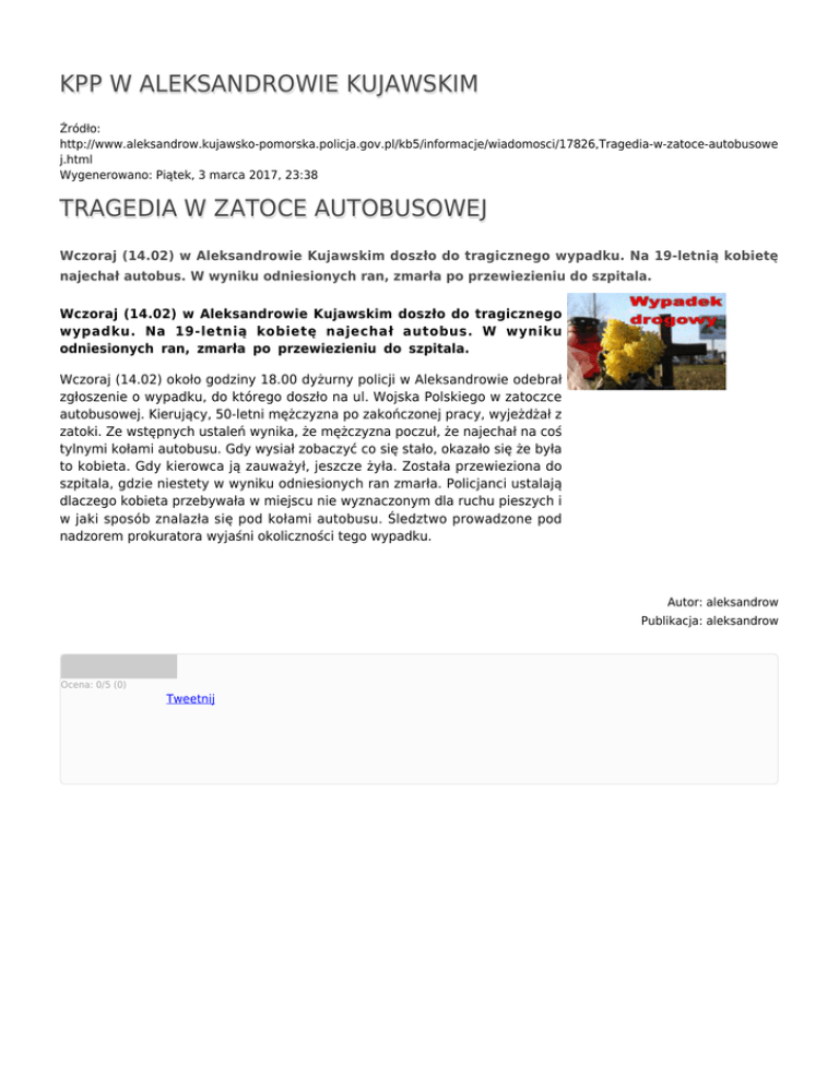 KPP W ALEKSANDROWIE KUJAWSKIM Źródło: http://www.aleksandrow.kujawsko-pomorska.policja.gov.pl/kb5/informacje/wiadomosci/17826,Tragedia-w-zatoce-autobusowe j.html Wygenerowano: Piątek, 3 marca 2017, 23:38 TRAGEDIA W ZATOCE AUTOBUSOWEJ Wczoraj (14.02) w Aleksandrowie Kujawskim doszło do tragicznego wypadku. Na 19-letnią kobietę najechał autobus. W wyniku odniesionych ran, zmarła po przewiezieniu do szpitala. Wczoraj (14.02) w Aleksandrowie Kujawskim doszło do tragicznego wypadku. Na 19-letnią kobietę najechał autobus. W wyniku odniesionych ran, zmarła po przewiezieniu do szpitala. Wczoraj (14.02) około godziny 18.00 dyżurny policji w Aleksandrowie odebrał zgłoszenie o wypadku, do którego doszło na ul. Wojska Polskiego w zatoczce autobusowej. Kierujący, 50-letni mężczyzna po zakończonej pracy, wyjeżdżał z zatoki. Ze wstępnych ustaleń wynika, że mężczyzna poczuł, że najechał na coś tylnymi kołami autobusu. Gdy wysiał zobaczyć co się stało, okazało się że była to kobieta. Gdy kierowca ją zauważył, jeszcze żyła. Została przewieziona do szpitala, gdzie niestety w wyniku odniesionych ran zmarła. Policjanci ustalają dlaczego kobieta przebywała w miejscu nie wyznaczonym dla ruchu pieszych i w jaki sposób znalazła się pod kołami autobusu. Śledztwo prowadzone pod nadzorem prokuratora wyjaśni okoliczności tego wypadku. Autor: aleksandrow Publikacja: aleksandrow Ocena: 0/5 (0) Tweetnij