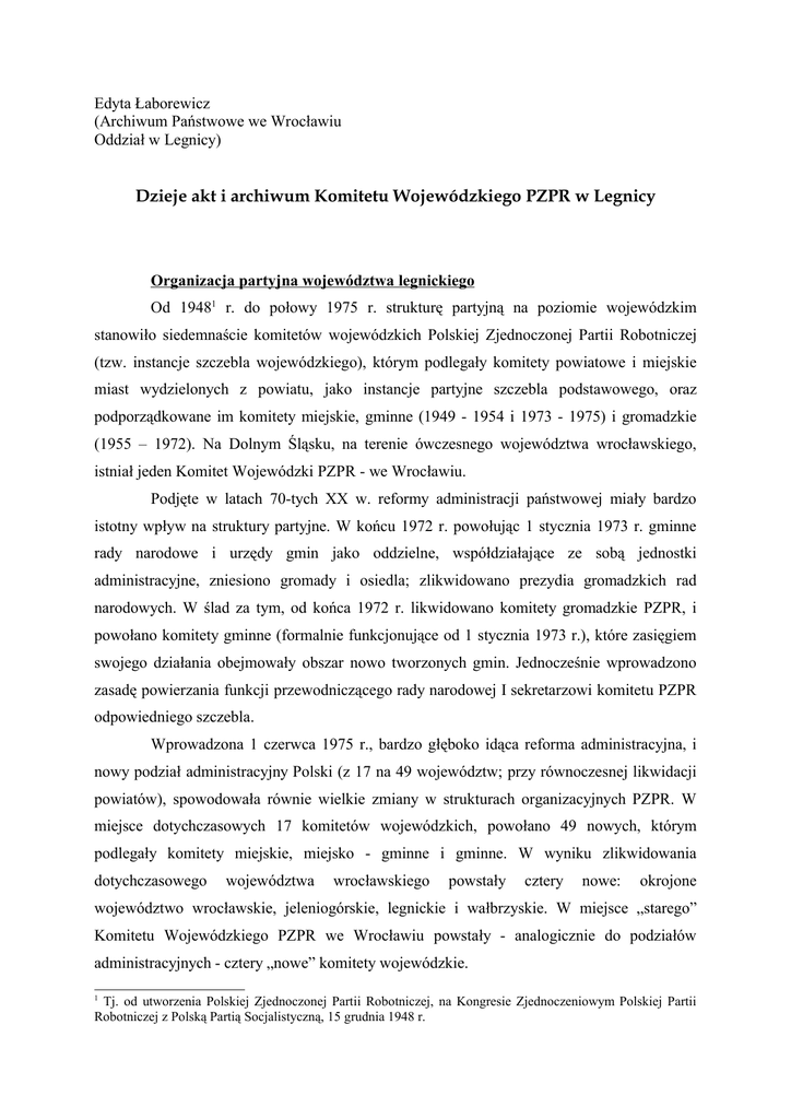 Edyta Łaborewicz (Archiwum Państwowe we Wrocławiu Oddział w Legnicy) Dzieje akt i archiwum Komitetu Wojewódzkiego PZPR w Legnicy Organizacja partyjna województwa legnickiego Od 19481 r. do połowy 1975 r. strukturę partyjną na poziomie wojewódzkim stanowiło siedemnaście komitetów wojewódzkich Polskiej Zjednoczonej Partii Robotniczej (tzw. instancje szczebla wojewódzkiego), którym podlegały komitety powiatowe i miejskie miast wydzielonych z powiatu, jako instancje partyjne szczebla podstawowego, oraz podporządkowane im komitety miejskie, gminne (1949 - 1954 i 1973 - 1975) i gromadzkie (1955 – 1972). Na Dolnym Śląsku, na terenie ówczesnego województwa wrocławskiego, istniał jeden Komitet Wojewódzki PZPR - we Wrocławiu. Podjęte w latach 70-tych XX w. reformy administracji państwowej miały bardzo istotny wpływ na struktury partyjne. W końcu 1972 r. powołując 1 stycznia 1973 r. gminne rady narodowe i urzędy gmin jako oddzielne, współdziałające ze sobą jednostki administracyjne, zniesiono gromady i osiedla; zlikwidowano prezydia gromadzkich rad narodowych. W ślad za tym, od końca 1972 r. likwidowano komitety gromadzkie PZPR, i powołano komitety gminne (formalnie funkcjonujące od 1 stycznia 1973 r.), które zasięgiem swojego działania obejmowały obszar nowo tworzonych gmin. Jednocześnie wprowadzono zasadę powierzania funkcji przewodniczącego rady narodowej I sekretarzowi komitetu PZPR odpowiedniego szczebla. Wprowadzona 1 czerwca 1975 r., bardzo głęboko idąca reforma administracyjna, i nowy podział administracyjny Polski (z 17 na 49 województw; przy równoczesnej likwidacji powiatów), spowodowała równie wielkie zmiany w strukturach organizacyjnych PZPR. W miejsce dotychczasowych 17 komitetów wojewódzkich, powołano 49 nowych, którym podlegały komitety miejskie, miejsko - gminne i gminne. W wyniku zlikwidowania dotychczasowego województwa wrocławskiego powstały cztery nowe: okrojone województwo wrocławskie, jeleniogórskie, legnickie i wałbrzyskie. W miejsce „starego” Komitetu Wojewódzkiego PZPR we Wrocławiu powstały - analogicznie do podziałów administracyjnych - cztery „nowe” komitety wojewódzkie. 1 Tj. od utworzenia Polskiej Zjednoczonej Partii Robotniczej, na Kongresie Zjednoczeniowym Polskiej Partii Robotniczej z Polską Partią Socjalistyczną, 15 grudnia 1948 r. 2 W skład województwa legnickiego weszło 38 jednostek administracji państwowej stopnia podstawowego, w tym 7 miast, 4 miasta – gminy, i 27 gmin. Analogicznie, utworzono 38 komitetów partyjnych stopnia podstawowego. Komitetowi Wojewódzkiemu PZPR w Legnicy, według stanu na 30 czerwca 1975 r. podlegało 7 Komitetów Miejskich (w Legnicy, Chojnowie, Głogowie, Jaworze, Lubinie, Polkowicach i Złotoryi; w latach 1981 - 1982 zlikwidowano komitety miejskie w Chojnowie, Polkowicach i Złotoryi), 4 Komitety Miejsko-Gminne (w Chocianowie, Prochowicach, Przemkowie i Ścinawie; w latach 1981 - 1982 powstały jeszcze trzy: w Chojnowie, Polkowicach i Złotoryi) oraz 27 Komitetów Gminnych2. W skład wymienionych wyżej organizacji, według danych ze stycznia 1978 r., wchodziło: 11 komitetów zakładowych liczących powyżej 400 członków i kandydatów, 20 komitetów zakładowych liczących do 400 członków i kandydatów, 833 podstawowe organizacje partyjne, 366 oddziałowych organizacji partyjnych, 913 grup partyjnych3. Legnicka organizacja partyjna liczyła 33 tysiące osób (w tym nieco ponad 26 tysięcy członków partii i ok. 6 tysięcy kandydatów). Oznaczało to, że „co 13 mieszkaniec [województwa] i co 5 zatrudniony w gospodarce uspołecznionej jest członkiem bądź kandydatem partii”4. W ciągu niespełna trzech lat istnienia (czerwiec 1975 – grudzień 1977 r.), liczebność legnickiej wojewódzkiej organizacji partyjnej wzrosła o prawie 20 %, a według stanu na styczeń 1980 r. liczba członków i kandydatów wzrosła do ponad 40 tysięcy5. Wydarzenia polityczne lat 1980-1983 spowodowały zmniejszenie liczebności organizacji, do ok. 26 tysięcy osób na 31 grudnia 1983 r.6 Ten stan ilościowy członków partii w województwie legnickim z niewielkimi wahaniami (nieco ponad 25 tysięcy osób) utrzymał się do samorozwiązania PZPR w styczniu 1990 r. Ilość etatowych pracowników KW wahała się od 102 w 1975 r. (w tym 53 pracowników politycznych), do ponad 130 w 1981 r. (w tym 65 politycznych). Najwięcej osób na stanowiskach politycznych było w latach 1983 - 1987 (ok. 70). W styczniu 1990 r. w Komitecie Wojewódzkim pozostało 67 pracowników aparatu partyjnego, w tym 31 pracowników politycznych. Pierwszą siedzibą Komitetu Wojewódzkiego PZPR w Legnicy był budynek po byłym Komitecie Powiatowym przy ul. Rewolucji Październikowej 1 (obecnie ul. Senatorska). Od 2 W: Chojnowie, Gaworzycach, Głogowie, Grębocicach, Gromadce, Jerzmanowej, Kotli, Krotoszycach, Kunicach, Legnickim Polu, Lubinie, Męcince, Miłkowicach, Mściwojowie, Paszowicach, Pęcławiu, Pielgrzymce, Polkowicach, Radwanicach, Rudnej, Rui, Udaninie, Warcie Bolesławieckiej, Wądrożu Wielkim, Zagrodnie, Złotoryi i Żukowicach. W 1981 r. zlikwidowano komitety w: Chojnowie, Polkowicach, Złotoryi. 3 „Legnicka Wojewódzka Organizacja Partyjna w liczbach”, Legnica, styczeń 1978, Komitet Wojewódzki Polskiej Zjednoczonej Partii Robotniczej w Legnicy (dalej: KW PZPR Legnica), sygn. 2379. 4 Tamże. 5 „Sprawozdanie Komitetu Wojewódzkiego Polskiej Zjednoczonej Partii Robotniczej za okres 1978-1979”, Legnica, styczeń 1980, s. 7, KW PZPR Legnica, sygn. 2380. 6 „Materiały z Wojewódzkiej Konferencji Sprawozdawczo-Wyborczej PZPR w Legnicy”, Legnica, 25 stycznia 1984 r., s. 6, KW PZPR Legnica, sygn. 2380. 3 15 października 1975 r. do 1990 r. siedzibą KW stał się gmach w centrum miasta, w pobliżu Rynku, przy ul. Rosenbergów 3 (obecnie ul. Najświętszej Marii Panny 3, siedziba Izby Skarbowej i Urzędu Skarbowego). Chociaż budynek był własnością Leg
