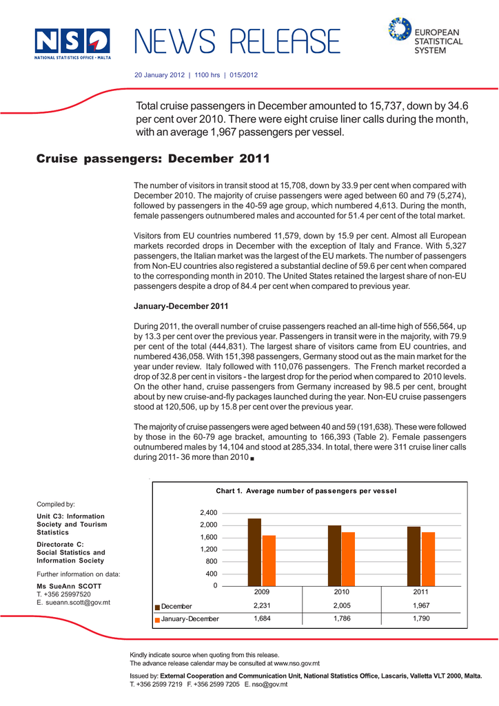 20 January 2012 | 1100 hrs | 015/2012 Total cruise passengers in December amounted to 15,737, down by 34.6 per cent over 2010. There were eight cruise liner calls during the month, with an average 1,967 passengers per vessel. Cruise passengers: December 2011 The number of visitors in transit stood at 15,708, down by 33.9 per cent when compared with December 2010. The majority of cruise passengers were aged between 60 and 79 (5,274), followed by passengers in the 40-59 age group, which numbered 4,613. During the month, female passengers outnumbered males and accounted for 51.4 per cent of the total market. Visitors from EU countries numbered 11,579, down by 15.9 per cent. Almost all European markets recorded drops in December with the exception of Italy and France. With 5,327 passengers, the Italian market was the largest of the EU markets. The number of passengers from Non-EU countries also registered a substantial decline of 59.6 per cent when compared to the corresponding month in 2010. The United States retained the largest share of non-EU passengers despite a drop of 84.4 per cent when compared to previous year. January-December 2011 During 2011, the overall number of cruise passengers reached an all-time high of 556,564, up by 13.3 per cent over the previous year. Passengers in transit were in the majority, with 79.9 per cent of the total (444,831). The largest share of visitors came from EU countries, and numbered 436,058. With 151,398 passengers, Germany stood out as the main market for the year under review. Italy followed with 110,076 passengers. The French market recorded a drop of 32.8 per cent in visitors - the largest drop for the period when compared to 2010 levels. On the other hand, cruise passengers from Germany increased by 98.5 per cent, brought about by new cruise-and-fly packages launched during the year. Non-EU cruise passengers stood at 120,506, up by 15.8 per cent over the previous year. The majority of cruise passengers were aged between 40 and 59 (191,638). These were followed by those in the 60-79 age bracket, amounting to 166,393 (Table 2). Female passengers outnumbered males by 14,104 and stood at 285,334. In total, there were 311 cruise liner calls during 2011- 36 more than 2010 Chart 1. Average num ber of passengers per vessel Compiled by: 2,400 Unit C3: Information Society and Tourism Statistics 2,000 1,600 Directorate C: Social Statistics and Information Society 1,200 800 400 Further information on data: Ms SueAnn SCOTT T. +356 25997520 E. [email protected] 0 2009 2010 2011 December 2,231 2,005 1,967 January-December 1,684 1,786 1,790 Table 1. Cruise passengers: Monthly 2009-2011 Absolute change December 2009 2010 2011 2011/2010 20,079 24,059 15,737 -8,322 4 138 15 -123 Transit 20,064 23,779 15,708 -8,071 Landed 11 142 14 -128 11,662 13,767 11,579 -2,188 France 2,349 2,201 2,927 726 Germany 3,493 3,682 1,198 -2,484 Italy 3,332 2,479 5,327 2,848 Malta 2 2 8 6 Spain 451 488 403 -85 1,002 3,950 1,166 -2,784 8,417 10,292 4,158 -6,134 Australia 99 352 97 -255 Canada 840 1,056 233 -823 Japan 216 312 116 -196 5,579 6,558 1,024 -5,534 9,310 11,498 7,642 -3,856 10,769 12,561 8,095 -4,466 0-19 2,399 2,827 2,905 78 20-39 3,368 3,372 2,460 -912 40-59 6,722 6,976 4,613 -2,363 60-79 7,221 9,971 5,274 -4,697 369 913 485 -428 9 12 8 -4 Total traffic Embarked Nationality EU of which: United Kingdom Non-EU of which: United States Sex: Males Females Age group: 80+ Cruise liner calls 2 Table 2. Cruise passengers: Cumulative 2009-2011 Absolute change January-December 2009 2010 2011 2011/2010 439,630 491,201 556,564 65,363 14,092 14,779 55,806 41,027 Transit 411,308 461,839 444,831 -17,008 Landed 14,230 14,583 55,927 41,344 2,575 3,044 1,021 -2,023 322,233 387,152 436,058 48,906 France 39,587 62,733 42,180 -20,553 Germany 68,344 76,258 151,398 75,140 Italy 89,857 121,942 110,076 -11,866 Malta 20,003 16,929 14,999 -1,930 Spain 33,945 31,428 34,957 3,529 United Kingdom 35,058 37,300 43,785 6,485 117,397 104,049 120,506 16,457 Australia 3,032 5,613 5,722 109 Canada 12,386 10,266 12,493 2,227 2,769 3,851 2,038 -1,813 67,840 44,388 49,053 4,665 Males 210,087 239,202 271,230 32,028 Females 229,543 251,999 285,334 33,335 0-19 62,680 75,245 87,001 11,756 20-39 84,038 86,371 97,402 11,031 40-59 146,731 158,684 191,638 32,954 60-79 134,714 156,873 166,393 9,520 11,467 14,028 14,130 102 261 275 311 36 Total traffic: Embarked Passengers visiting Gozo: Nationality EU of which: Non-EU of which: Japan United States Sex: Age group: 80+ Cruise liner calls 3 Methodological Notes 1. The data in this release are compiled on the basis of administrative records held by Transport Malta. 2. Cruise liners calling at both Malta and Gozo during a single voyage are recorded as one cruise liner call. Definitions: - Cruise passenger traffic comprises embarkations from Malta, transit passengers and passengers landing in Malta. - Embarkations comprise all cruise passengers who are either Maltese nationals leaving Malta on a cruise ship, or foreigners who come to Malta by other means of transport and leaving on a cruise ship. - Transit passengers comprise all cruise passengers who arrive in and leave Malta on the same cruise ship. - Landings comprise all cruise passengers who arrive in Malta on a cruise ship and leave by other means of transport, or alternatively, stay in Malta. . 4