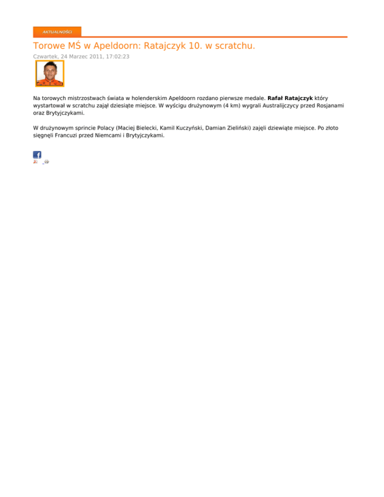 Torowe MŚ w Apeldoorn: Ratajczyk 10. w scratchu. Czwartek, 24 Marzec 2011, 17:02:23 Na torowych mistrzostwach świata w holenderskim Apeldoorn rozdano pierwsze medale. Rafał Ratajczyk który wystartował w scratchu zajął dziesiąte miejsce. W wyścigu drużynowym (4 km) wygrali Australijczycy przed Rosjanami oraz Brytyjczykami. W drużynowym sprincie Polacy (Maciej Bielecki, Kamil Kuczyński, Damian Zieliński) zajęli dziewiąte miejsce. Po złoto sięgnęli Francuzi przed Niemcami i Brytyjczykami.