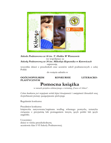 Szkoła Podstawowa nr 16 im. T. Halika W Warszawie we współpracy ze Szkołą Podstawową nr 34 im. Mikołaja Kopernika w Katowicach zapraszają wszystkie dzieci z przedszkoli oraz uczniów szkół podstawowych z całej Polski do wzięcia udziału w OGÓLNOPOLSKIM PLASTYCZNYM KONKURSIE LITERACKO- Pomocna książka w ramach projektu edukacyjnego e-twinning „Faces of Africa”. Celem konkursu jest rozwijanie wśród dzieci kreatywności i umiejętności literackich oraz kształtowanie postawy zaangażowania społecznego. Regulamin konkursu: Przedmiot konkursu: książeczka narysowana/napisana według własnego pomysłu, tematyka związana z przyjaźnią lub pomaganiem innym, język polski lub język angielski. Uczestnicy: dzieci w wieku przedszkolnym; uczniowie klas I-VI Szkoły Podstawowej. Warunki uczestnictwa: stworzenie własnej, niepowtarzalnej książki zawierającej np. rysunki, opowiadanie, krótką opowieść przygodową, bajkę, tomik poezji lub komiks; technika wykonania dowolna; książki mogą być wzbogacone ilustracjami, zdjęciami, rysunkami; Prace mogą być indywidualne lub grupowe (max 3 osobowe). Szkoła może przesłać dowolną ilość prac. Do pracy każdego z uczestników należy dołączyć: Karta zgłoszenia (załącznik nr 1), Zgoda rodzica/opiekuna prawnego autora pracy na przetwarzanie i publikację danych osobowych (załącznik nr 2)- według zamieszczonych wzorów. Kryteria oceny: oryginalność ujęcia tematu; poprawność i bogactwo języka (w przypadku książeczek tekstowych); bogactwo ilustracji, zdjęć czy rysunków. Nadesłane prace będą oceniane w a. praca zbiorowa (w grupie max. 3-osobowej). b. dzieci w wieku przedszkolnym. c. uczniowie klas1-3. d. uczniowie klas 4-6. czterech kategoriach: Termin konkursu: prace można składać do dnia 23 marca 2017 r. (czwartek), osobiście w sekretariacie Szkoły Podstawowej nr 16 w Warszawie lub nadsyłać na adres szkoły: Szkoła Podstawowa nr 16 im. Tony Halika ul. Wilczy Dół 4 02- 798 Warszawa z dopiskiem „Pomocna książka”. We wszystkich przypadkach decyduje data dostarczenia pracy do Organizatora. Rozstrzygnięcie konkursu nastąpi 27.03.2017 r. Oceny prac dokona jury powołane przez organizatorów. Wszyscy laureaci i ich opiekunowie zostaną powiadomieni o werdykcie komisji konkursowej. Wyniki konkursu zostaną podane na stronach internetowych szkół organizujących konkurs oraz na platformie e-twinning. Nagrody dla laureatów spoza Warszawy mogą być wysłane pocztą. Koszt nagród pokrywa organizator. Uroczyste wręczenie nagród odbędzie się w SP nr 16 im. T. Halika w Warszawie podczas przedstawienia i licytacji książeczek „Pomocna książka” (data i godzina przedstawienia będą umieszczone na stronie szkoły). Wszystkie przedmioty (artykuły papiernicze)z licytacji książeczek zostaną przekazane na rzecz Fundacji Dzieci- Dzieciom w ramach programu Kidongo- odkrywanie talentów dzieci mieszkających w Afryce. Więcej na ten temat : http://www.kidongo.pl/strona-glowna Organizatorzy zastrzegają sobie prawo do umieszczenia pracy (lub jej fragmentów) na stronie internetowej Szkoły Podstawowej nr 16 im. T. Halika w Warszawie oraz przekazania wszystkich prac na licytację szkolną. Dodatkowych informacji dotyczących konkursu udzielają koordynatorzy konkursu Edyta Karwowska (e-mail: [email protected]), Kornelia Magiera (e-mail: [email protected]), Ania Milerska ([email protected]). Załącznik nr 2: Zgoda rodzica/opiekuna prawnego na przetwarzanie i publikację danych osobowych autora pracy Wyrażam zgodę na podawanie do wiadomości publicznej imienia i nazwiska mojego dziecka- ………………………………………………………… * w związku z jego udziałem w Ogólnopolskim Konkursie LiterackoPlastycznym POMOCNA KSIĄŻKA organizowanym przez Szkołę Podstawową nr 16 im. T. Halika w Warszawie we współpracy ze Szkołą Podstawową nr 34 im. Mikołaja Kopernika w Katowicach we wszelkich ogłoszeniach, zapowiedziach i informacjach o tym konkursie i jego wynikach. Wyrażam również zgodę na przetwarzanie przez Organizatorów Konkursu danych osobowych umieszczonych w zgłoszeniu, w zakresie prowadzenia i realizacji Konkursu. Jednocześnie oświadczam, że jestem świadoma/my dobrowolności podania danych oraz, że zostałam/em poinformowana/y o prawie wglądu do podanych danych oraz możliwości ich poprawiania. Zgodnie z ustawą z dnia 29 sierpnia 1997r. o ochronie danych osobowych (tj. Dz.U. z 2002 r. poz. 926 z późniejszymi zmianami) ............................................................................................................ (data i czytelny podpis rodzica/opiekuna prawnego autora pracy) * imię i nazwisko autora pracy Pieczątka placówki Załącznik nr 1: KARTA ZGŁOSZENIA Ogólnopolski Konkurs Literacko-Plastyczny POMOCNA KSIĄŻKA PROSIMY WYPEŁNIĆ PISMEM DRUKOWANYM 1. Imię i nazwisko ucznia/uczniów ............................................................................................................................... klasa .……………………… 2. Imię i nazwisko nauczyciela, pod kierunkiem, którego powstała praca: ………...……………………………………………………………….. nauczany przedmiot: .…………………………………………………….………………….. 3. Nazwa i adres przedszkola/szkoły: …………...…..……...………………………………………………….. ……...…..……...……………………………………………………….. województwo: …………………………………………………………………………. e-mail:……………………………….… telefon ……………………… ………………………… ( podpis rodzica/opiekuna dziecka)