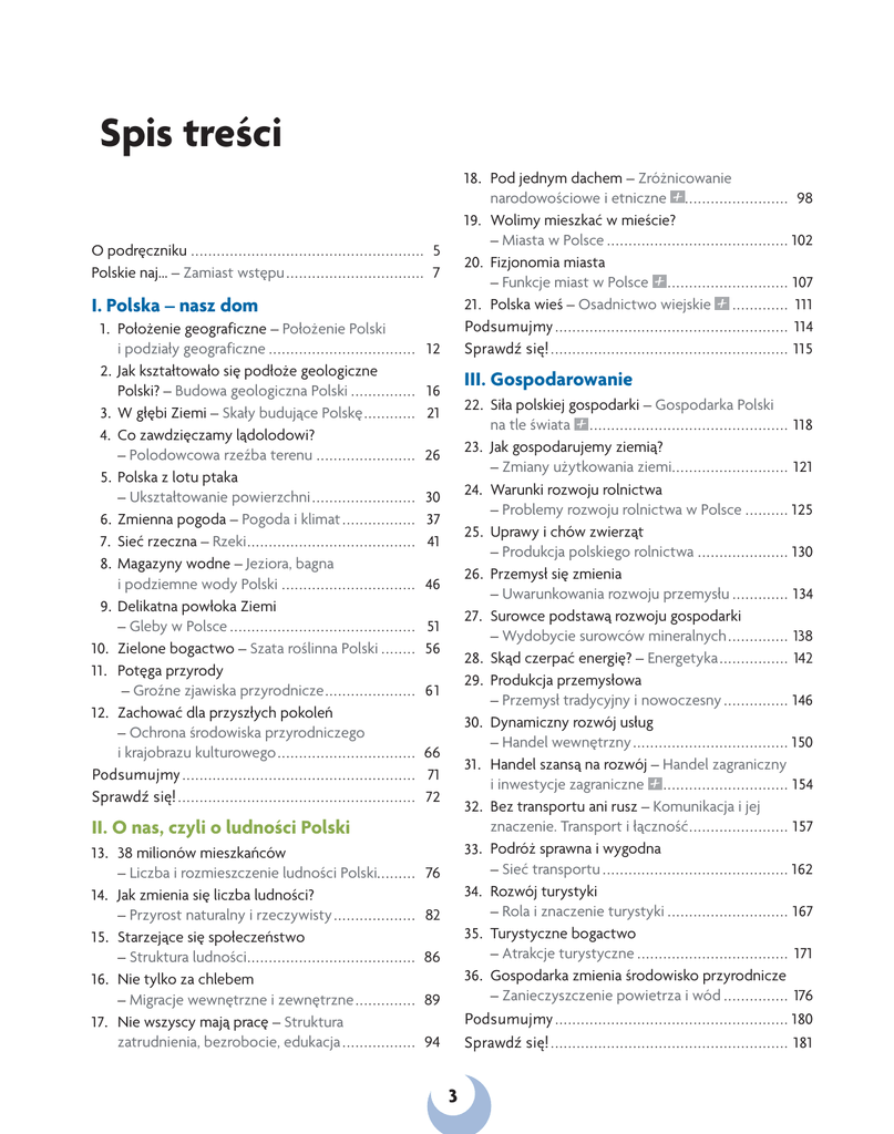 Spis treści 18. Pod jednym dachem – Zróżnicowanie narodowościowe i etniczne ........................ 98 19. Wolimy mieszkać w mieście? – Miasta w Polsce .......................................... 102 20. Fizjonomia miasta – Funkcje miast w Polsce ............................ 107 21. Polska wieś – Osadnictwo wiejskie ............. 111 Podsumujmy ...................................................... 114 Sprawdź się! ....................................................... 115 O podręczniku ...................................................... 5 Polskie naj… – Zamiast wstępu ................................ 7 I. Polska – nasz dom 1. Położenie geograficzne – Położenie Polski i podziały geograficzne .................................. 2. Jak kształtowało się podłoże geologiczne Polski? – Budowa geologiczna Polski ............... 3. W głębi Ziemi – Skały budujące Polskę ............ 4. Co zawdzięczamy lądolodowi? – Polodowcowa rzeźba terenu ....................... 5. Polska z lotu ptaka – Ukształtowanie powierzchni ........................ 6. Zmienna pogoda – Pogoda i klimat ................. 7. Sieć rzeczna – Rzeki ....................................... 8. Magazyny wodne – Jeziora, bagna i podziemne wody Polski ............................... 9. Delikatna powłoka Ziemi – Gleby w Polsce ........................................... 10. Zielone bogactwo – Szata roślinna Polski ........ 11. Potęga przyrody – Groźne zjawiska przyrodnicze ..................... 12. Zachować dla przyszłych pokoleń – Ochrona środowiska przyrodniczego i krajobrazu kulturowego ................................ Podsumujmy ...................................................... Sprawdź się! ....................................................... 12 III. Gospodarowanie 16 21 22. Siła polskiej gospodarki – Gospodarka Polski na tle świata .............................................. 118 23. Jak gospodarujemy ziemią? – Zmiany użytkowania ziemi........................... 121 24. Warunki rozwoju rolnictwa – Problemy rozwoju rolnictwa w Polsce .......... 125 25. Uprawy i chów zwierząt – Produkcja polskiego rolnictwa ..................... 130 26. Przemysł się zmienia – Uwarunkowania rozwoju przemysłu ............. 134 27. Surowce podstawą rozwoju gospodarki – Wydobycie surowców mineralnych .............. 138 28. Skąd czerpać energię? – Energetyka ................ 142 29. Produkcja przemysłowa – Przemysł tradycyjny i nowoczesny ............... 146 30. Dynamiczny rozwój usług – Handel wewnętrzny .................................... 150 31. Handel szansą na rozwój – Handel zagraniczny i inwestycje zagraniczne ............................. 154 32. Bez transportu ani rusz – Komunikacja i jej znaczenie. Transport i łączność ....................... 157 33. Podróż sprawna i wygodna – Sieć transportu ........................................... 162 34. Rozwój turystyki – Rola i znaczenie turystyki ............................ 167 35. Turystyczne bogactwo – Atrakcje turystyczne ................................... 171 36. Gospodarka zmienia środowisko przyrodnicze – Zanieczyszczenie powietrza i wód ............... 176 Podsumujmy ...................................................... 180 Sprawdź się! ....................................................... 181 26 30 37 41 46 51 56 61 66 71 72 II. O nas, czyli o ludności Polski 13. 38 milionów mieszkańców 14. 15. 16. 17. – Liczba i rozmieszczenie ludności Polski......... Jak zmienia się liczba ludności? – Przyrost naturalny i rzeczywisty ................... Starzejące się społeczeństwo – Struktura ludności ....................................... Nie tylko za chlebem – Migracje wewnętrzne i zewnętrzne .............. Nie wszyscy mają pracę – Struktura zatrudnienia, bezrobocie, edukacja ................. 76 82 86 89 94 3 IV. Dookoła świata V. Nasi sąsiedzi 37. W moim regionie ......................................... 184 38. Chłodny, błękitny akwen – Morze Bałtyckie ......................................... 187 39. Nad Bałtykiem – Niziny nadmorskie............... 190 40. Bezcenne jeziora – Polskie pojezierza ............ 199 41. Zróżnicowane niziny – Niziny staroglacjalne .................................. 206 42. Malownicze wyżyny – Wyżyny Polskie ........... 215 43. Na przedpolu Karpat – Kotliny podkarpackie ................................. 222 44. Najmłodsze i najwyższe góry – Karpaty .......... 228 45. Skarby gór – Sudety ...................................... 237 Podsumujmy ...................................................... 244 Sprawdź się! ....................................................... 246 46. Granice Polski – Zmiany położenia i granic Polski ............................................... 250 47. Po co współpracujemy z sąsiadami? – Współpraca transgraniczna ......................... 255 48. Polska w Unii Europejskiej – Polska jako członek wspólnoty ............... 259 49. Największa potęga gospodarcza Europy – Niemcy ..................................................... 50. Największe państwo świata – Rosja ............... 51. Trudny czas reform – Ukraina ........................ 52. Izolacja utrudniająca rozwój – Białoruś ........... 53. Kraj nadbałtycki nad Niemnem – Litwa .......... 54. Kraj nad Wełtawą – Czechy ........................... 55. Po drugiej stronie Tatr – Słowacja .................. Podsumujmy ...................................................... Sprawdź się! ....................................................... 263 269 275 279 283 286 290 295 296 Odpowiedzi ....................................................... 298 Indeks rzeczowy polsko-angielski ........................ 300 4