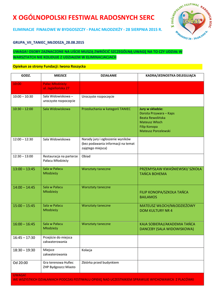 X OGÓLNOPOLSKI FESTIWAL RADOSNYCH SERC ELIMINACJE FINAŁOWE W BYDGOSZCZY - PAŁAC MŁODZIEŻY - 28 SIERPNIA 2015 R. GRUPA_VII_TANIEC_MŁODSZA_28.08.2015 UWAGA! OSOBY ZAZNACZONE NA LIŚCIE MUSZĄ ZWRÓCIĆ SZCZEGÓLNĄ UWAGĘ NA TO CZY UDZIAŁ W WARSZTATCH NIE KOLIDUJE Z UDZIAŁEM W ELIMINACJACJACH Opiekun ze strony Fundacji: Iwona Roszycka GODZ. MIEJSCE DZIAŁANIE KADRA/JEDNOSTKA DELEGUJĄCA 10:00 Pałac Młodzieży ul. Jagiellońska 27 10:00 – 10:30 Sala Widowiskowa – uroczyste rozpoczęcie Uroczyste rozpoczęcie 10:30 – 12:00 Sala Widowiskowa Przesłuchania w kategorii TANIEC 12:00 – 12:30 Sala Widowiskowa Narady jury i ogłoszenie wyników (bez podawania informacji na temat zajętego miejsca) 12:30 – 13:00 Restauracja na parterze Pałacu Młodzieży Obiad 13:00 – 13:45 Sala w Pałacu Młodzieży Warsztaty taneczne 14:00 – 14:45 Sala w Pałacu Młodzieży Warsztaty taneczne 15:00 – 15:45 Sala w Pałacu Młodzieży Warsztaty taneczne MATEUSZ WŁOCH/MŁODZIEŻOWY DOM KULTURY NR 4 16:00 – 16:45 Sala w Pałacu Młodzieży Warsztaty taneczne KAJA SOBIERAJ/AKADEMIA TAŃCA DANCEBY (SALA WIDOWISKOWA) 16:45 – 17:30 Przejście do miejsca zakwaterowania 18:30 – 19:30 Miejsce zakwaterowania Kolacja Od 20:00 Gra terenowa Hufiec ZHP Bydgoszcz Miasto Zbiórka przed budynkiem Jury w składzie: Dorota Przywara – Kaps Beata Rewolińska Mateusz Włoch Filip Konopa Mateusz Porcelewski PRZEMYSŁAW KWAŚNIEWSKI/ SZKOŁA TAŃCA BOHEMA FILIP KONOPA/SZKOŁA TAŃCA BAILAMOS UWAGA! WE WSZYSTKICH DZIAŁANIACH PODCZAS FESTIWALU OPIEKĘ NAD UCZESTNIKIEM SPRAWUJE WYCHOWAWCA Z PLACÓWKI LICZBA DZIECI WIEK DZIECI LICZBA OPIEKUNÓW RAZEM 26 9-17 11 37 LISTA OSÓB Lp. 1. 2. 3. 4. 5. 6. Nazwa placówki Adres Dane opiekuna Dom Dziecka im. Janusza Korczaka w Płońsku Ul. Wolności 8/10 09-100 Płońsk Małgorzata Knaf Świetlica ŚrodowiskowoIntegracyjna „Dom Jana Pawła II” Piastów Ul. 11-go Listopada 8 05-820 Piastów Placówka OpiekuńczoWychowawcza „Tęcza” w Kutnie Ul. Karłowicza 1 99-300 Kutno Placówka OpiekuńczoWychowawcza nr 3 w Porszewicach Porszewice 18 E/3 95-200 Pabianice Dom Dziecka im. Janusza Korczaka w Tarnowie Opolskim Ul. Korczaka 1 46-050 Placówka OpiekuńczoWychowawcza „Dom” w Skierniewicach Eliza Bieńkowska Bożena Różycka Joanna Szczuka – Katarzyna Wójcikowska Marcin Ufnal Tarnów Opolski Ul. Nowobielańska 100 96-100 Skierniewice Uczestnik Wiek Grupa „Brylanciki”: 1. Anita Olszewska (MFS, P) 2. Małgorzata Szymborska (MFS, P) 3. Marta Czarnecka (MFS, P) 4. Sandra Grzonkowska (MFS) 5. Weronika Kuszmider (MFS) 15 12 11 13 14 Grupa „Every Style”: 1. Alicja Goś 2. Kamila Błoniewska (MFS, P) 3. Marzena Goś (MFS) 4. Natalia Bednarczyk (P) 5. Paulina Skumiał 16 14 13 15 14 Grupa „Super Skład”: 1. Anna Matysiak (F) 2. Jakub Szybkowski Agnieszka Czajkowska 3. Marika Kukuła (F) 4. Natalia Szybkowska 5. Przemysław Stańczyk Beata Nodzak Martyna Fornalczyk Grupa „Soul Dance”: 1. Karolina Karolczak 2. Karolina Winiarek 3. Patrycja Jurek 4. Patrycja Pietrasiak Małgorzata Pietruszka Grupa „Mażoretki”: 1. Anna Kowalska 2. Julia Okoń 3. Roksana Telatyńska (prawdopodobnie nie przyjedzie) 4. Wiktoria Szymaniec Majka Kowalczyk Grupa „Empiem”: 1. Magdalena Grzegorzewska 2. Martyna Kwiatkowska 3. Patrycja Kwiatkowska 13 10 17 13 12 14 13 11 13 11 9 11 10 11 15 11