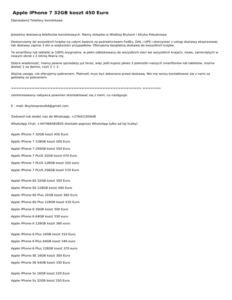 Apple iPhone 7 32GB koszt 450 Euro [Sprzedam] Telefony komórkowe Jesteśmy dostawcą telefonów komórkowych. Mamy sklepów w Wielkiej Brytanii i Afryka Południowa Dostarczamy do wszystkich krajów na całym świecie za pośrednictwem FedEx, DHL i UPS i skorzystać z usługi dostawy ekspresowej tak dostawy zajmie 3 dni w większości przypadków. Oferujemy bezpłatną dostawę do wszystkich krajów. Te smartfony lub tabletki w 100% oryginalne, w pełni odblokowany do wszystkich sieci we wszystkich krajach, nowe, zamkniętych w nowym oknie z 2 letnią Warra nty. Dobra wiadomość, mamy pewne sprzedaży już teraz, więc jeśli kupisz jakieś 3 jednostki naszych smartfonów lub tabletów, można dostać 1 za darmo, czyli 3 + 1: Ważna uwaga: nie oferujemy pobraniem. Płatność musi być dokonana przed dostawą. Nie ma sensu kontaktować się z nami za gotówkę za pobraniem ================================================== ======= zainteresowany nabywca powinien skontaktować się z nami, co następuje: E - mail: [email protected] Zadzwoń lub dodać nas do Whatsapp: +27642105648 WhatsApp Chat: +447466483835 (kontakt poprzez WhatsApp tylko od tej liczby) Apple iPhone 7 32GB koszt 450 Euro Apple iPhone 7 128GB koszt 500 Euro Apple iPhone 7 256GB koszt 550 Euro Apple iPhone 7 PLUS 32GB koszt 470 Euro Apple iPhone 7 PLUS 128GB koszt 520 euro Apple iPhone 7 PLUS 256GB koszt 570 Euro Apple iPhone 6S 32GB koszt 350 Euro Apple iPhone 6S 128GB koszt 400 Euro Apple iPhone 6S Plus 32GB koszt 360 Euro Apple iPhone 6S Plus 128GB koszt 410 Euro Apple iPhone 6 16GB koszt 300 Euro Apple iPhone 6 64GB koszt 330 euro Apple iPhone 6 128GB koszt 360 euro Apple iPhone 6 Plus 16GB koszt 310 Euro Apple iPhone 6 Plus 64GB koszt 340 euro Apple iPhone 6 Plus 128GB koszt 370 euro Apple iPhone SE 16GB koszt 300 Euro Apple iPhone SE 64GB koszt 330 Euro Apple iPhone 5s 16GB koszt 220 Euro Apple iPhone 5s 32GB koszt 250 Euro Apple iPhone 5s 64GB koszt 280 euro Apple iPad Pro WiFi 32GB koszt 400 Euro Apple iPad WiFi Pro 128GB koszt 440 Euro Apple iPad WiFi + Cellular Pro 128GB koszt 500 Euro Air2 Apple iPad WiFi + Cellular 32GB koszt 350 Euro Air2 Apple iPad WiFi + Cellular 64GB koszt 390 Euro Apple iPad WiFi + Cellular 128GB Air2 koszt 440 Euro Apple iPad Air WiFi + Cellular 16GB koszt 300 Euro Apple iPad Air WiFi + Cellular 32GB koszt 340 Euro Apple Mini iPad 4 WiFi + Cellular 16GB koszt 330 Euro Apple Mini iPad 4 WiFi + Cellular 64GB koszt 370 Euro Apple Mini iPad 4 WiFi + Cellular 128GB koszt 410 Euro Samsung Galaxy S7 EDGE 32GB + GEAR VR cost 400euro Samsung Galaxy S7 EDGE 64GB + GEAR VR cost 440euro Samsung Galaxy S7 32GB + GEAR VR cost 380euro Samsung Galaxy S6 32GB cost 250 euro Samsung Galaxy S6 64GB cost 280 Euro Samsung Galaxy S6 128GB cost 300 euro Samsung Galaxy S6 EDGE 32GB cost 300 euro Samsung Galaxy S6 EDGE 64GB cost 330 euro Samsung Galaxy S6 EDGE 128GB cost 360 Euro Samsung Galaxy S6 EDGE Plus 32GB cost 350 euro Samsung Galaxy S6 EDGE Plus 64GB cost 380 euro Samsung Galaxy Note 5 SM-N9208 32GB cost 380 euro Samsung Galaxy Note 4 EDGE 32GB cost 300 euro ================================================== ======= zainteresowany nabywca powinien skontaktować się z nami, co następuje: E - mail: [email protected] Zadzwoń lub dodać nas do Whatsapp: +27642105648 WhatsApp Chat: +447466483835 (kontakt poprzez WhatsApp tylko od tej liczby) Informacje dodatkowe Stan Nowy Adres ogłoszenia http://www.superoferty24.pl/-apple-iphone-7-32gb-koszt-450-euro,o1011 Kontakt Mail: [email protected] Telefon: +27642105648 Lokalizacja Wielkiej Brytanii i Afryka Południowa, Wielkiej Brytanii i Afryka Południowa Mazowieckie (Wielka Brytania) Ogłoszenie dodano: 2016-11-11 07:06:39 Ogłoszenie wygasa: 2017-05-10 09:01:49 Powered by TCPDF (www.tcpdf.org)