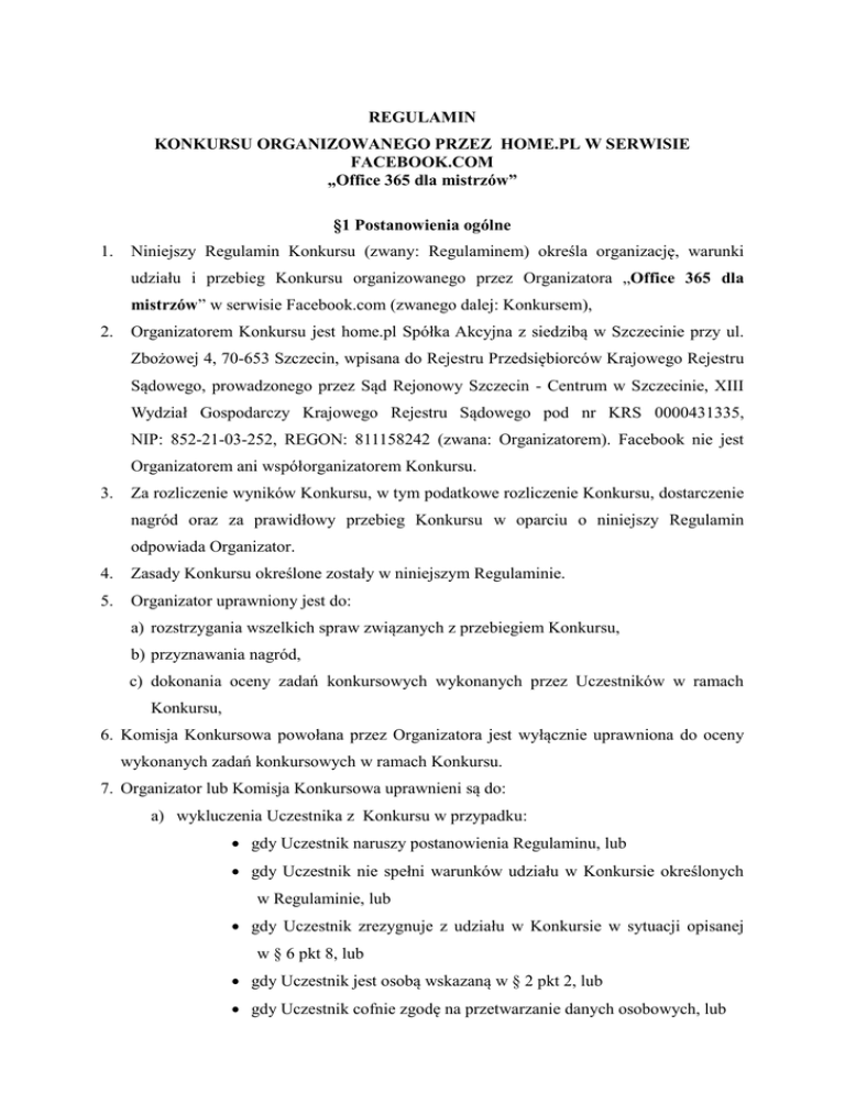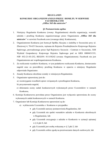 REGULAMIN KONKURSU ORGANIZOWANEGO PRZEZ HOME.PL W SERWISIE FACEBOOK.COM „Office 365 dla mistrzów” §1 Postanowienia ogólne 1. Niniejszy Regulamin Konkursu (zwany: Regulaminem) określa organizację, warunki udziału i przebieg Konkursu organizowanego przez Organizatora „Office 365 dla mistrzów” w serwisie Facebook.com (zwanego dalej: Konkursem), 2. Organizatorem Konkursu jest home.pl Spółka Akcyjna z siedzibą w Szczecinie przy ul. Zbożowej 4, 70-653 Szczecin, wpisana do Rejestru Przedsiębiorców Krajowego Rejestru Sądowego, prowadzonego przez Sąd Rejonowy Szczecin - Centrum w Szczecinie, XIII Wydział Gospodarczy Krajowego Rejestru Sądowego pod nr KRS 0000431335, NIP: 852-21-03-252, REGON: 811158242 (zwana: Organizatorem). Facebook nie jest Organizatorem ani współorganizatorem Konkursu. 3. Za rozliczenie wyników Konkursu, w tym podatkowe rozliczenie Konkursu, dostarczenie nagród oraz za prawidłowy przebieg Konkursu w oparciu o niniejszy Regulamin odpowiada Organizator. 4. Zasady Konkursu określone zostały w niniejszym Regulaminie. 5. Organizator uprawniony jest do: a) rozstrzygania wszelkich spraw związanych z przebiegiem Konkursu, b) przyznawania nagród, c) dokonania oceny zadań konkursowych wykonanych przez Uczestników w ramach Konkursu, 6. Komisja Konkursowa powołana przez Organizatora jest wyłącznie uprawniona do oceny wykonanych zadań konkursowych w ramach Konkursu. 7. Organizator lub Komisja Konkursowa uprawnieni są do: a) wykluczenia Uczestnika z Konkursu w przypadku: gdy Uczestnik naruszy postanowienia Regulaminu, lub gdy Uczestnik nie spełni warunków udziału w Konkursie określonych w Regulaminie, lub gdy Uczestnik zrezygnuje z udziału w Konkursie w sytuacji opisanej w § 6 pkt 8, lub gdy Uczestnik jest osobą wskazaną w § 2 pkt 2, lub gdy Uczestnik cofnie zgodę na przetwarzanie danych osobowych, lub gdy Uczestnik nie wykona zobowiązania wskazanego w § 2 pkt 4 lit. d. 8. O wykluczeniu Uczestnika z Konkursu Organizator informuje Uczestnika na fanpage Organizatora w serwisie Facebook.com. Zadanie konkursowe wykonane i zgłoszone do Konkursu przez wykluczonych Uczestników z Konkursu nie podlega ocenie przez Komisję Konkursową. §2 Uczestnicy konkursu 1. W Konkursie mogą brać udział osoby fizyczne które: a) posiadają pełną zdolność do czynności prawnych, oraz b) posiadają miejsce zamieszkania lub miejsce stałego pobytu na terenie Rzeczpospolitej Polskiej, oraz c) są użytkownikami serwisu Facebook.com, oraz d) korzystają z usług oferowanych przez Organizatora. 2. Z udziału w Konkursie wyłączeni są pracownicy Organizatora. Przez pracowników Organizatora rozumie się osoby zatrudnione u Organizatora na podstawie umowy o pracę, osoby współpracujące z Organizatorem na podstawie umowy zlecenia lub na podstawie innej umowy cywilnoprawnej. 3. Warunkiem uczestnictwa w danym Konkursie jest wyrażenie wzięcia woli w danym Konkursie poprzez wykonanie i zgłoszenie zadania konkursowego na zasadach i warunkach opisanych w Regulaminie. 4. Wyrażenie wzięcia woli w danym Konkursie w sposób opisany w pkt 3 powyżej oznacza: a) zaakceptowanie niniejszego Regulaminu przez Uczestnika w dniu wykonanie i zgłoszenie zadania konkursowego na zasadach i warunkach opisanych w Regulaminie, oraz b) wyrażenie, w dniu wykonania i zgłoszenia zadania konkursowego na zasadach i warunkach opisanych w Regulaminie, zgody na przetwarzanie danych osobowych Uczestnika Konkursu, a także powierzenie ich przetwarzania podmiotom trzecim w celach koniecznych do przeprowadzenia Konkursu, w tym ogłoszenia jego wyników, rozliczenia Konkursu, w tym podatkowego, przekazania nagród, oraz c) wyrażenie, w dniu wykonania i zgłoszenia zadania konkursowego na zasadach i warunkach opisanych w Regulaminie, zgody na upublicznienie nazwiska i imienia Uczestnika w związku z ogłoszeniem wyników Konkursu, w tym na blog.home.pl, oraz d) zobowiązanie się do podania Organizatorowi danych koniecznych do dostarczenia nagrody i rozliczenia Konkursu, w tym rozliczenia podatkowego. §3 Organizacja i przebieg Konkursu 1. Konkurs trwa od dnia 24.08.2016 roku do dnia 28.08.2016 roku. 2. W ramach Konkursu Uczestnik wykonuje zadanie konkursowe polegające na udzieleniu na fanpage Organizatora w serwisie Facebook.com w okresie trwania Konkursu wskazanym w pkt 1, odpowiedzi na pytanie zadane przez Organizatora, które brzmi : „Który element pakietu Office 365 pomógłby Tobie w zdobyciu przewagi nad konkurencją? Uzasadnij swój wybór.” 3. Komisja Konkursowa wybiera 5 zwycięzców Konkursu. 4. Kryteriami oceny wykonania zadań konkursowych będą: a) kolejność zgłoszeń, b) użyteczność, c) kreatywność, 5. O zdobyciu statusu zwycięzcy Konkursu Uczestnik zostanie poinformowany przez Organizatora na fanpage Organizatora w serwisie Facebook.com do dnia 30.08.2016 roku. §4 Nagrody 1. Zwycięzca Konkursu otrzyma nagrodę rzeczową w postaci zestawu gadżetów firmowych home.pl i partnerów home.pl: koszulki, okularów, kubka, czyścika, saszetki na kartę bankomatową oraz pojemnika na obiad. Wartość nagrody rzeczowej wynosi 100 zł (słownie: sto) złotych. Wysyłki nagród Organizator w terminie 14 dni od daty wskazanej w § 3 pkt 5. 2. W sytuacji, gdy uzyskanie nagrody opisanej w pkt 1 przez Uczestnika będzie skutkowało powstaniem obowiązku odprowadzenia przez Organizatora do właściwego urzędu skarbowego zryczałtowanego podatku dochodowego od osób fizycznych od nagród konkursowych, Uczestnik uprawniony do nagrody rzeczowej, otrzyma dodatkowo nagrodę pieniężną w wysokości stanowiącej równowartość 11,11% wartości nagrody rzeczowej, przy czym wskazana nagroda pieniężna przeznaczona zostanie przez Organizatora wyłącznie na pokrycie zryczałtowanego podatku dochodowego od przyznanej uczestnikowi nagrody rzeczowej. Z kwoty nagrody pieniężnej opisanej w zdaniu pierwszym zgodnie z przepisami ustawy z dnia 26 lipca 1991 r. o podatku dochodow