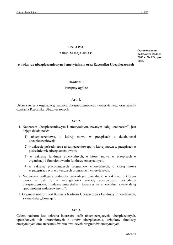 ©Kancelaria Sejmu s. 1/13 USTAWA Opracowano na podstawie: Dz.U. z 2003 r. Nr 124, poz. 1153. z dnia 22 maja 2003 r. o nadzorze ubezpieczeniowym i emerytalnym oraz Rzeczniku Ubezpieczonych Rozdział 1 Przepisy ogólne Art. 1. Ustawa określa organizację nadzoru ubezpieczeniowego i emerytalnego oraz zasady działania Rzecznika Ubezpieczonych . Art. 2. 1. Nadzorem ubezpieczeniowym i emerytalnym, zwanym dalej „nadzorem”, jest objęta działalność: 1) ubezpieczeniowa, ubezpieczeniowej; o której mowa w przepisach o działalności 2) w zakresie pośrednictwa ubezpieczeniowego, o której mowa w przepisach o pośrednictwie ubezpieczeniowym; 3) w zakresie funduszy emerytalnych, o której mowa w przepisach o organizacji i funkcjonowaniu funduszy emerytalnych; 4) w zakresie pracowniczych programów emerytalnych, o której mowa w przepisach o pracowniczych programach emerytalnych. 2. Nadzorowi podlegają podmioty prowadzące działalność w zakresie, o którym mowa w ust. 1, w szczególności zakłady ubezpieczeń, pośrednicy ubezpieczeniowi, fundusze emerytalne i towarzystwa emerytalne, zwane dalej „podmiotami nadzorowanymi”. 3. Organem nadzoru jest Komisja Nadzoru Ubezpieczeń i Funduszy Emerytalnych, zwana dalej „Komisją”. Art. 3. Celem nadzoru jest ochrona interesów osób ubezpieczających, ubezpieczonych, uposażonych lub uprawnionych z umów ubezpieczenia, członków funduszy emerytalnych oraz uczestników pracowniczych programów emerytalnych. 03-08-20 ©Kancelaria Sejmu s. 2/13 Art. 4. 1. W celu realizacji ustawowych zadań Komisja współpracuje w szczególności z Komisją Nadzoru Bankowego, Komisją Papierów Wartościowych i Giełd, Prezesem Urzędu Ochrony Konkurencji i Konsumentów oraz z organami nadzoru ubezpieczeniowego lub emerytalnego innych państw. 2. Komisja współpracuje z Szefem Krajowego Centrum Informacji Kryminalnych w zakresie niezbędnym do realizacji jego zadań ustawowych. Art. 5. 1. Rzecznik Ubezpieczonych reprezentuje interesy osób ubezpieczających, ubezpieczonych, uposażonych lub uprawnionych z umów ubezpieczenia, członków funduszy emerytalnych i uczestników pracowniczych programów emerytalnych. 2. W celu realizacji ustawowych zadań Rzecznik Ubezpieczonych współpracuje w szczególności z krajowymi i zagranicznymi organizacjami konsumenckimi oraz z Rzecznikiem Praw Obywatelskich. Art. 6. 1. Rzecznik Ubezpieczonych posiada osobowość prawną. 2. Siedzibą Rzecznika Ubezpieczonych jest Warszawa. Rozdział 2 Organizacja i zasady działania Komisji Art. 7. 1. Komisja jest centralnym organem administracji rządowej. 2. Nadzór nad Komisją sprawuje minister właściwy do spraw instytucji finansowych. Art. 8. 1. Zadaniem Komisji jest: 1) podejmowanie określonych w odrębnych przepisach działań mających na celu zapewnienie zgodności działalności podmiotów nadzorowanych z przepisami prawa; 2) kontrola działalności i stanu majątkowego podmiotów nadzorowanych; 3) podejmowanie innych zadań określonych ustawami. 2. Zakres nadzoru i szczegółowe zadania Komisji określają odrębne przepisy. 03-08-20 ©Kancelaria Sejmu s. 3/13 Art. 9. 1. W skład Komisji wchodzą: 1) Przewodniczący Komisji powoływany przez Prezesa Rady Ministrów na wspólny wniosek ministra właściwego do spraw instytucji finansowych i ministra właściwego do spraw zabezpieczenia społecznego - na pięcioletnią kadencję; 2) zastępcy Przewodniczącego Komisji - przedstawiciele wyznaczeni przez: a) ministra właściwego do spraw instytucji finansowych, b) ministra właściwego do spraw zabezpieczenia społecznego; 3) Przewodniczący Komisji Papierów Wartościowych i Giełd albo wyznaczony przez niego zastępca przewodniczącego; 4) Prezes Urzędu Ochrony Konkurencji i Konsumentów albo wyznaczony przez niego wiceprezes. 2. W posiedzeniu Komisji, z głosem doradczym, uczestniczą: przedstawiciel Prezydenta Rzeczypospolitej Polskiej, Rzecznik Ubezpieczonych oraz Generalny Inspektor Nadzoru Bankowego. Art. 10. 1. Przewodniczącym Komisji może być osoba posiadająca: 1) wyłącznie obywatelstwo polskie; 2) wyższe wykształcenie prawnicze, ekonomiczne lub matematyczne; 3) co najmniej czteroletnie doświadczenie w zakresie obejmującym funkcjonowanie sektora ubezpieczeń, funduszy emerytalnych, rynku kapitałowego lub sektora bankowego. 2. Przewodniczący Komisji może być odwołany przez Prezesa Rady Ministrów przed upływem kadencji z następujących przyczyn: 1) złożenia rezygnacji; 2) niewypełniania obowiązków na skutek długotrwałej choroby trwającej ponad 6 miesięcy, stwierdzonej orzeczeniem lekarskim; 3) rażącego naruszenia interesów osób ubezpieczających, ubezpieczonych, uposażonych lub uprawnionych z umów ubezpieczenia, członków funduszy emerytalnych lub uczestników pracowniczych programów emerytalnych; 4) rażącego naruszenia Konstytucji Rzeczypospolitej Polskiej lub ustaw; 5) skazania prawomocnym wyrokiem za umyślne przestępstwo. 3. W przypadku śmierci Przewodniczącego Komisji jego kadencja wygasa. 4. Ta sama osoba nie może być Przewodniczącym Komisji dłużej niż przez dwie kolejne kadencje. 5. Przewodniczący Komisji kieruje pracami Komisji i reprezentuje Komisję na zewnątrz. 03-08-20 ©Kancelaria Sejmu s. 4/13 Art. 11. 1. Komisja podejmuje rozstrzygnięcia, w tym wydaje decyzje i postanowienia określone w przepisach odrębnych, w drodze uchwały. 2. Uchwały podpisuje w imieniu Komisji Przewodniczący Komisji, a w przypadku jego nieobecności, upoważniony przez niego Zastępca Przewodniczącego Komisji. 3. Komisja podejmuje uchwały zwykłą większością głosów w obecności co najmniej trzech osób wchodzących w skład Komisji. 4. Szczegółową organizację i tryb pracy Komisji określa regulamin Komisji uchwalony przez Komisję. Art. 12. 1. Komisja może upoważnić Przewodniczącego Komisji, zastępców Przewodniczącego Komisji oraz pracowników Urzędu Komisji do podejmowania działań w zakresie właśc